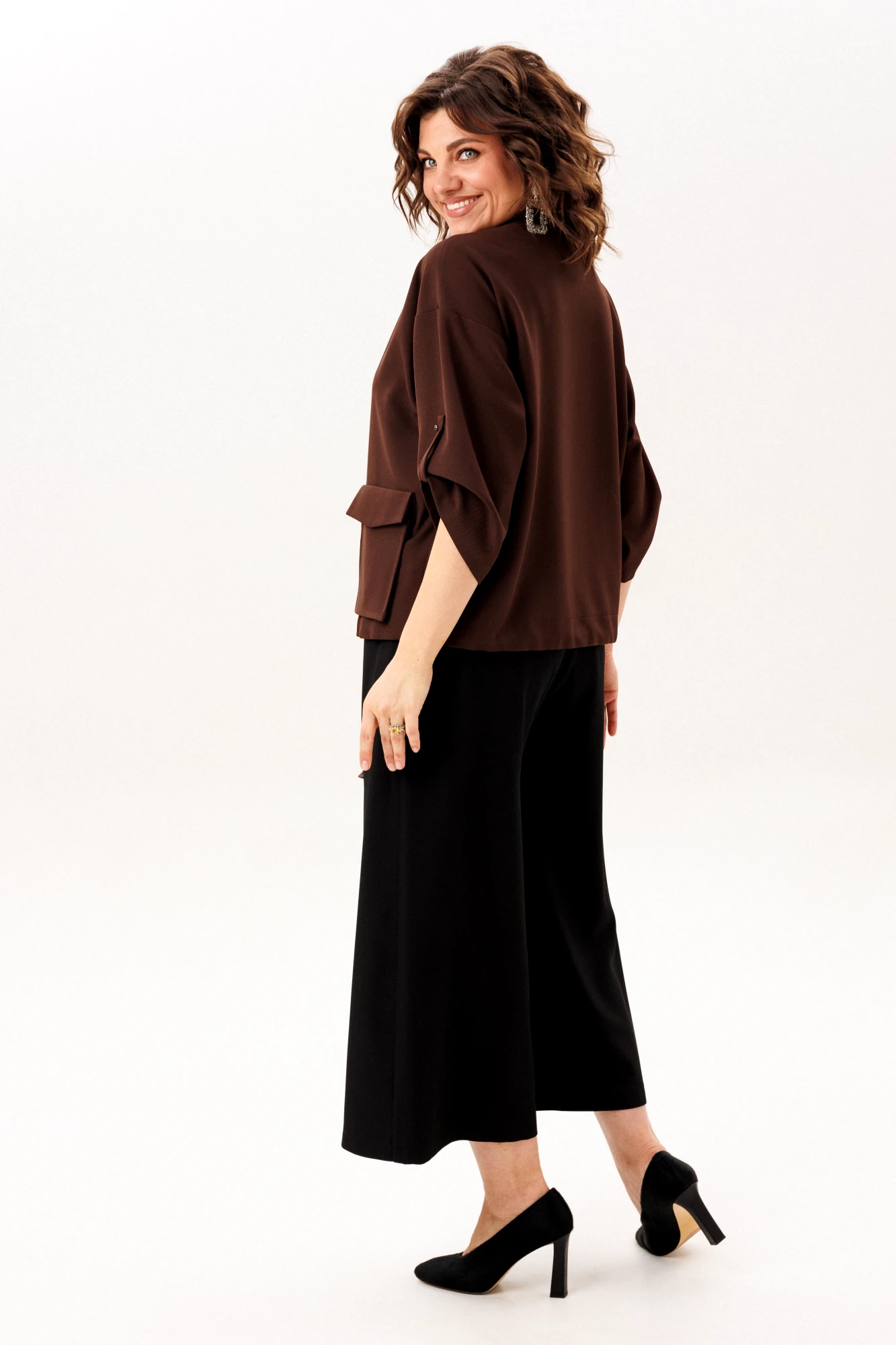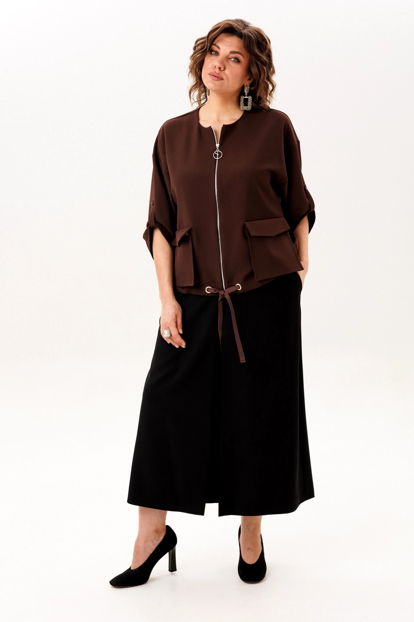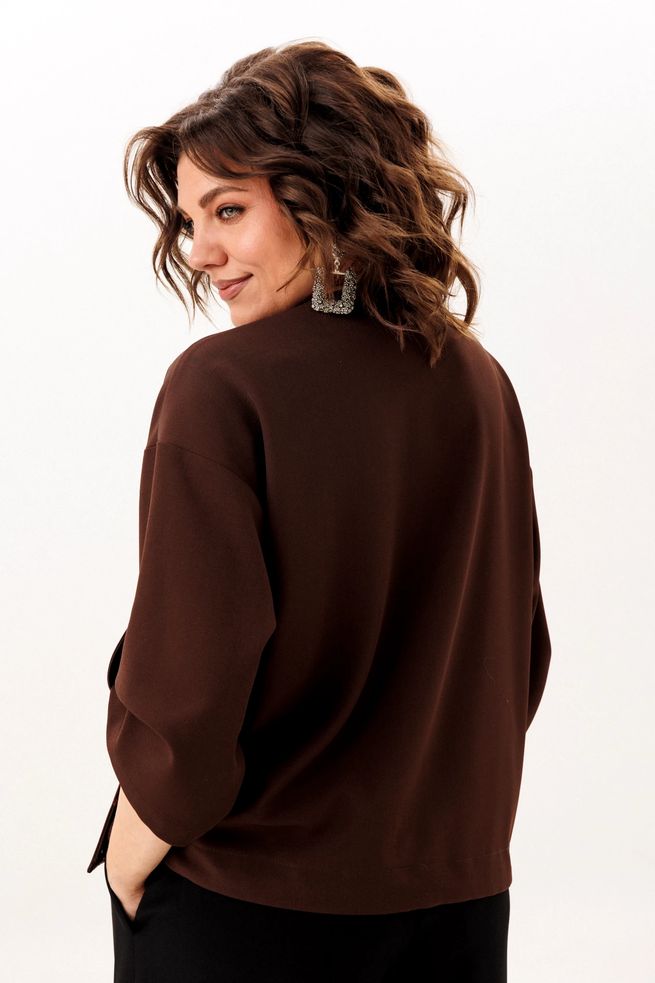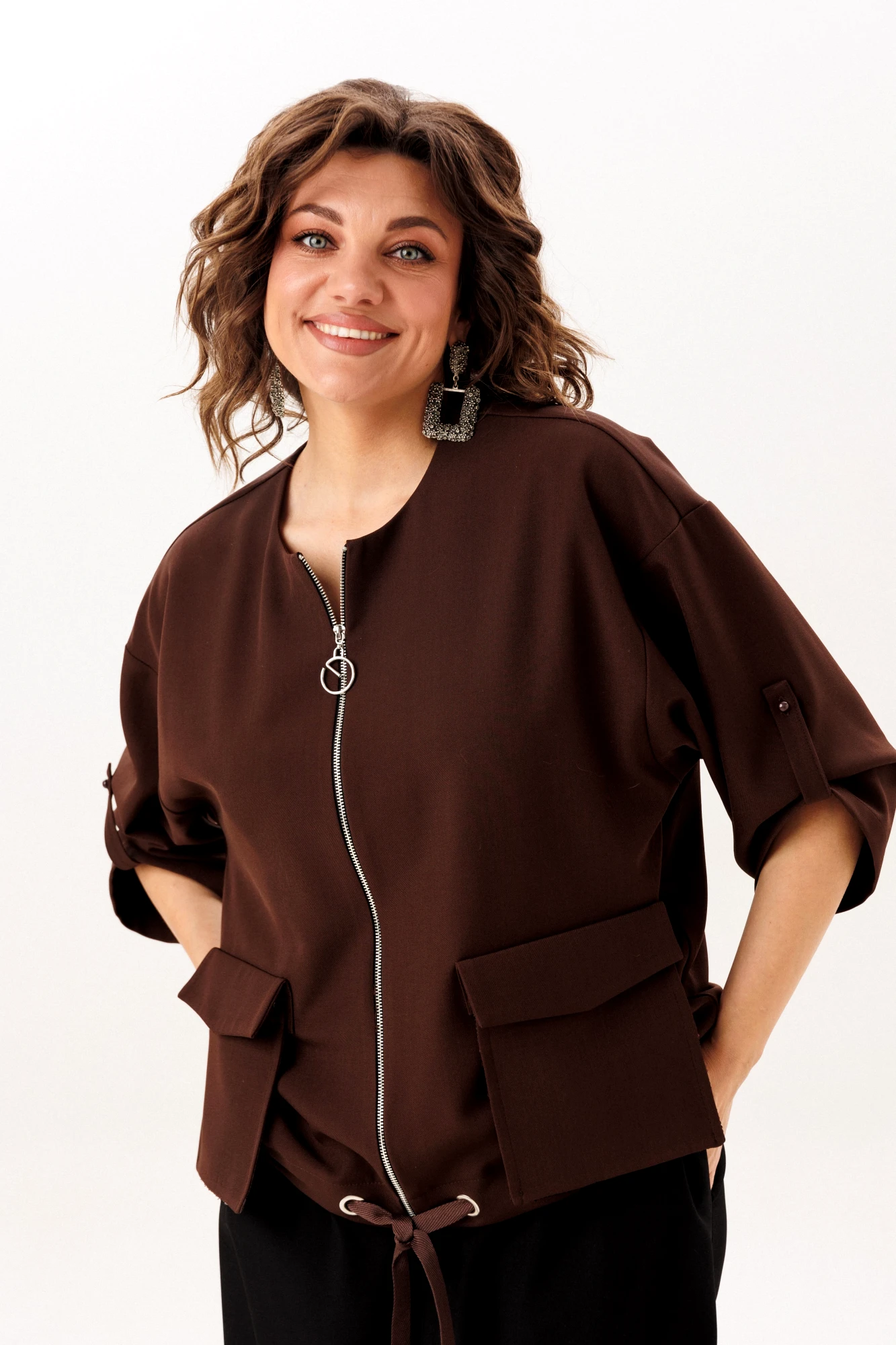 В этом джуте воплощена гармония сдержанной элегантности и современной функциональности. Прямой, ниспадающий силуэт со свободным, воздушным кроем дарит ощущение непринуждённого комфорта. Мягкая линия спущенного плеча плавно перетекает в лаконичный втачной рукав длиной три четверти, чью форму можно изящно зафиксировать на изящную пуговицу через тонкую петлю. Чистый круглый вырез горловины обрамляет лицо, подчеркивая строгость линий, которую лишь дополняют тонкие отделочные клапана.