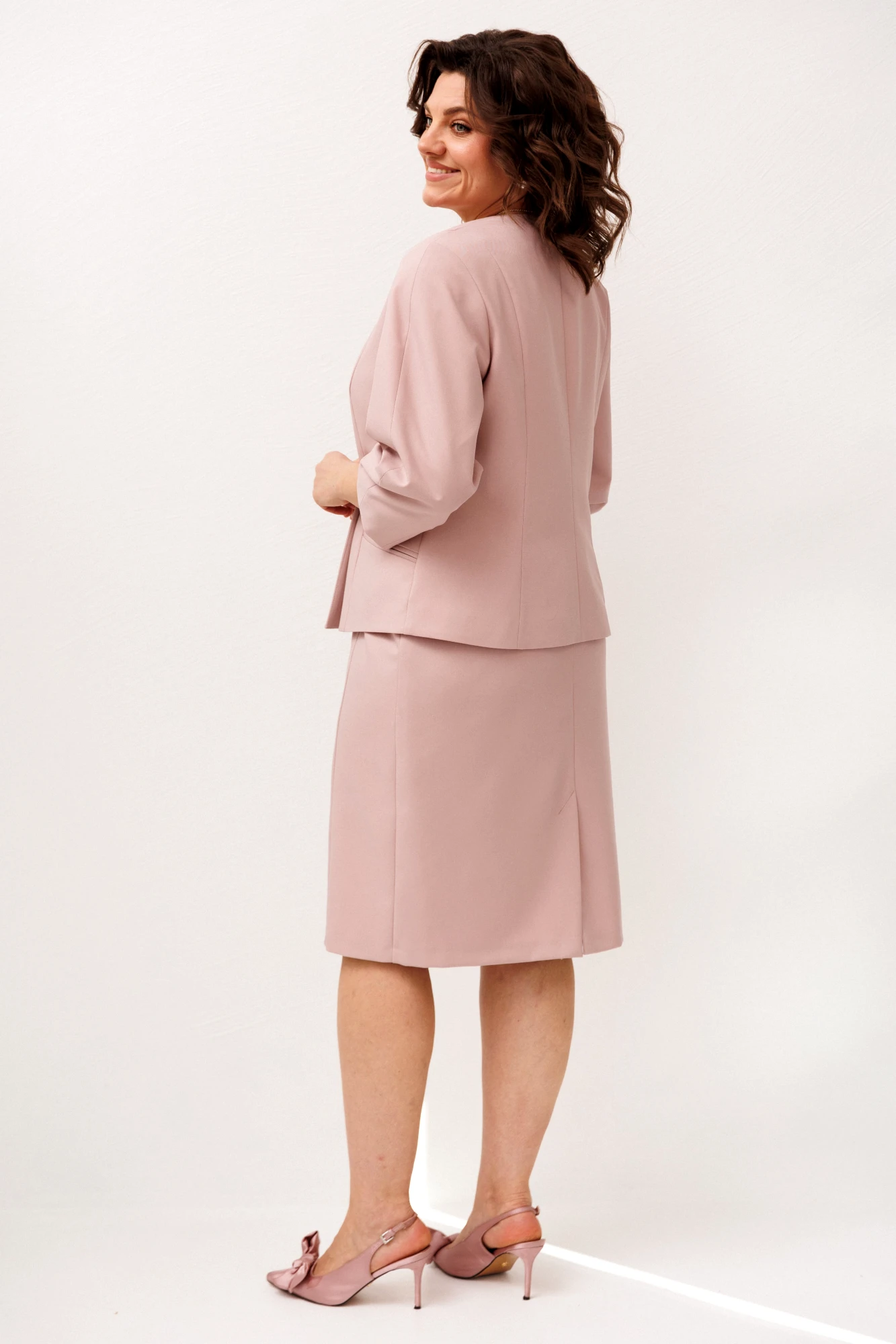 Жакет в нежном пудровом оттенке «розовая зарянка» словно наполняет образ лёгкостью и спокойной уверенностью. Полуприлегающий силуэт мягко подчеркивает линии фигуры, создавая аккуратный и женственный образ без излишней строгости, а V-образный вырез добавляет утончённости и визуальной лёгкости. Двубортная застёжка украшена красивенными золотыми пуговицами, которые деликатно притягивают взгляд и придают жакету благородное сияние, делая образ более выразительным и элегантным. Рельефы по спинке и полочке формируют изящную посадку, а прорезные карманы в рамку становятся лаконичным акцентом, подчеркивающим продуманность каждой детали.