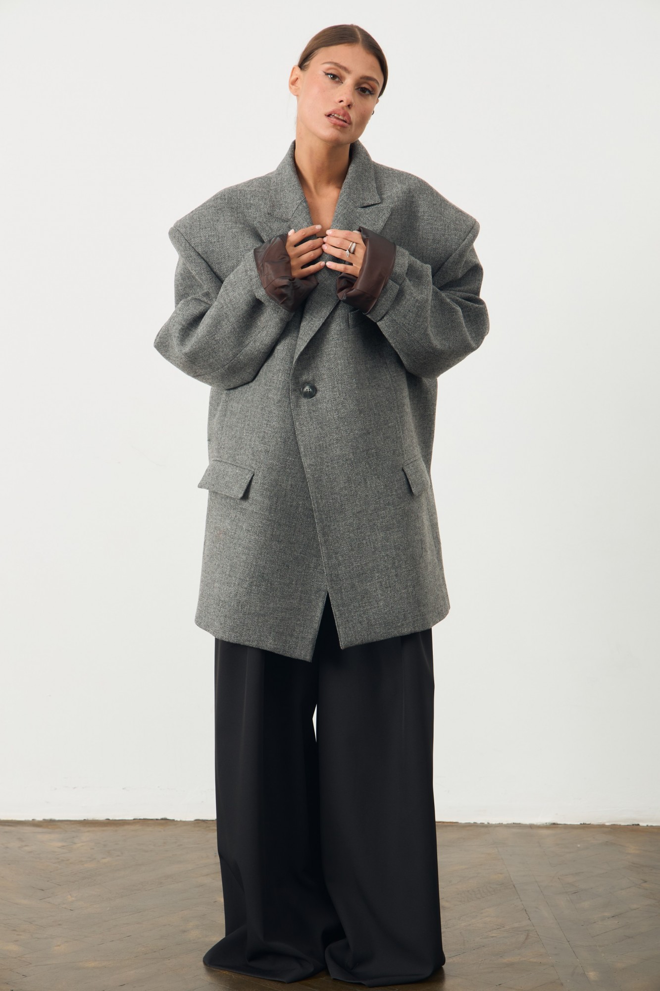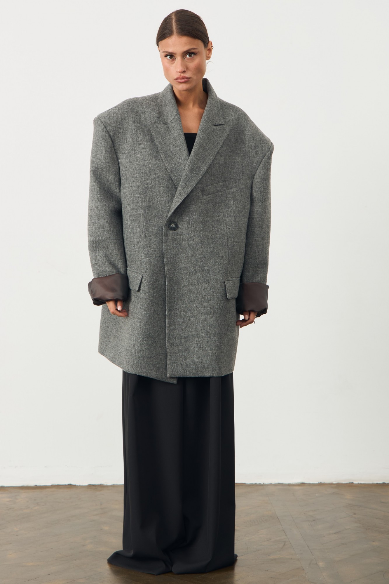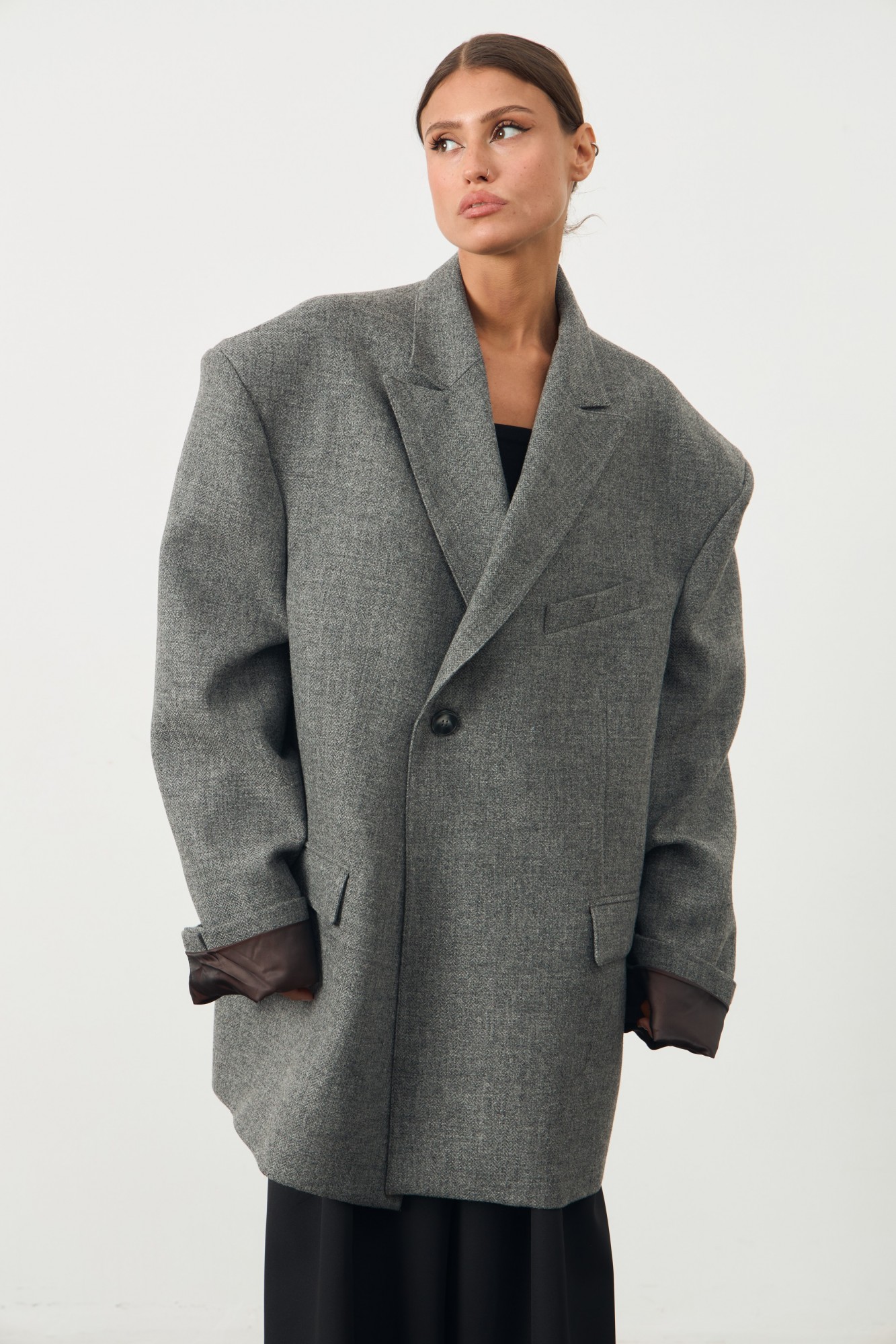 Onesize! Оверсайз жакет с удлиненной линией плеча. Застежка на пуговицу. По переду изделия карманы с листочкой. Жакет на подкладке.