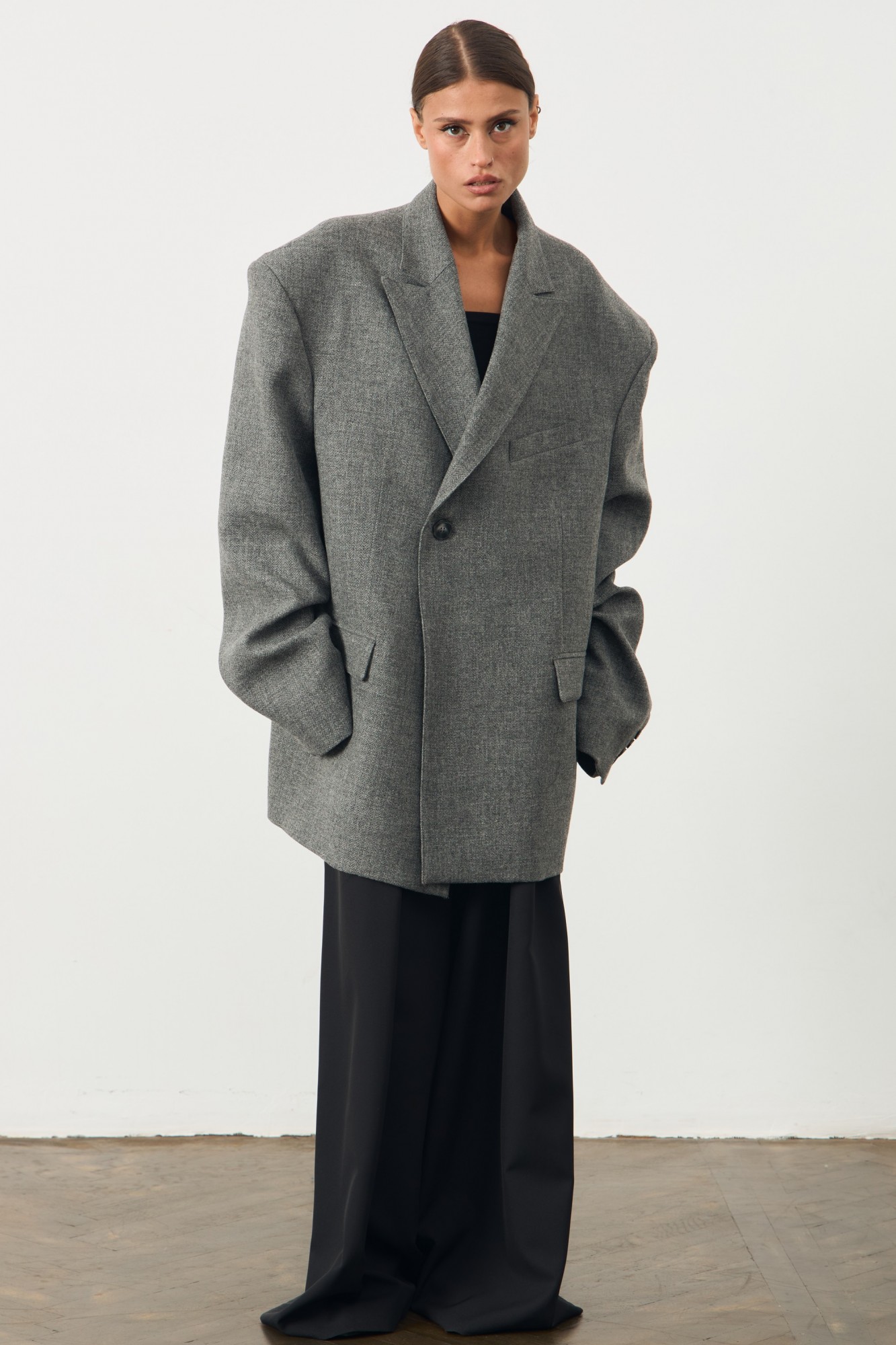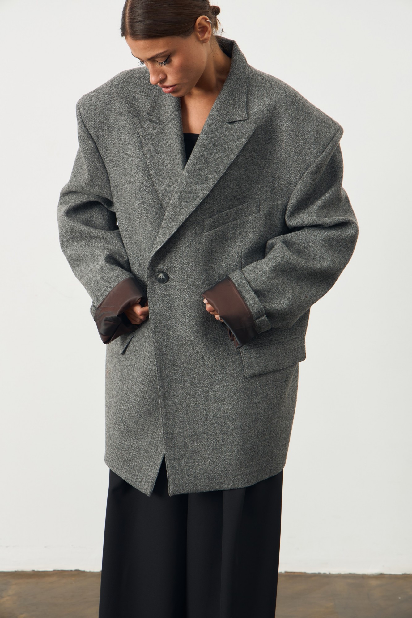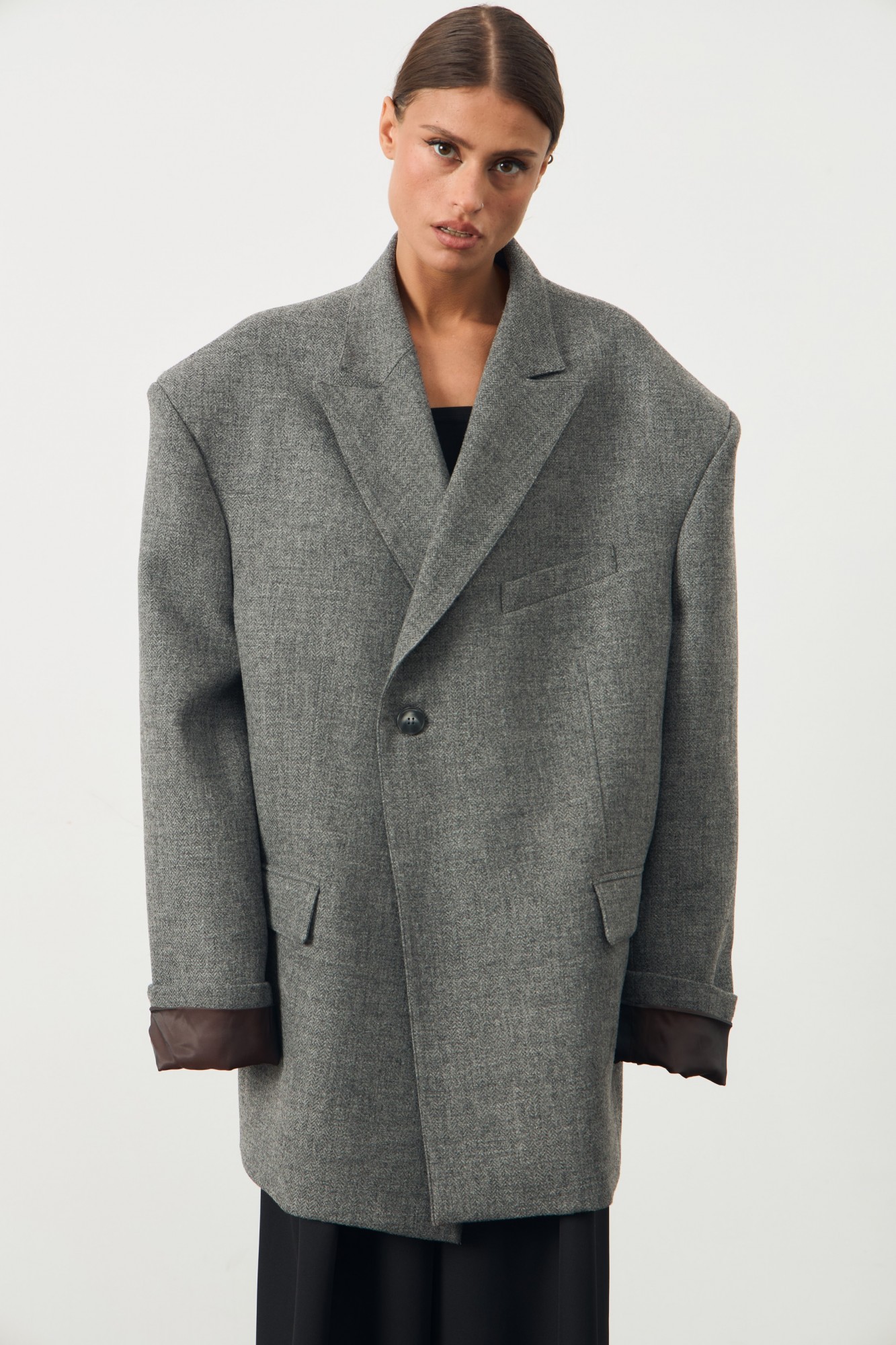 Onesize! Оверсайз жакет с удлиненной линией плеча. Застежка на пуговицу. По переду изделия карманы с листочкой. Жакет на подкладке.