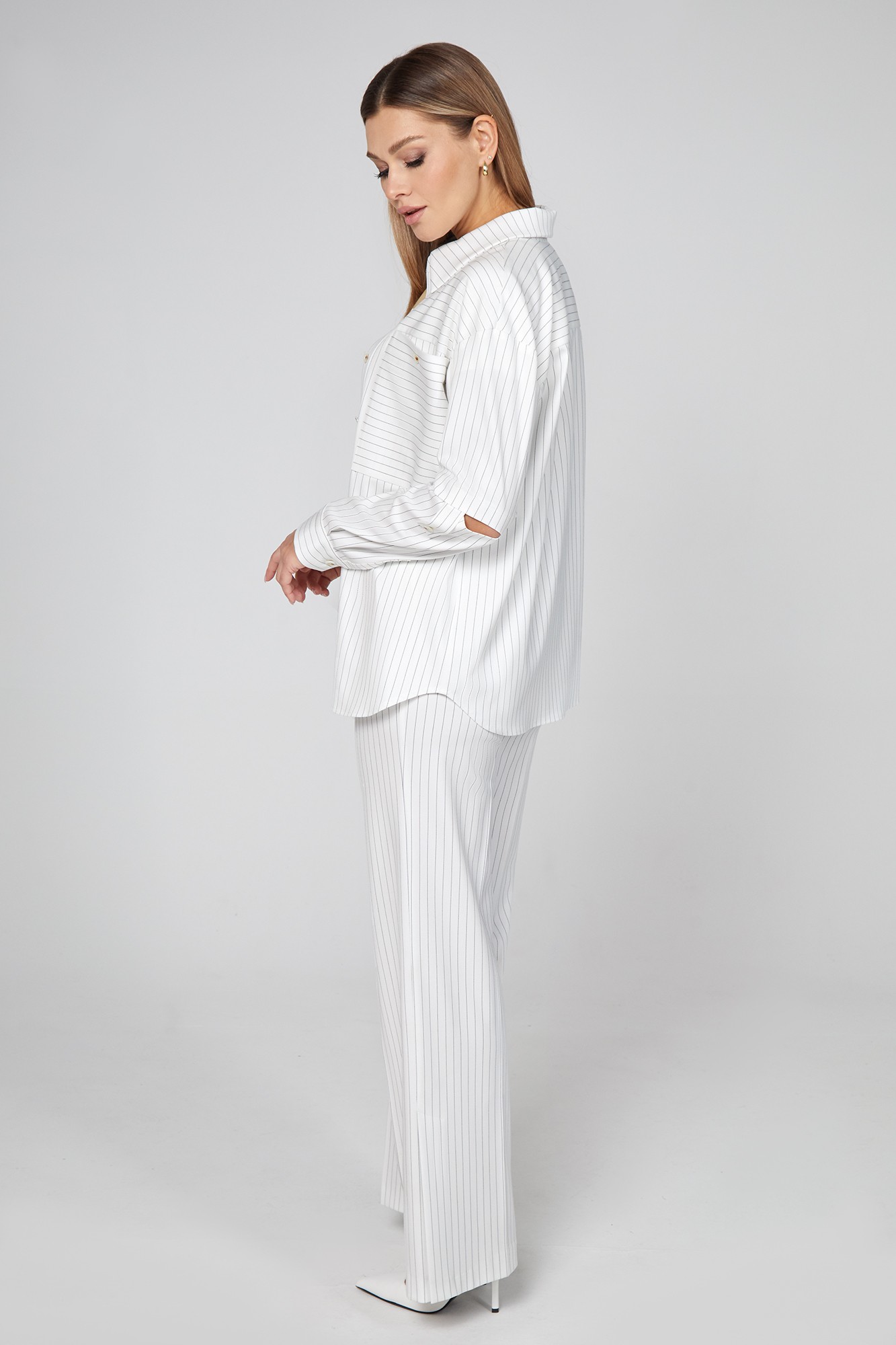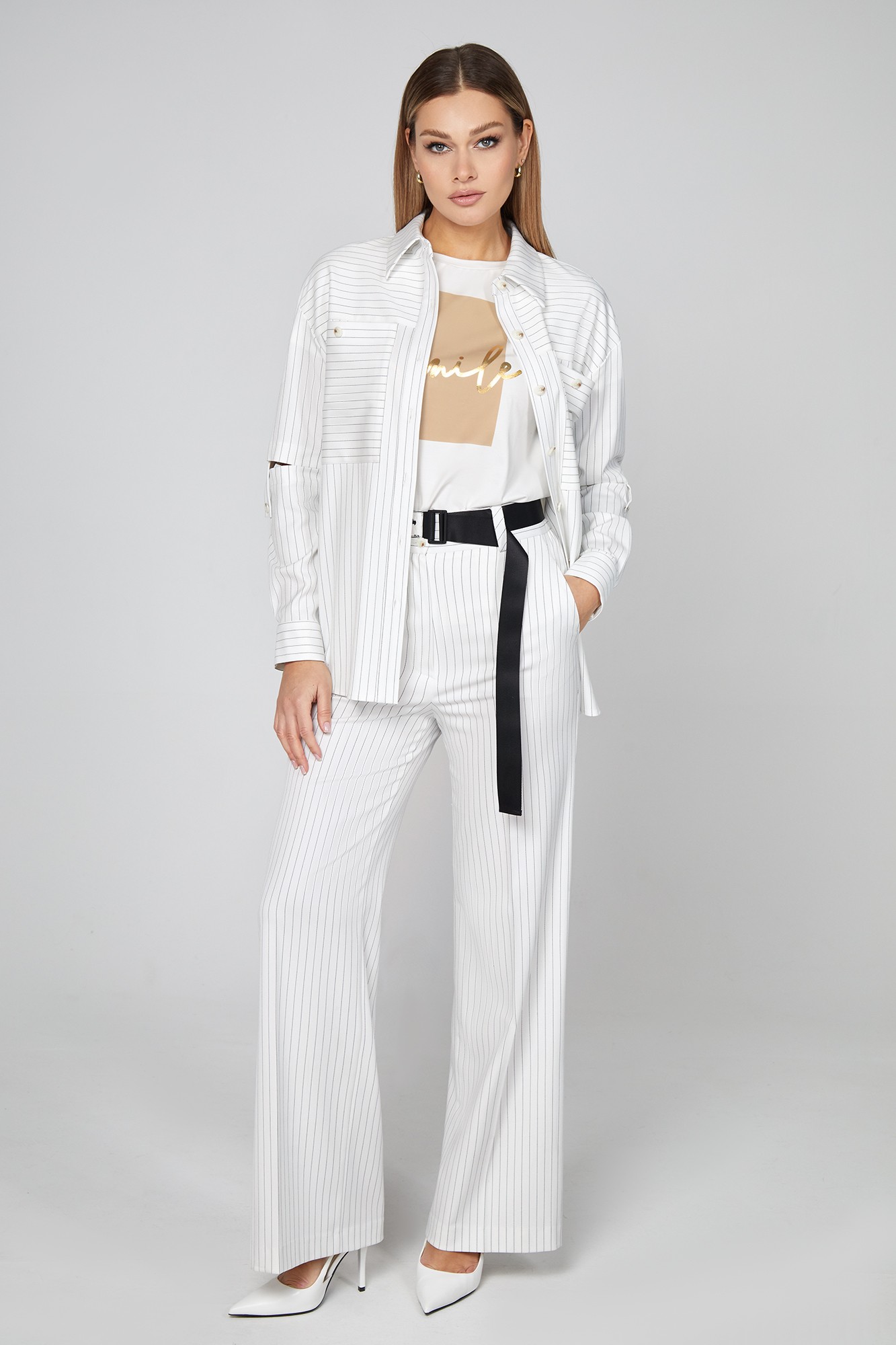 Блузка свободного кроя выполнена из приятной светлой поливискозной ткани с узором в полоску, придающим модели динамичности. Изделие с отложным воротником-стойкой, застёжкой на петли-пуговицы, со спущенной линией плеча, с интересными рукавами с горизонтальными щелевидными разрезами, зафиксированными с помощью паты и пуговицы и дополнена нагрудными отделочными карманами. Сочетайте изделие с брюками из той же линейки для создания готового образа.