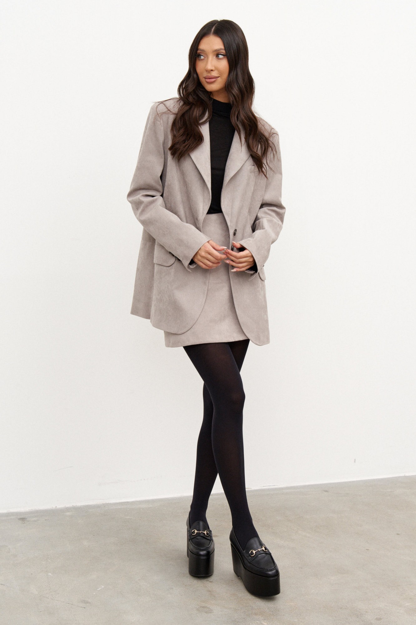 Жакет однобортный. Выполнен из эко-замши светло-коричневого цвета. Прямой крой, горизонтальный подрез ниже линии талии, подклад, разреза в спинке нет. Воротник с остроугольным лацканом. Застёжка контрастные петли-пуговицы. Карманы по переду внизу с клапаном без застёжки (функциональные), по груди карман-листочка (нефункциональный). Рукав втачной, на рукаве контрастные петли-пуговицы (нефункциональные).