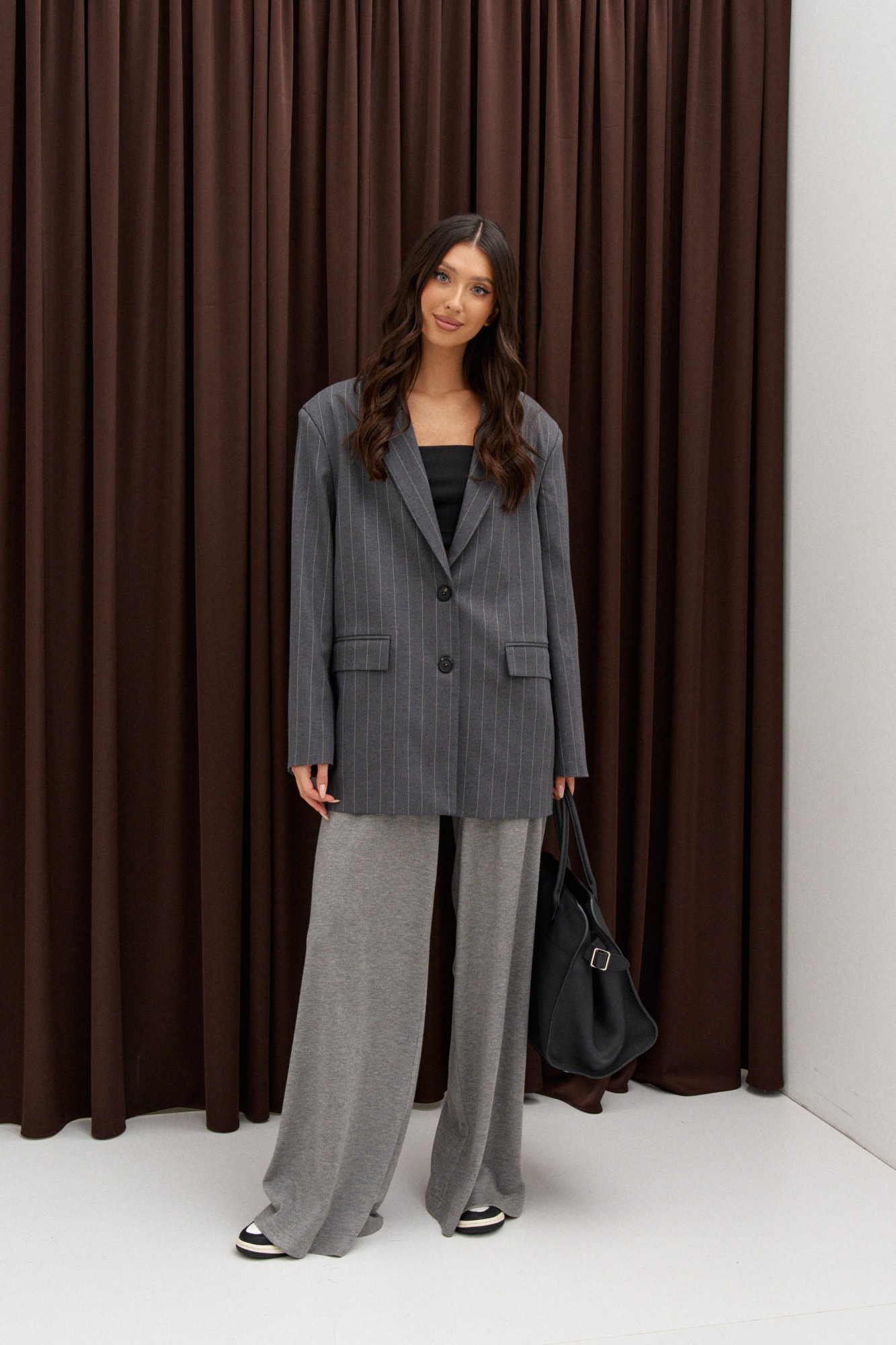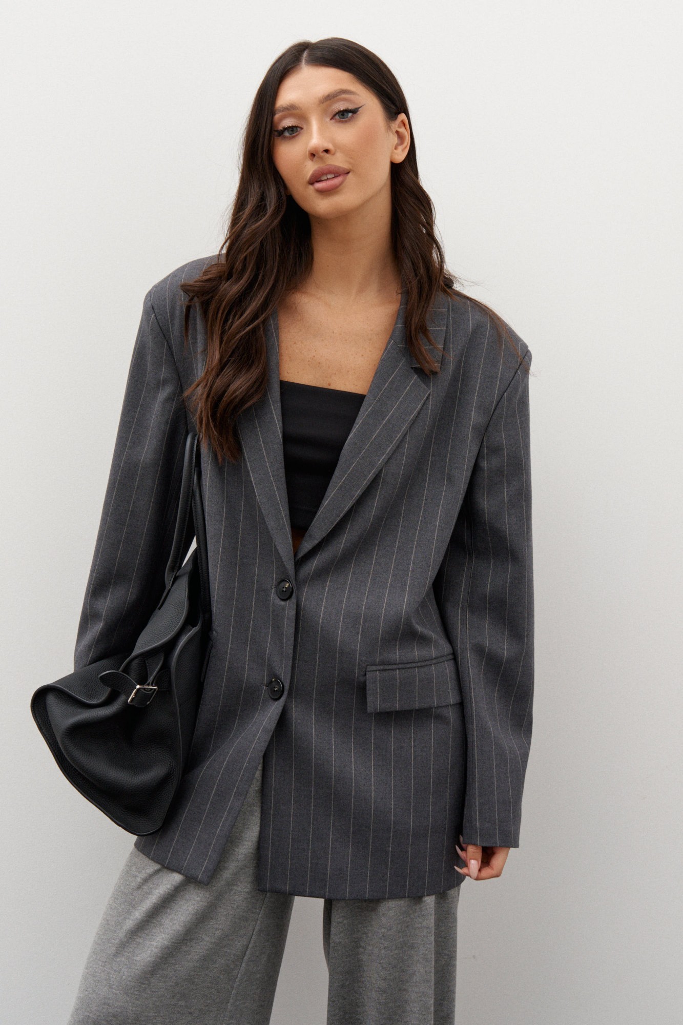 Жакет прямого свободного кроя выполнен из костюмной ткани серого цвета в тонкую полоску цвета. Характеристики: прямой свободный крой, подкладка, подплечники, воротник с остроугольным лацканом, застежка центральная на петлю - пуговицу, по переду функциональные карманы с клапаном, рукав втачной, по низу рукава нашиты пуговички, спинка со средним швом, в среднем шве лацкан 24 см.