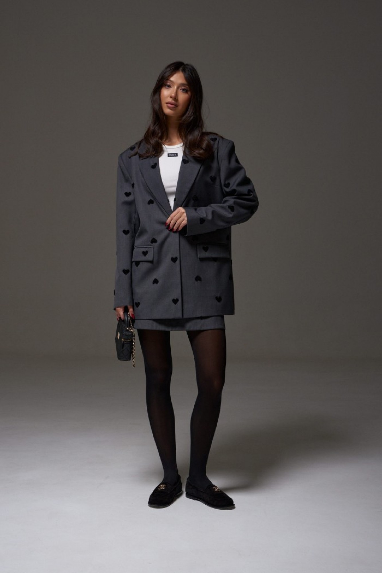 Жакет прямого свободного кроя выполнен из костюмной ткани серого цвета, декорированной черными сердечками. Характеристики: прямой свободный крой, брендированная подкладка, подплечники, воротник с остроугольным лацканом, застежка центральная на петлю - пуговицу, по переду функциональные карманы с клапаном, рукав втачной, по низу рукава нашиты пуговички, спинка со средним швом, в среднем шве разрез 24 см.