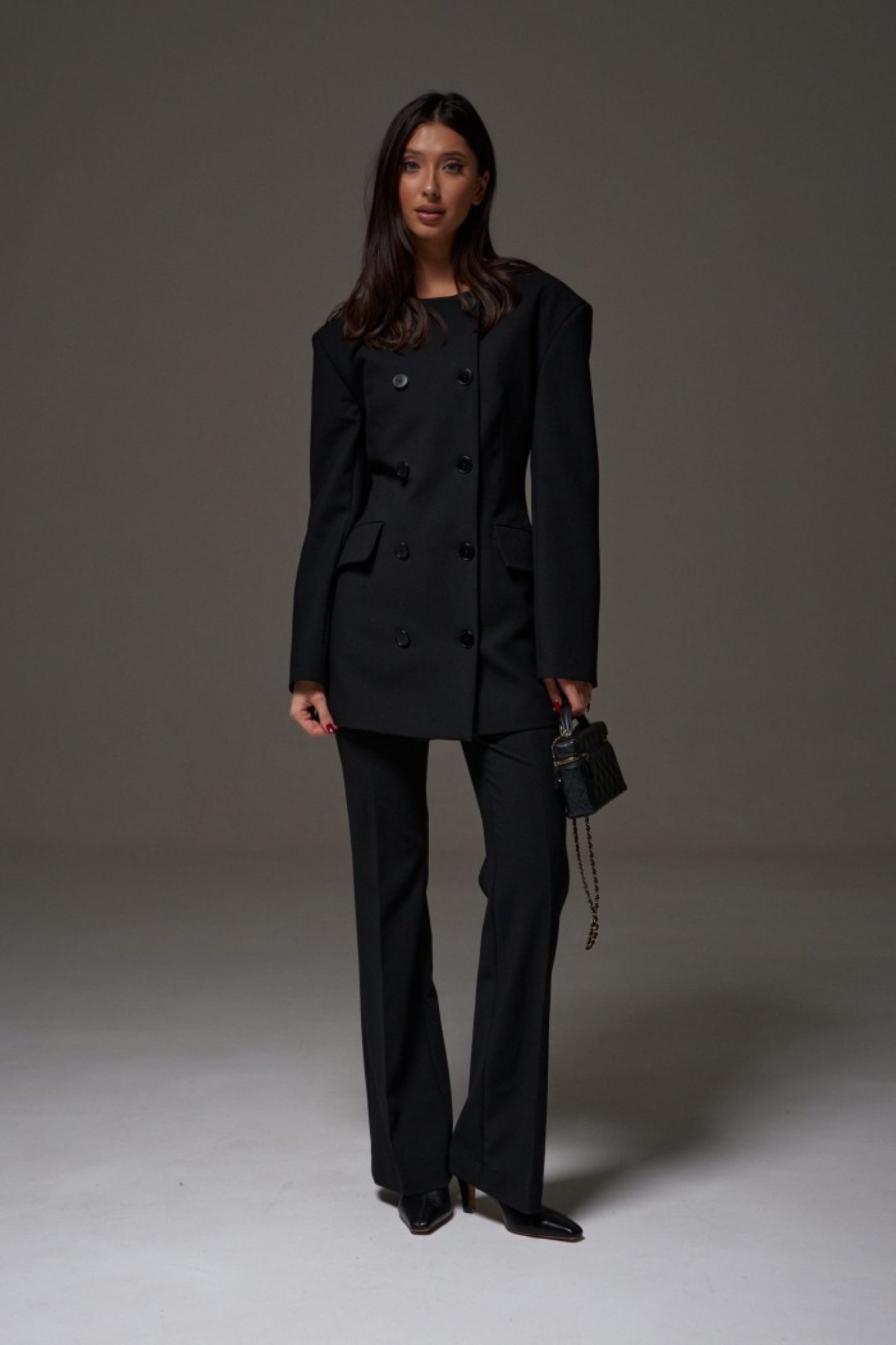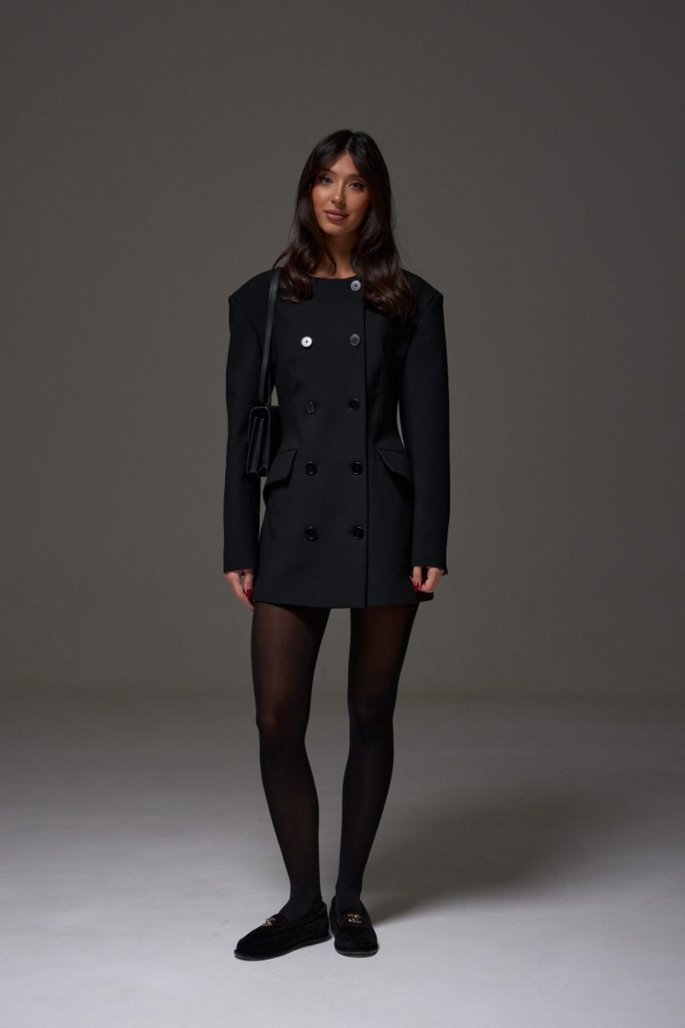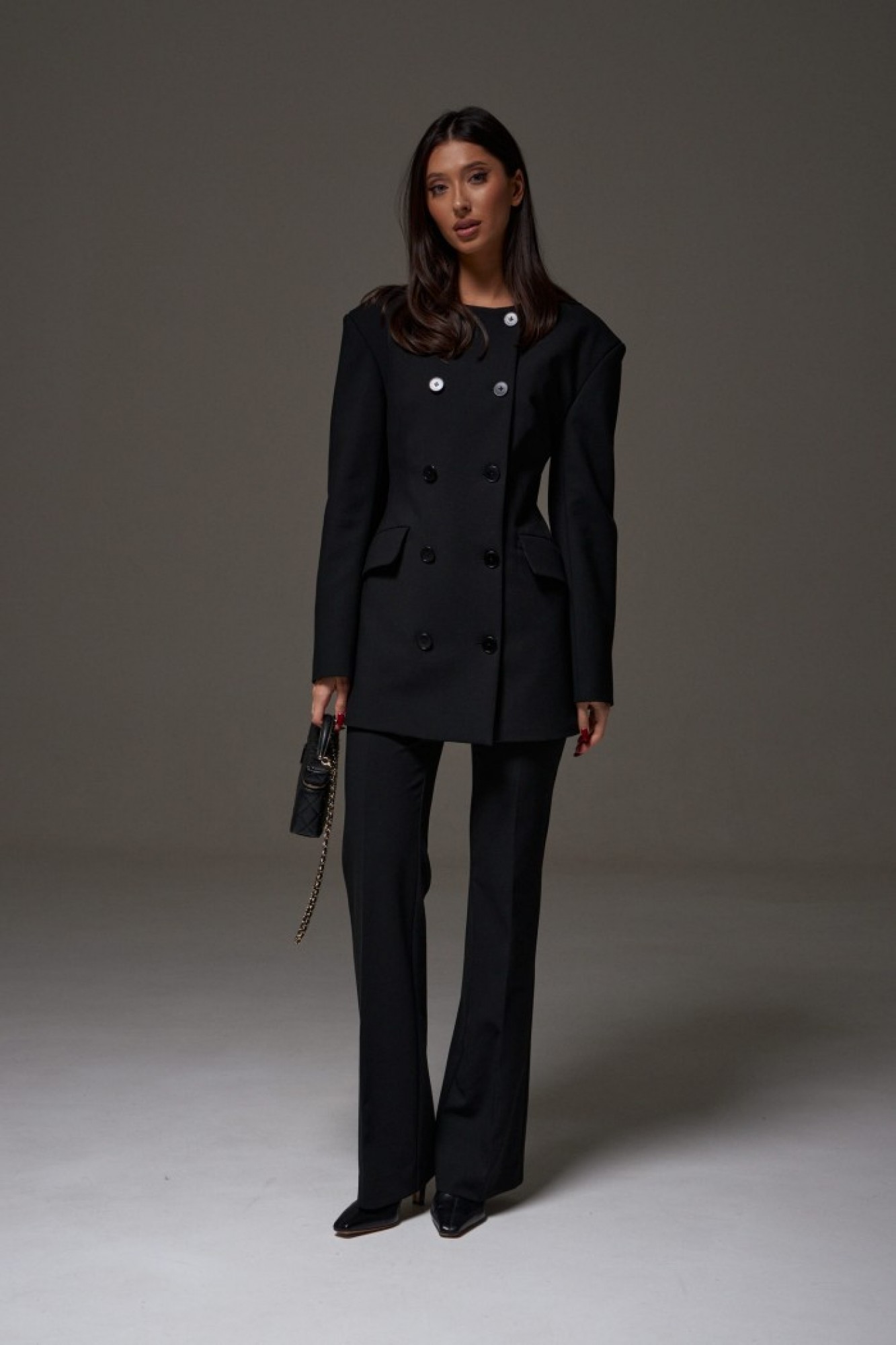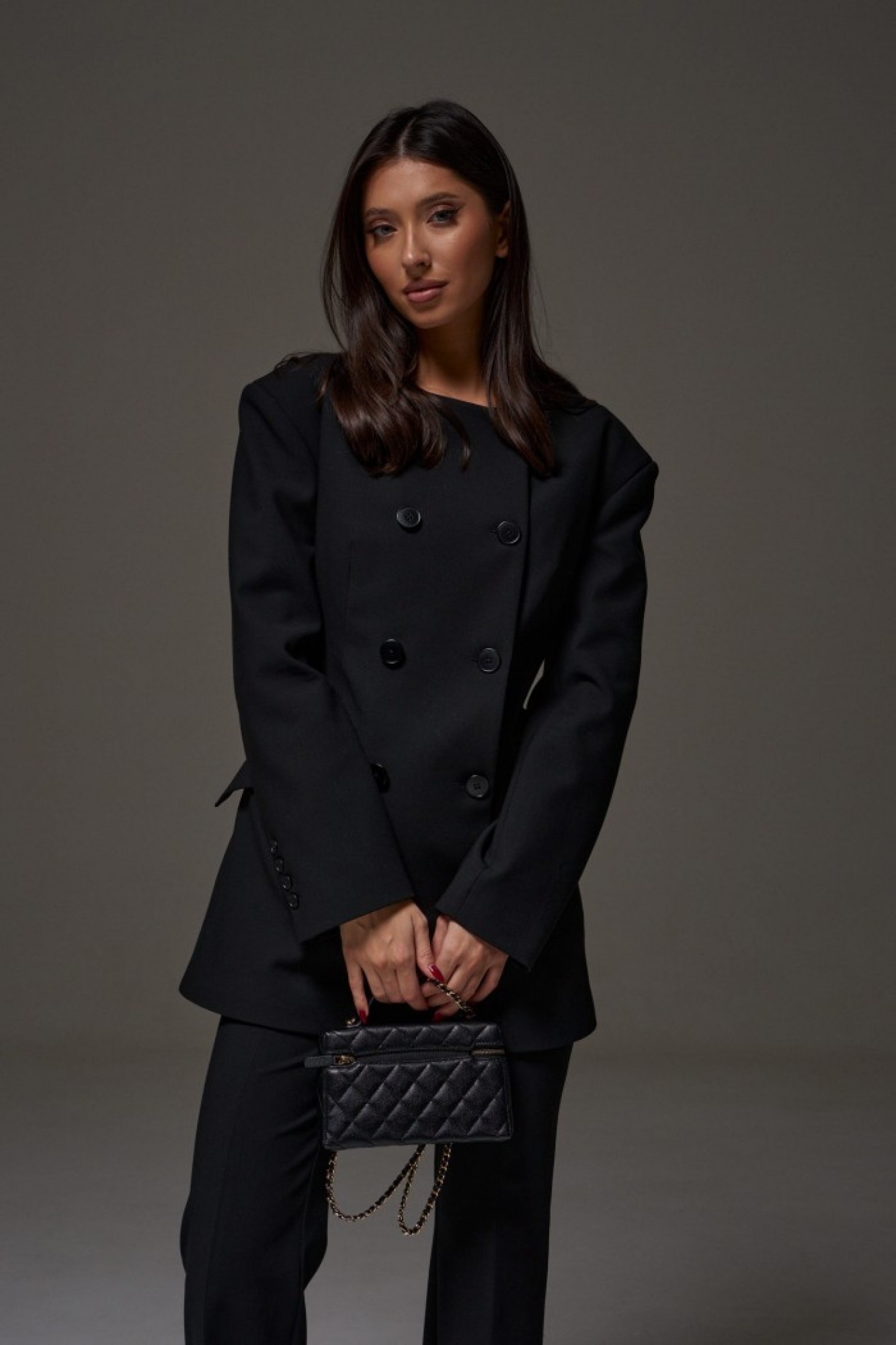 Жакет полуприталенного силуэта выполнен из текстильного полотна черного цвета. Характеристики: полуприталенный силуэт, двубортный, брендированная подкладка, подплечники, овальный вырез горловины, по переду функциональные карманы с клапаном, рукав втачной, по низу рукава нашиты пуговички.