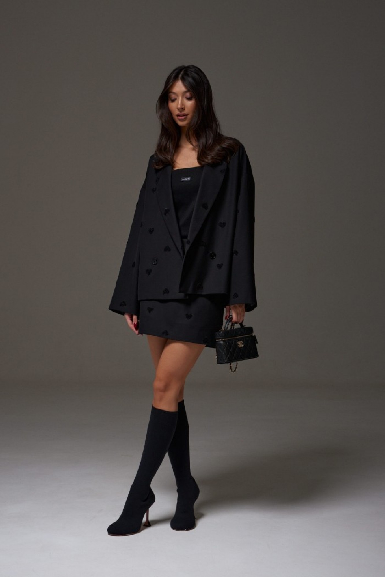 Жакет прямого кроя, выполнен из костюмной ткани черного цвета с шитьем в форме сердец. Характеристика: Жакет двубортный, подклад, воротник с остроугольным лацканом, в боковых швах изделия карманы, рукав спущенный, прямой.