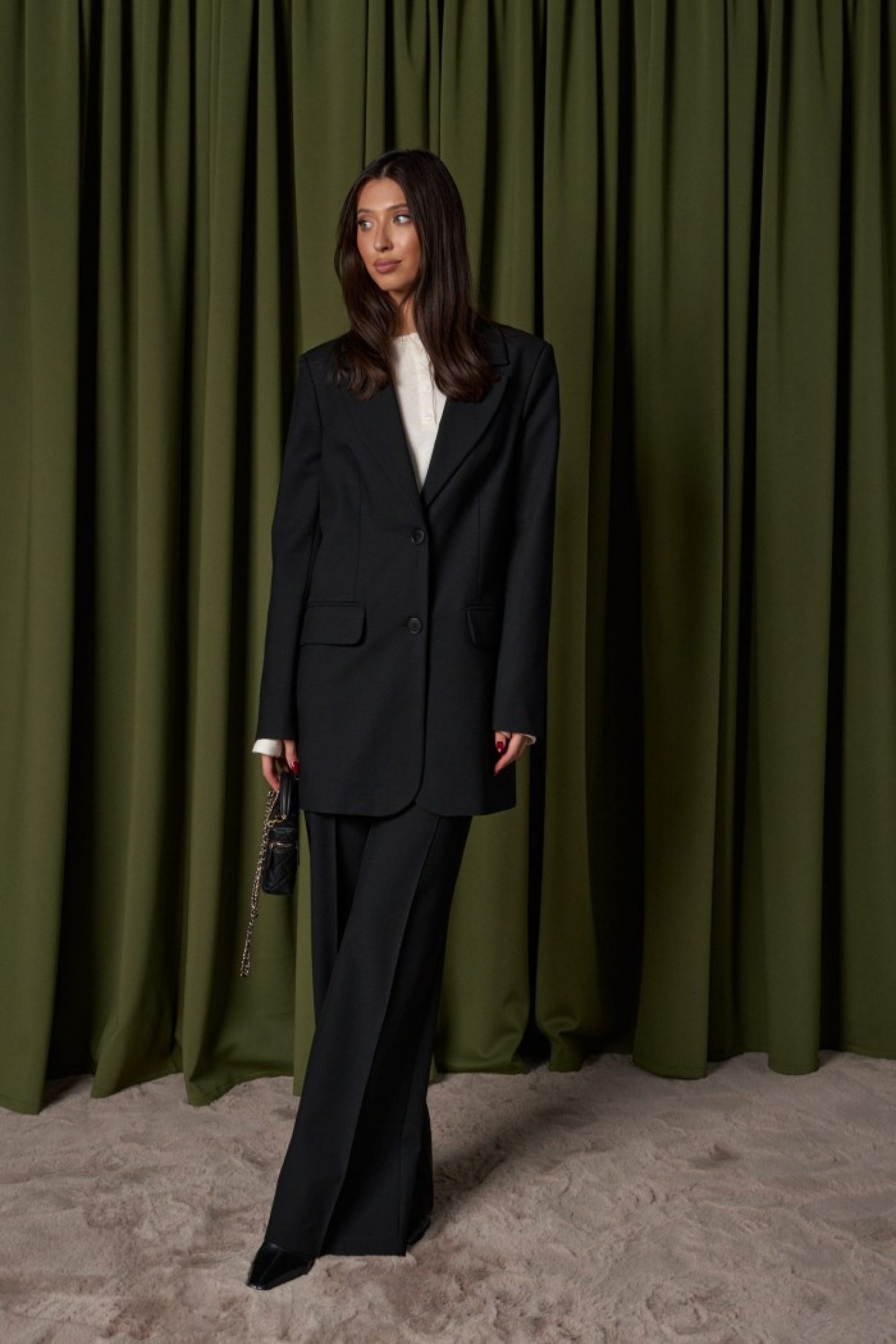 Жакет прямого свободного кроя. Выполнен из костюмной ткани чёрного цвета. С подкладкой. Воротник отложной, с лацканами. Рукав втачной. Есть подплечники. По переду карманы с клапанами. Застёжка центральная - пуговицы. Разреза и шлицы в жакете нет.