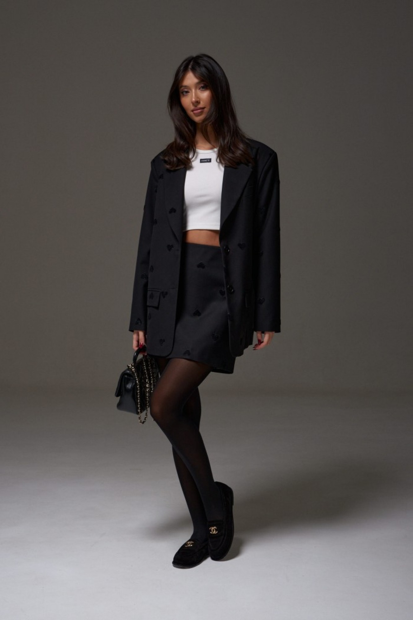 Жакет прямого свободного кроя выполнен из костюмной ткани черного цвета, декорированной черными сердечками. Характеристики: прямой свободный крой, брендированная подкладка, подплечники, воротник с остроугольным лацканом, застежка центральная на 2 петли - пуговицы, по переду функциональные карманы с клапаном, на груди прорезной карман обманка, рукав втачной, спинка со средним швом, в среднем шве разрез 16 см.