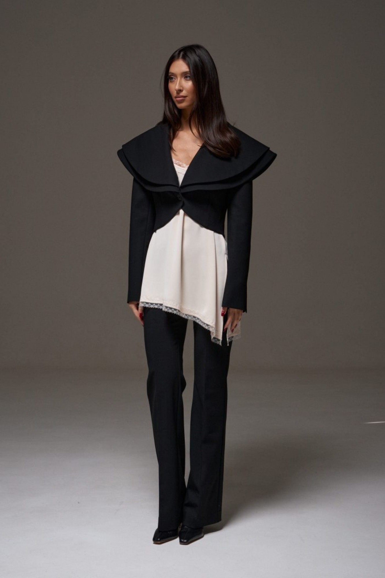 Жакет прямого кроя, выполнен из костюмной ткани черного цвета. Характеристика: двойной объемный воротник "шаль", застежка центральная на петлю - пуговицу, выточки, на подкладке, рукав втачной, по низу рукава нашиты пуговички.