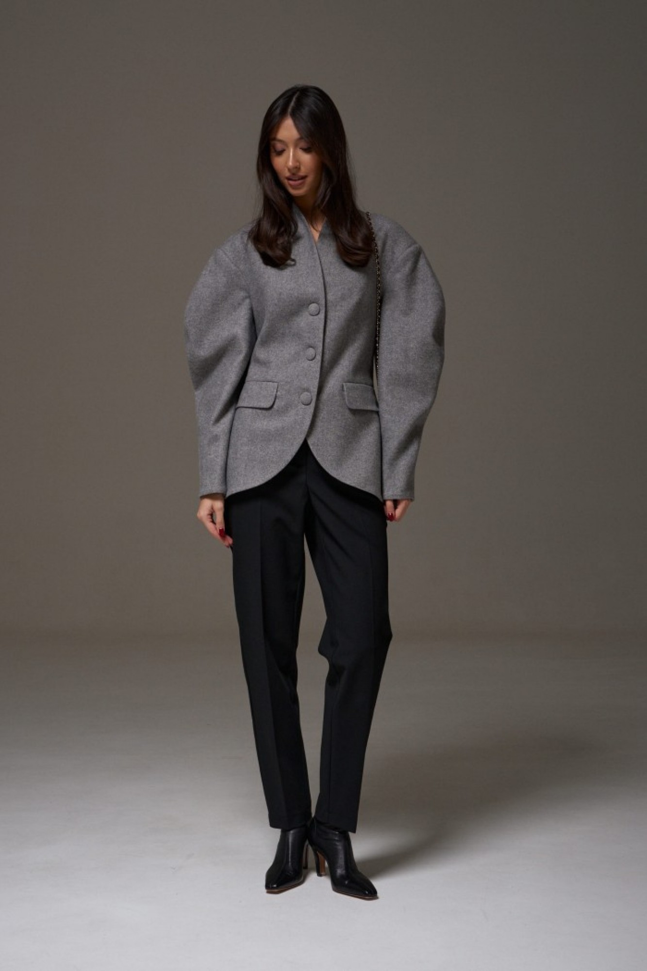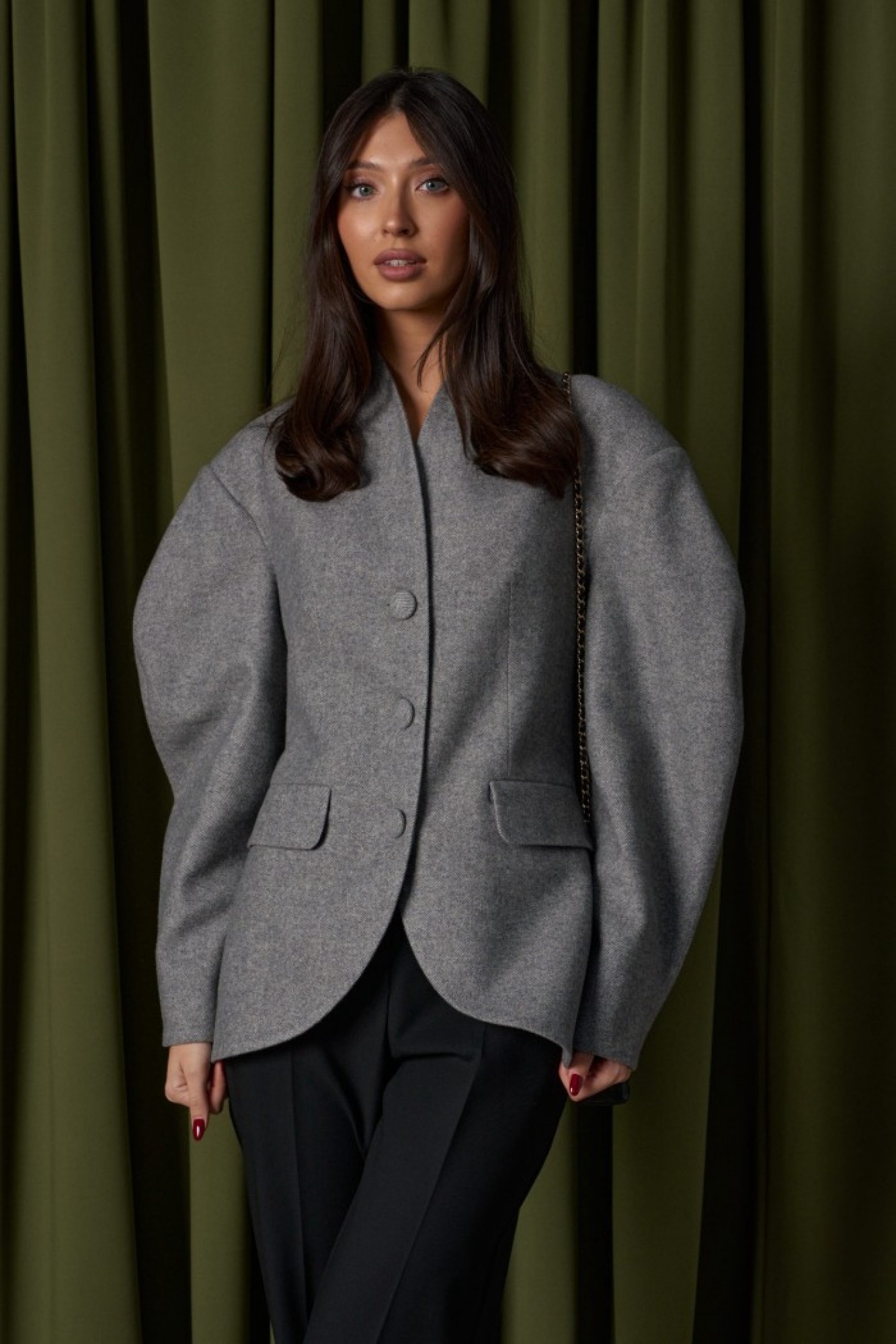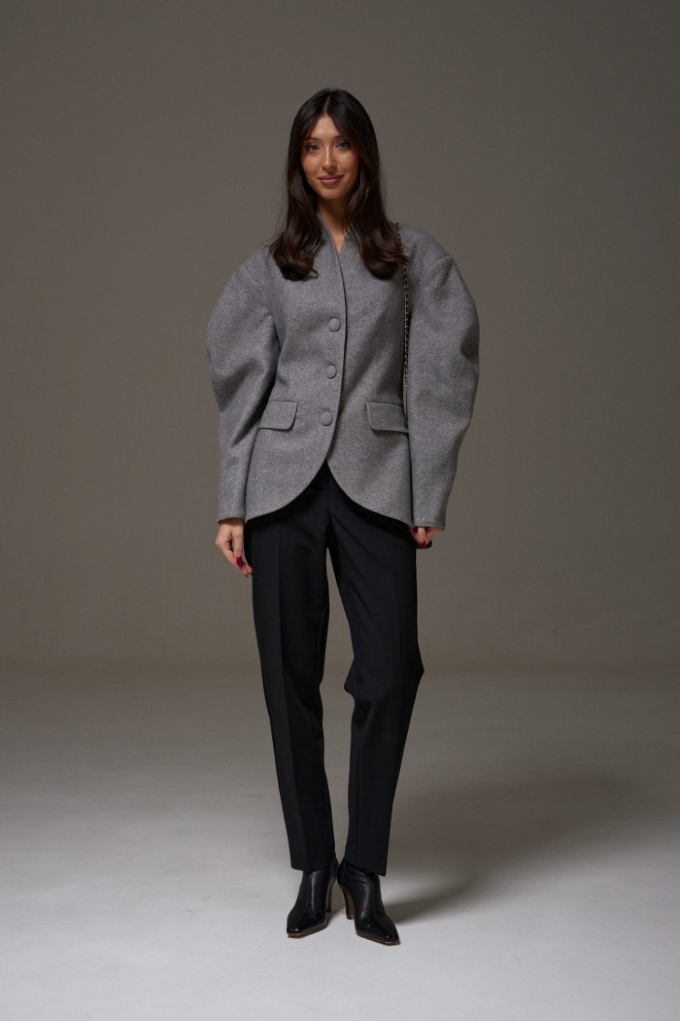 Жакет прилегающего силуэта. Выполнен из фактурного полотна серого цвета. С подкладкой. Воротник-стойка. Вырез горловины V-образный. Рукав втачной, объёмный, заужен к низу. По переду карманы с клапаном. Застёжка центральная - пуговицы. Низ жакета фигурный.