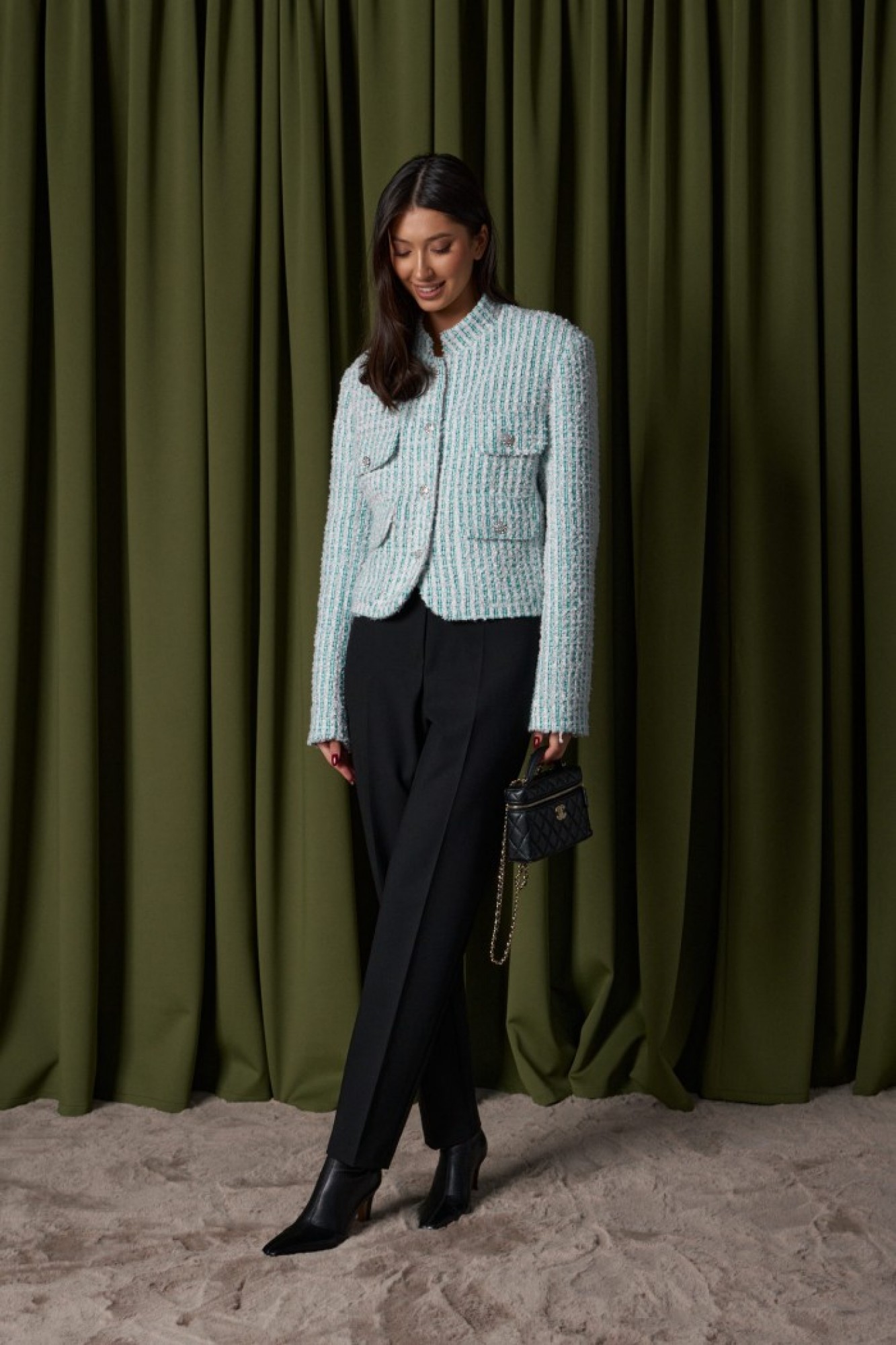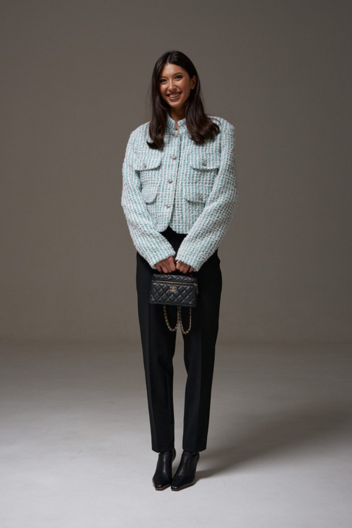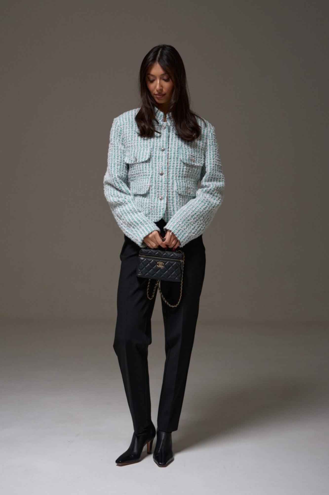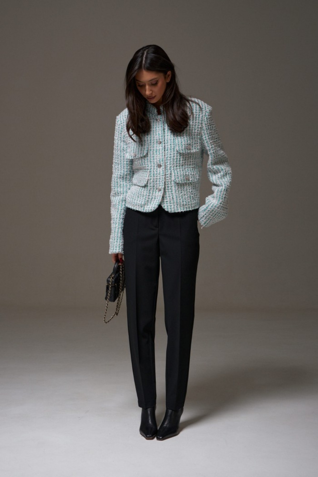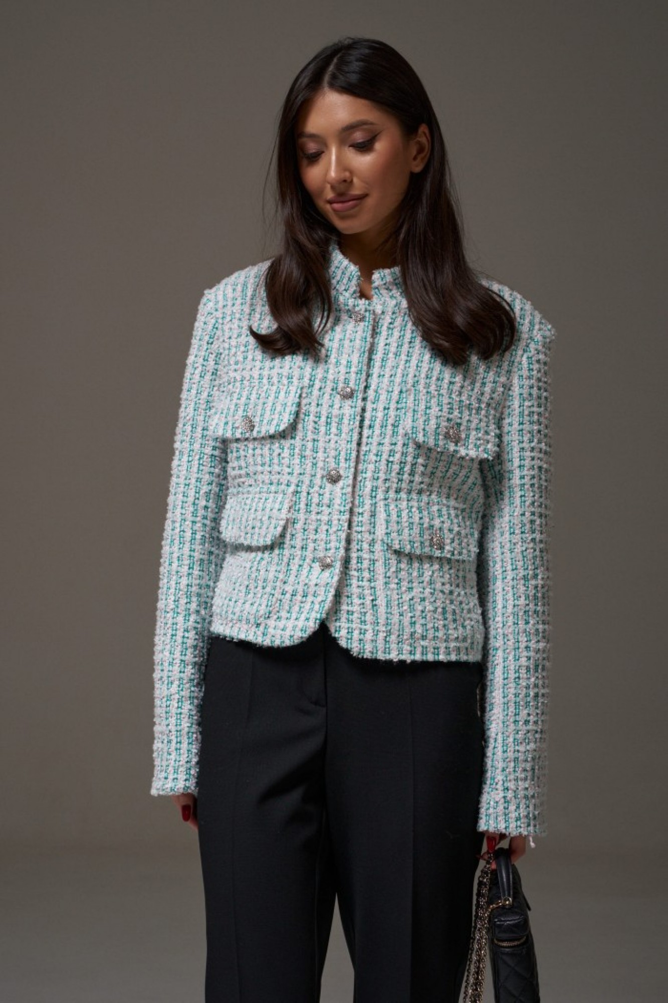 Жакет прямого свободного кроя, выполнен из фактурного твидового полотна. Характеристики: горловина стойка, застежка центральная на петли пуговицы, подплечники, рукав прямой, внутри брдендированная подкладка. На уровне линии груди декоративные карманы с клапаном, внизу накладные карманы с клапаном.