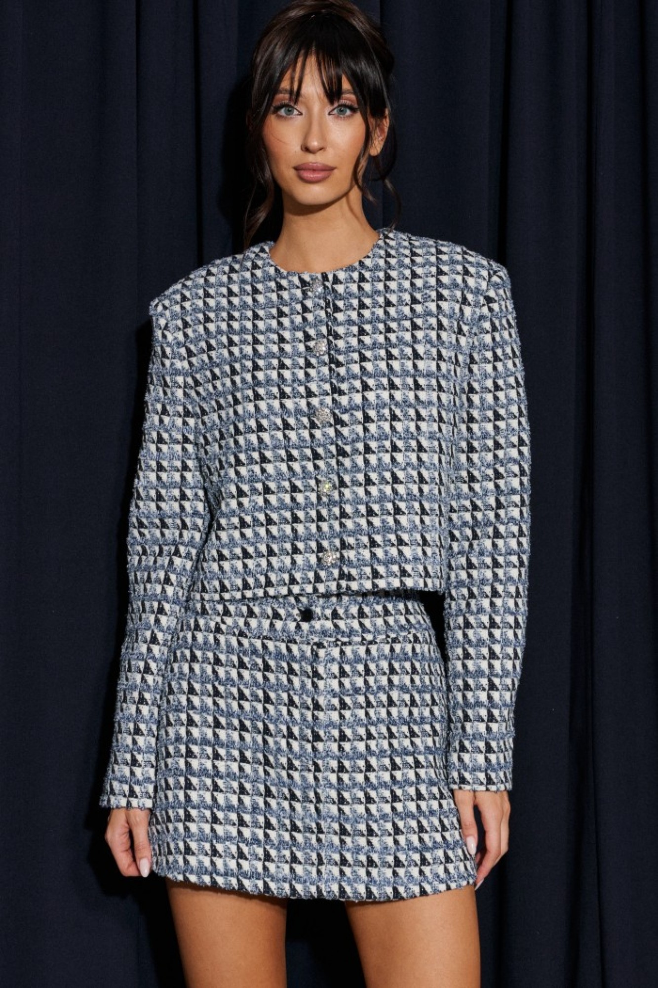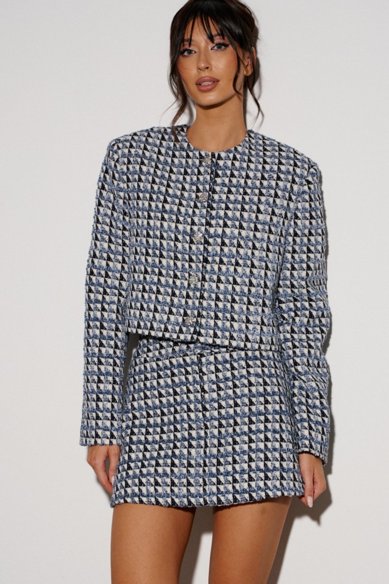 Жакет укороченный прямого свободного кроя выполнен из фактурного твидового полотна. Характеристики: брендированная подкладкой, горловина круглая, застёжка центральная - пуговицы, рукав втачной.