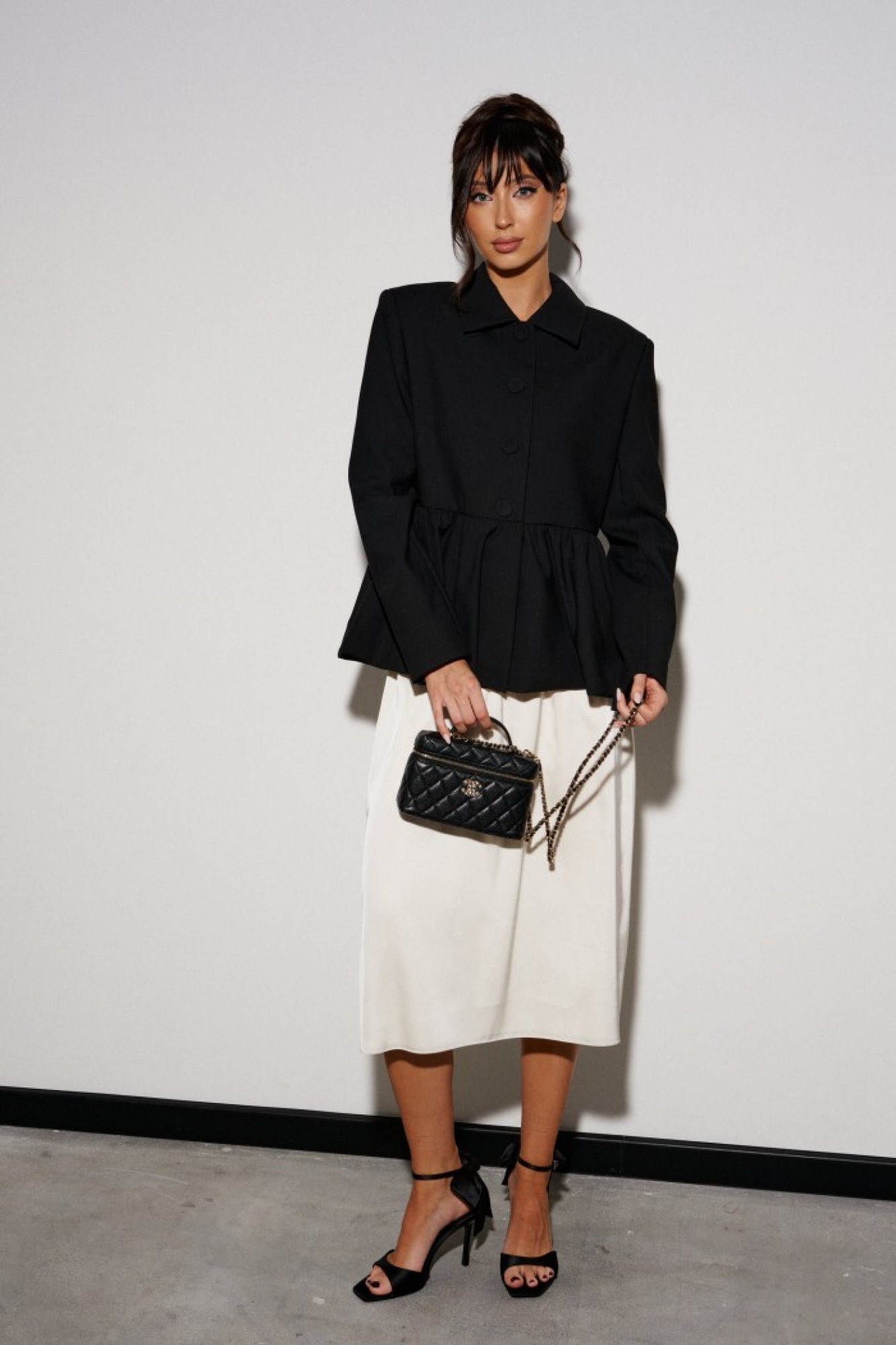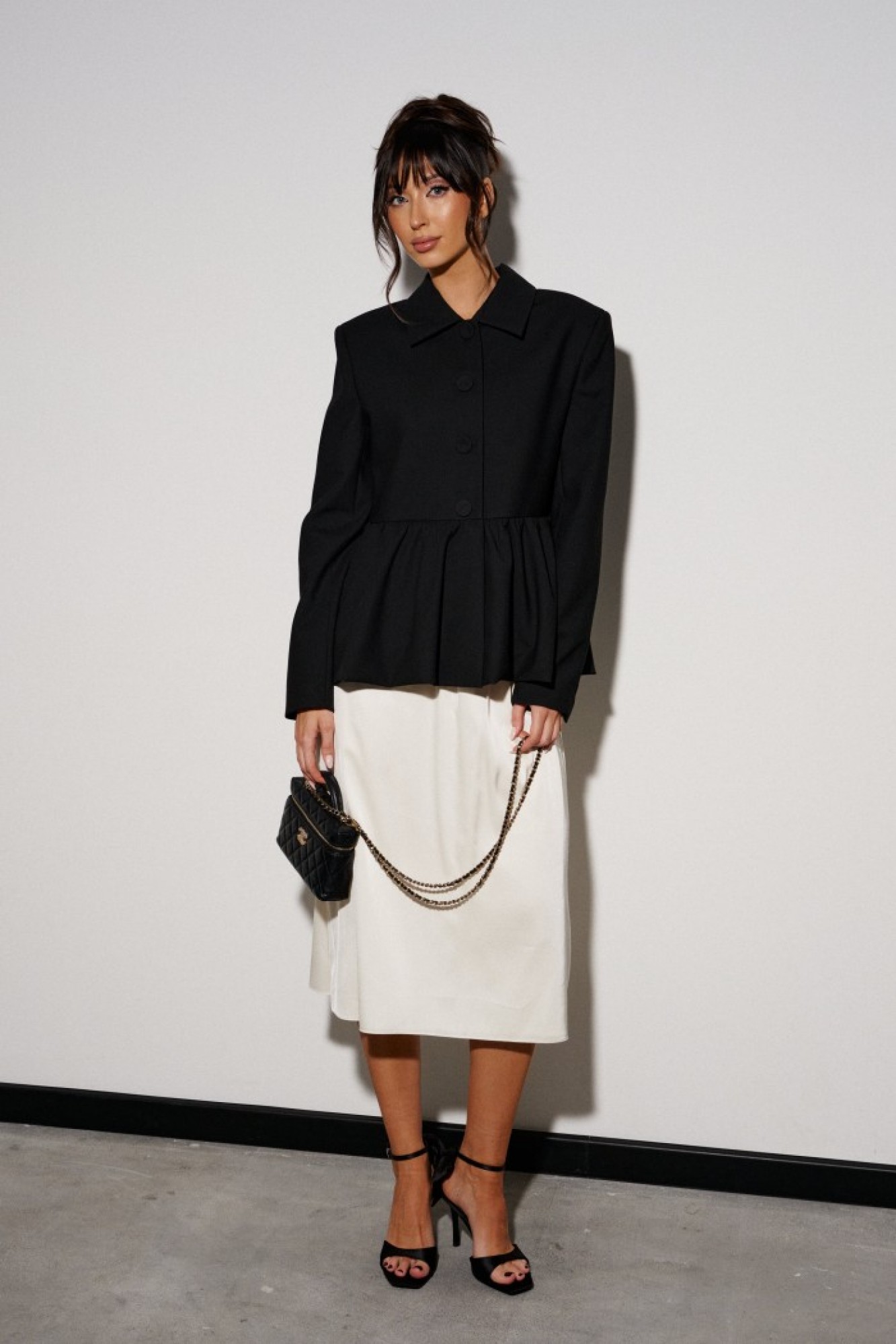 Жакет прямого кроя, с баской по нижней части изделия. Выполнен из костюмной ткани. Характеристики: брендированная подкладка, отложной воротник, застежка центральная на пуговички, рукав втачной.