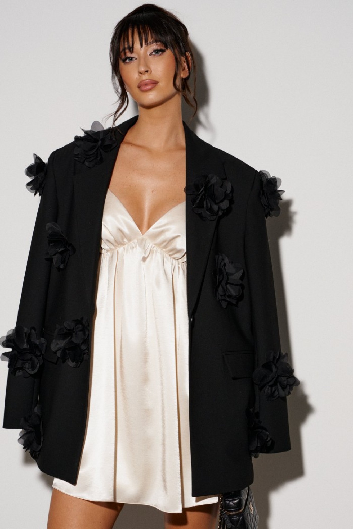 Жакет прямого свободного кроя выполнен из костюмной ткани черного цвета, декорирован несъемными цветами из шифона . Характеристики: прямой свободный крой, брендированная подкладка, подплечники, воротник с остроугольным лацканом, застежка центральная на петлю - пуговицу, по переду функциональные карманы с клапаном, рукав втачной, по низу рукава нашиты пуговички, спинка со средним швом, в среднем шве разрез 24 см.