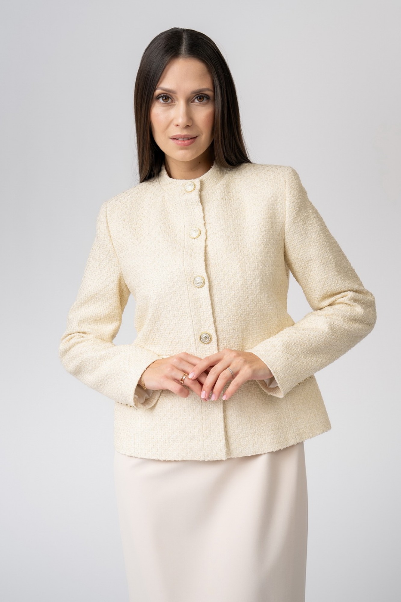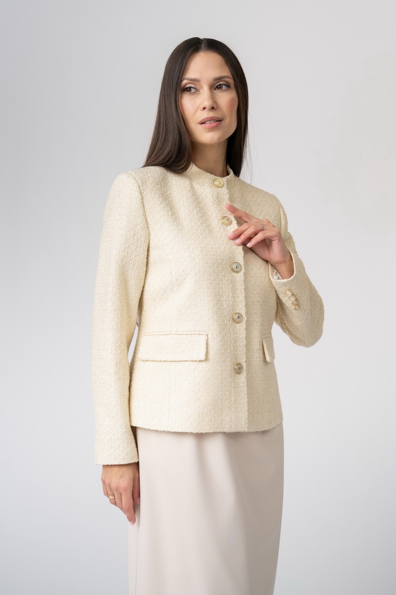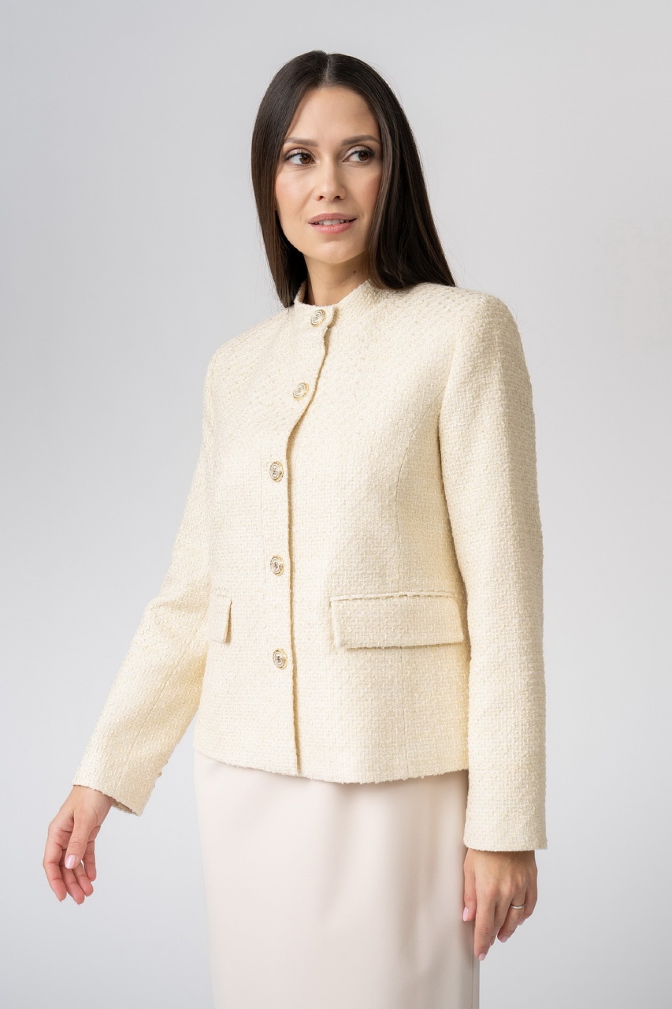 Жакет женский с центральной бортовой застежкой до верха: на пять пуговиц, четыре - по борту и одна - на стойке. Рукава втачные, длинные. По низу рукава пришиты четыре пуговицы. Жакет на подкладке, притачной по низу, с плечевыми накладками