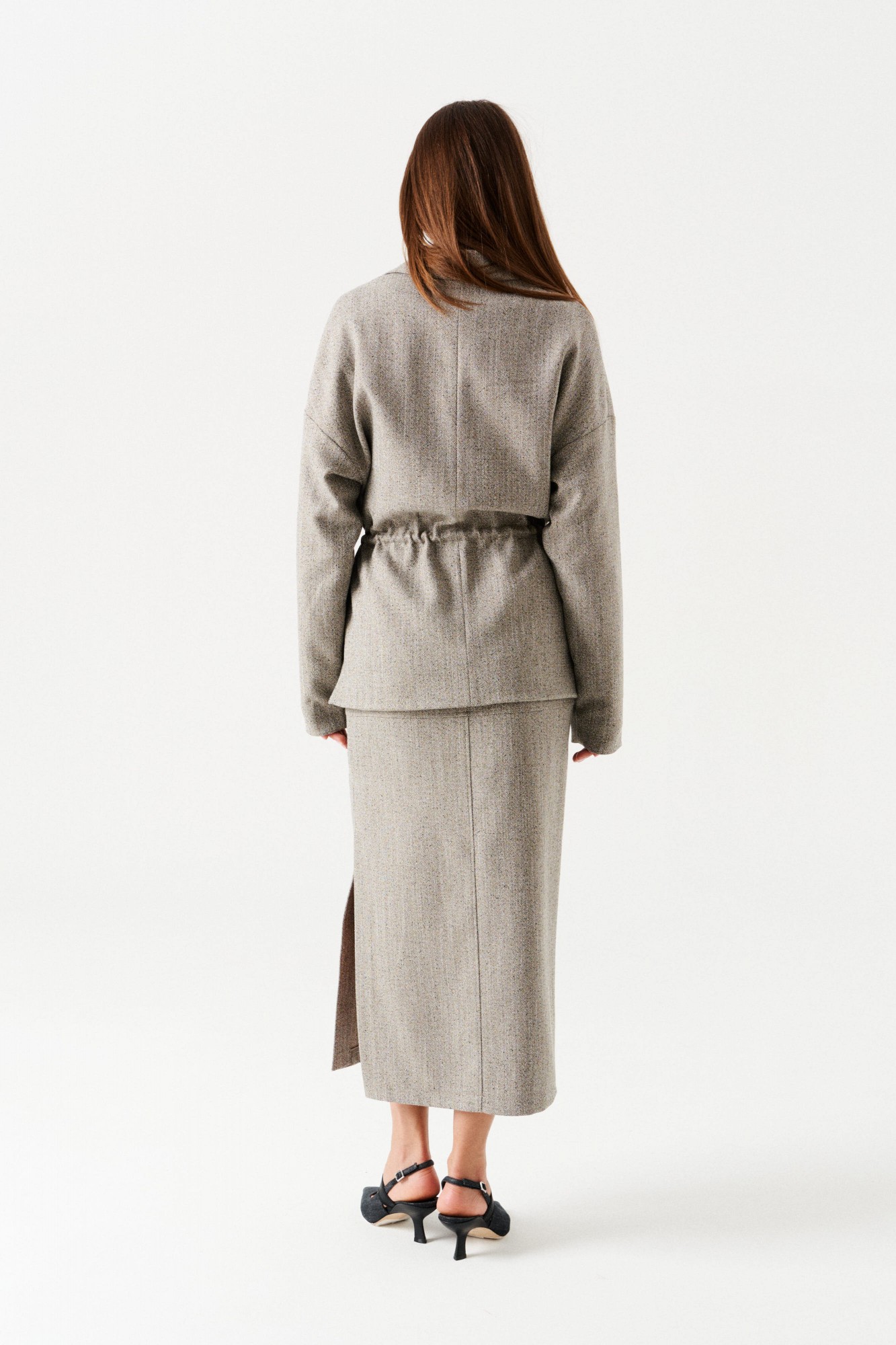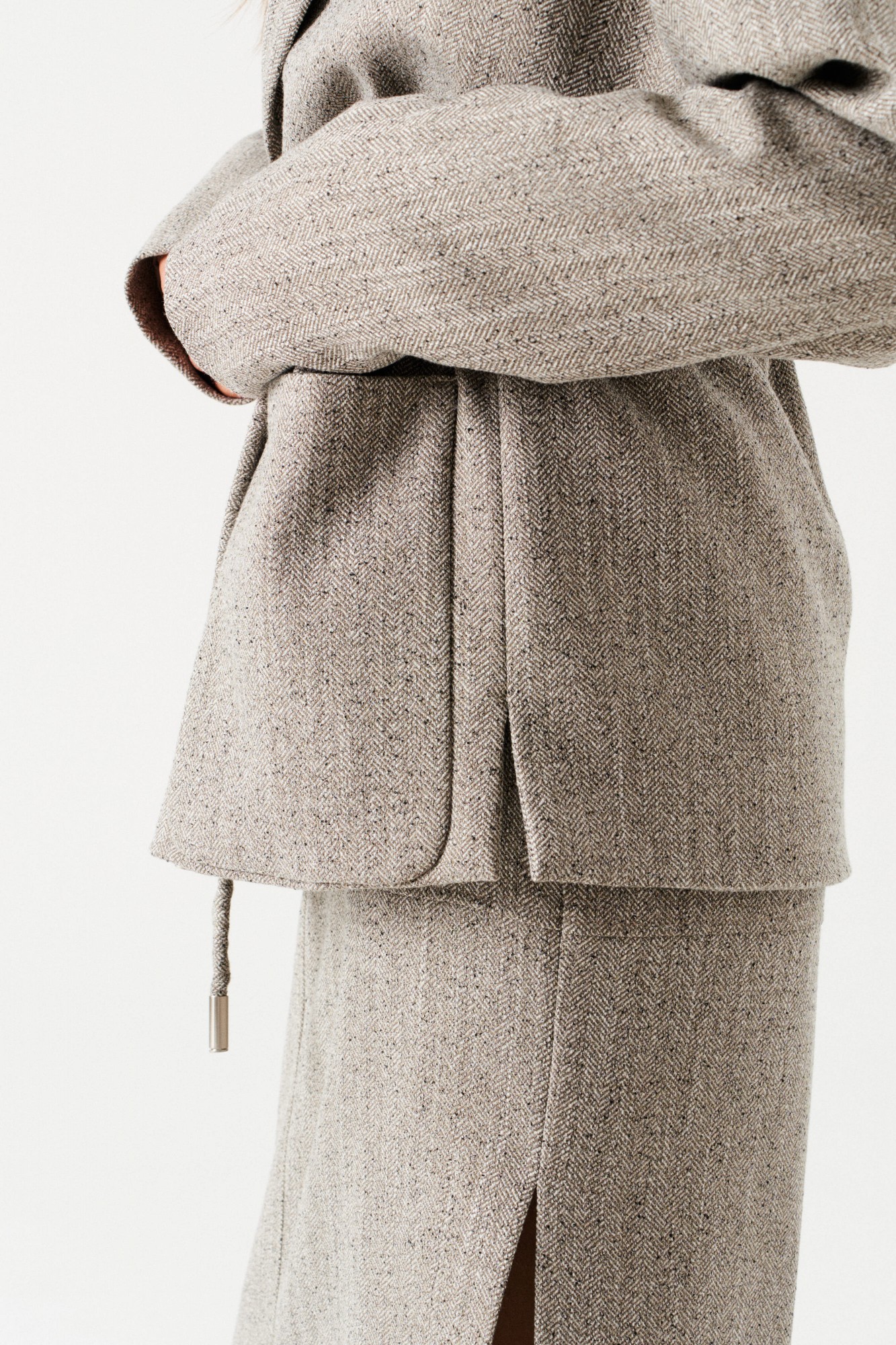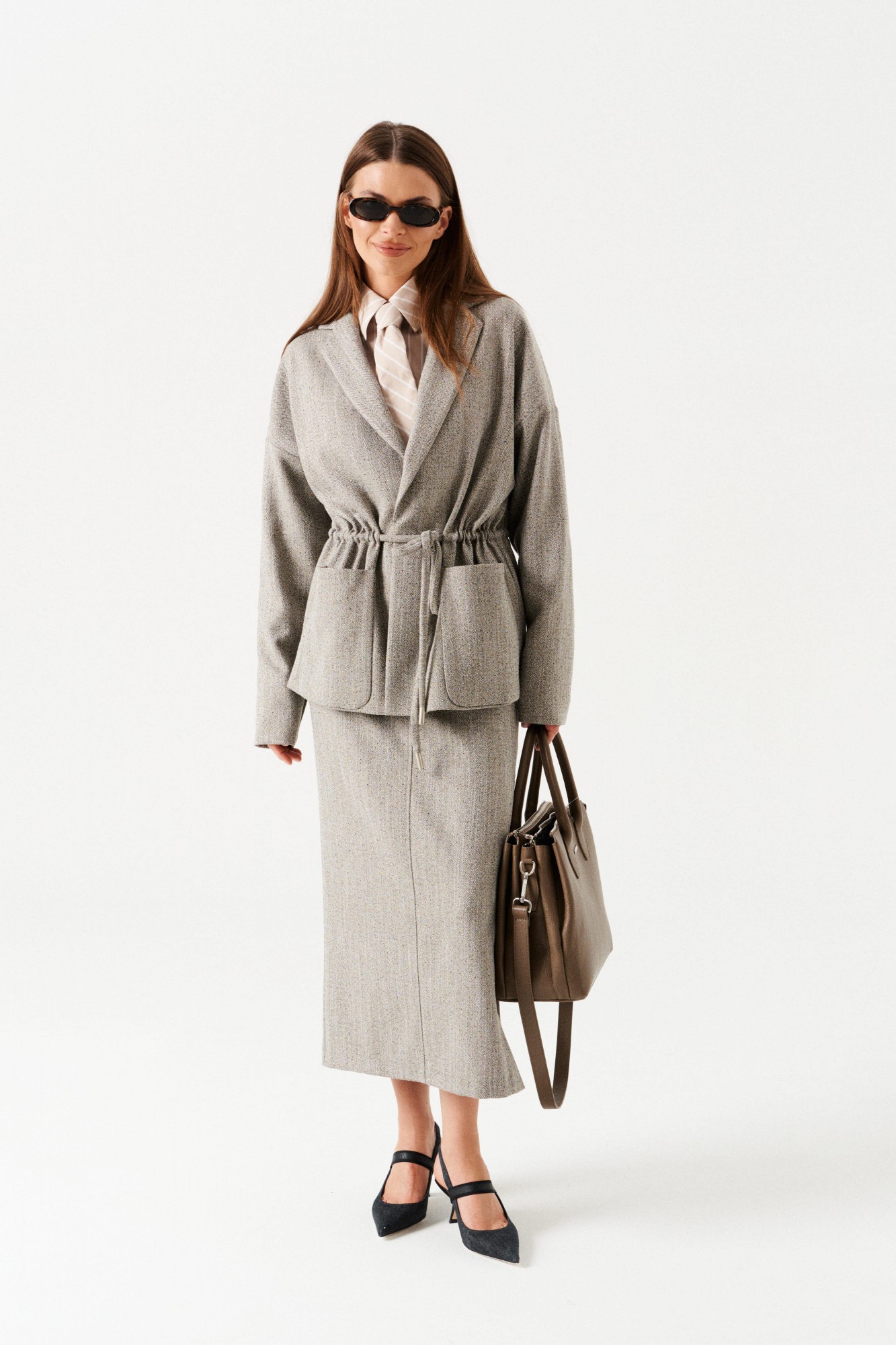 Жакет женский, однобортный, со спущенной линией плеча, на подкладке, с отложным воротником и лацканами пиджачного типа, на подкладке. По переду – накладные карманы. Спинка со средним швом. На уровне линии талии – кулиса со шнуром-завязкой. Рукав длинный.