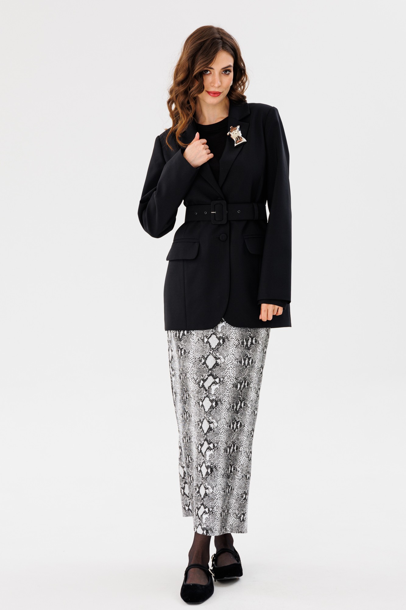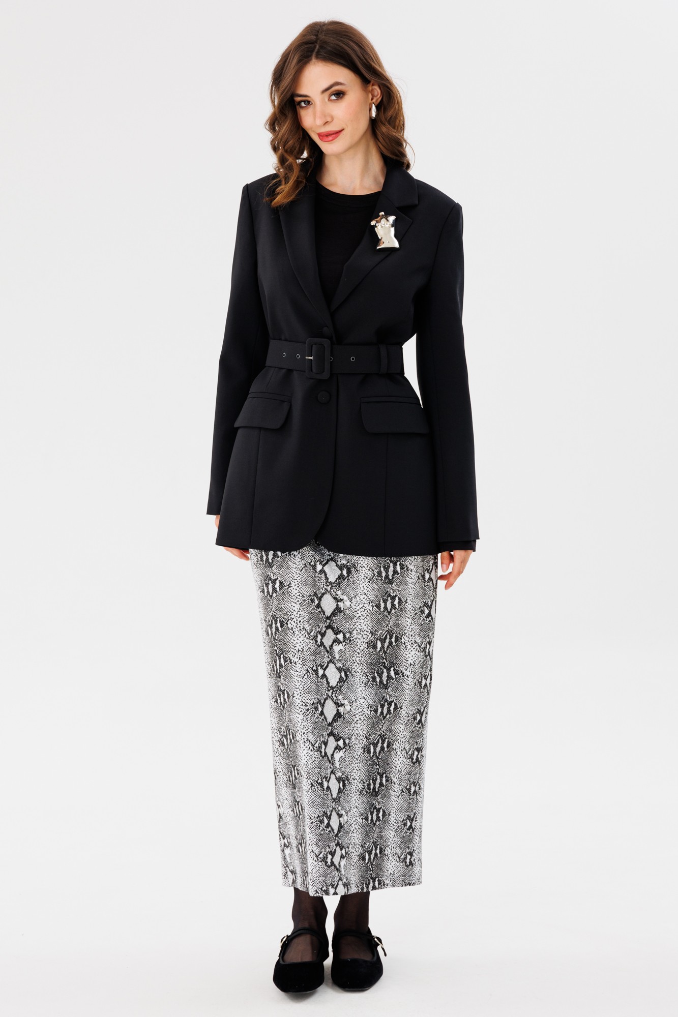 Жакет выполнен из костюмной ткани. Жакет полуприлегающего силуэта, длиной ниже линии бедер. Спереди прорезные карманы с клапанами, центральная бортовая застежка на пуговицы. Воротник пиджачного типа. Рукав втачного покроя, двухшовный. В комплект входит ремень из основной ткани с обтяжной пряжкой. Брошь в комплект не входит!