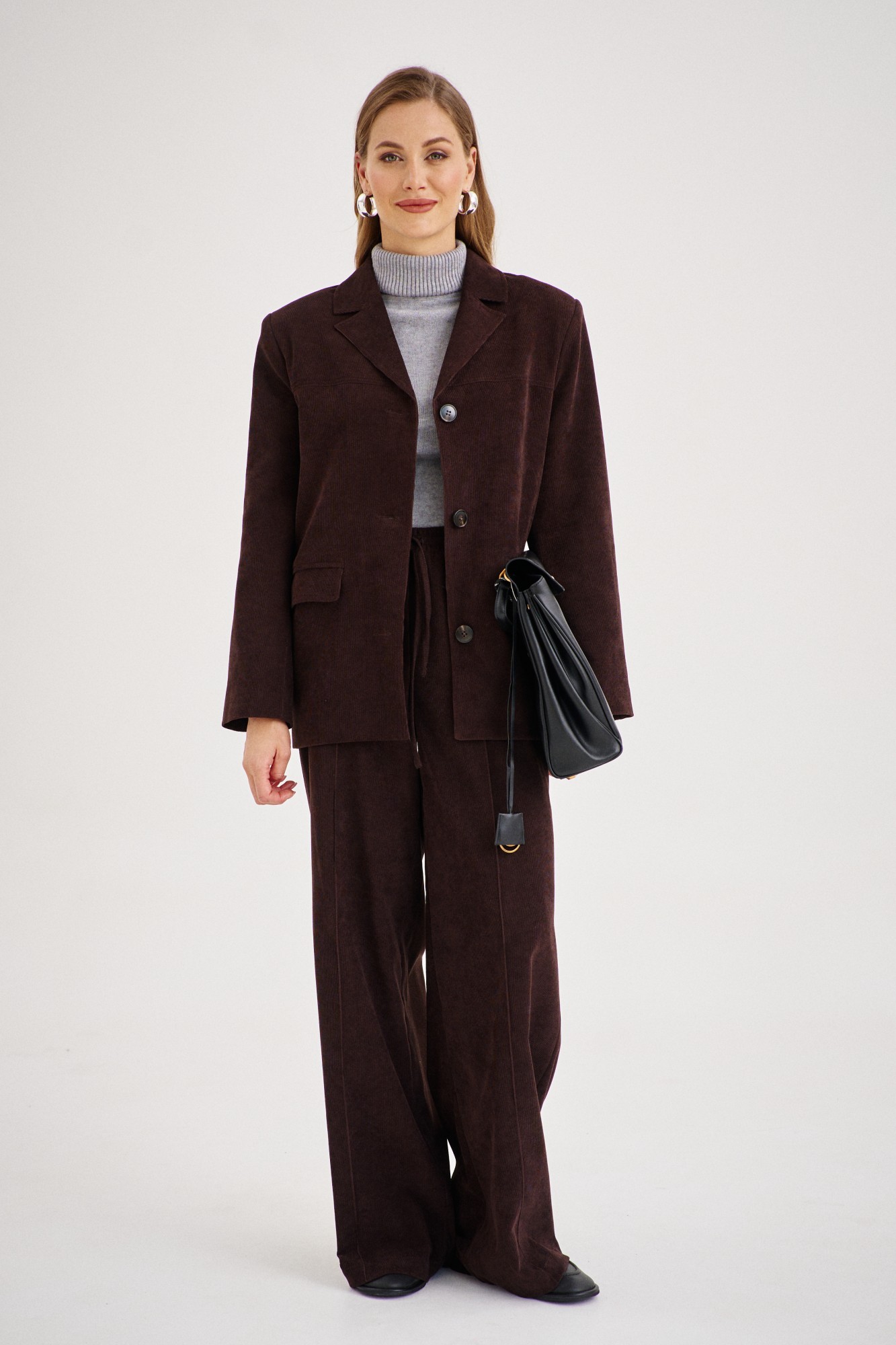 Жакет из вельвета прямого силуэта, с отложным воротником и приспущенной линией плеча. В модели имеются удобные накладные карманы с клапанами на пуговицах, Благодаря благородной ткани образ выглядит дорого и благородно. Комбинируйте с брюками из нашей коллекции.