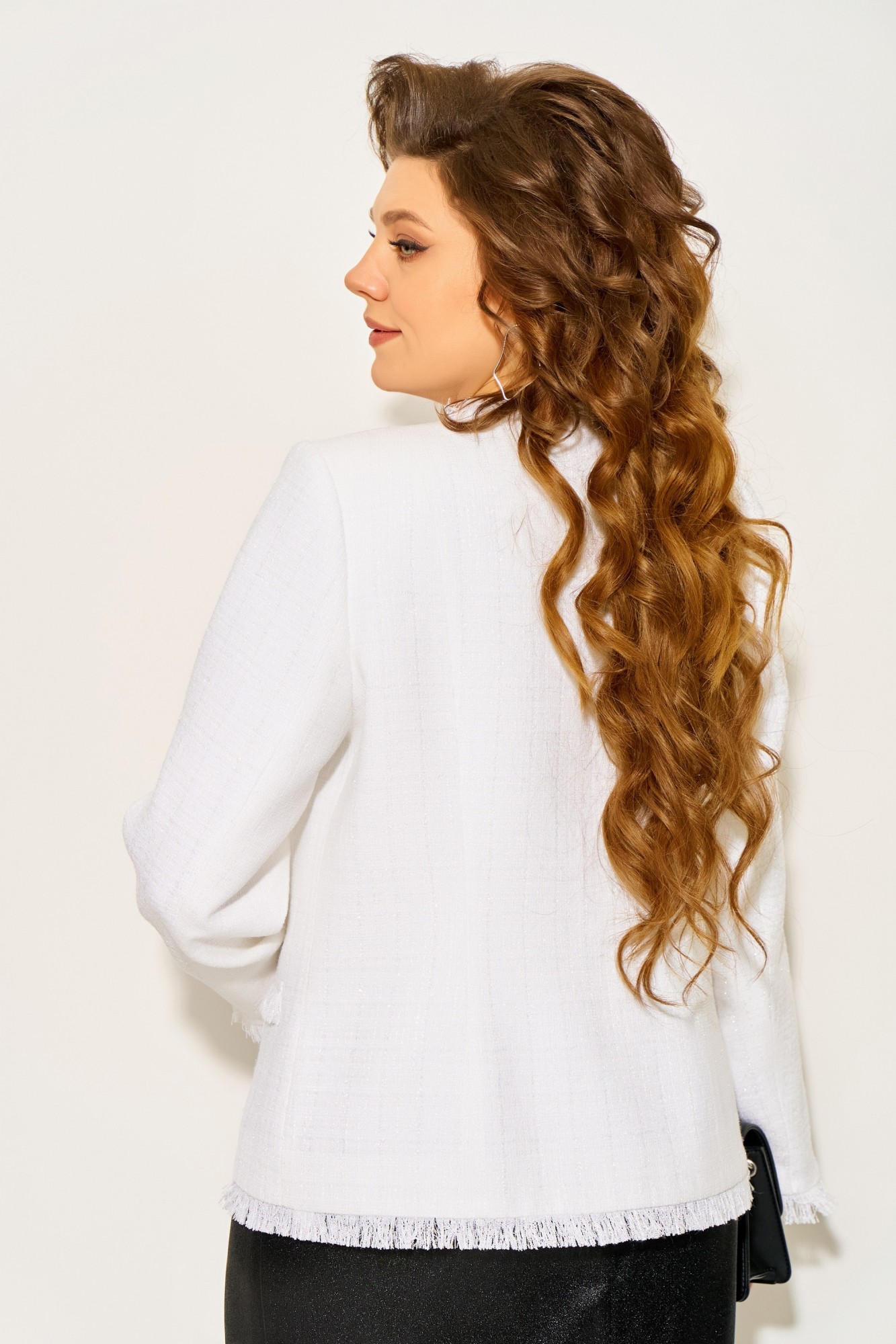 Нарядный жакет "Яника" — твидовая классика с изюминкой. Элегантный жакет полуприлегающего силуэта выполнен из твидовой ткани с флоковой нитью, жакет на подкладке. Однобортная застёжка на пуговицу, рельефные линии по полочке и спинке подчёркивают фигуру. Декоративная трепка по краю борта, низу изделия и рукавам добавляет фактурности и оригинальности. Карман-обманка в виде настроченной трепки — стильный акцент, придающий образу индивидуальность. Идеален для деловых встреч, торжественных мероприятий и стильных повседневных образов.