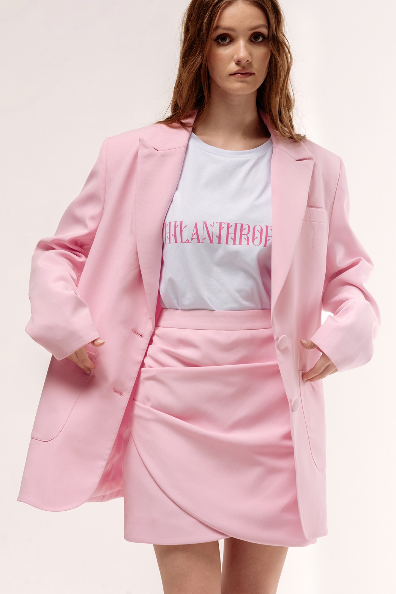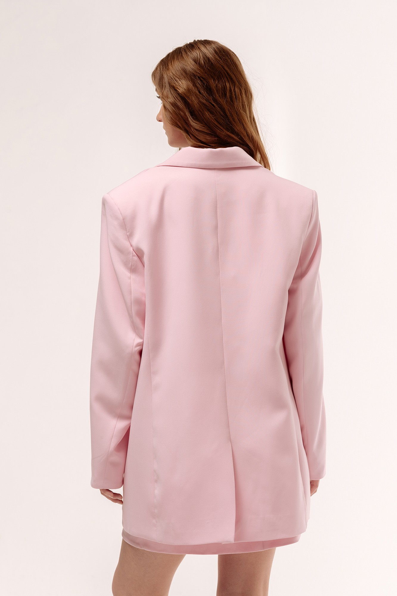 Жакет свободного кроя. Характеристики: выполнен из костюмной ткани в розовом цвете, однобортная застежка на петли и пуговицы, жакет на подкладке, накладные карманы по полочкам, по спинке разрез-шлица, рукава двухшовные.