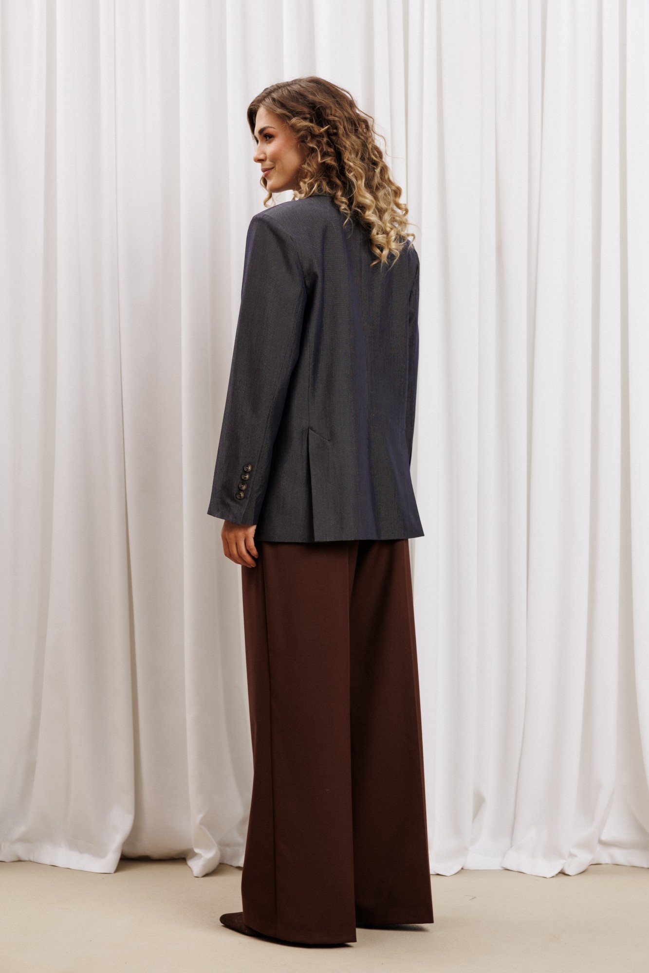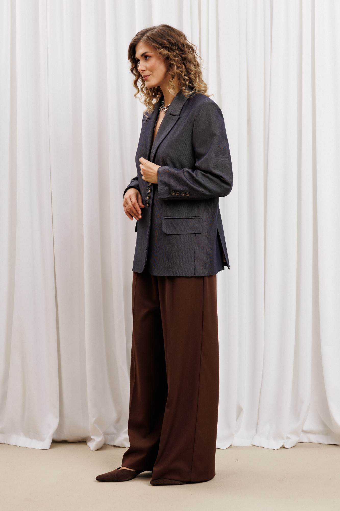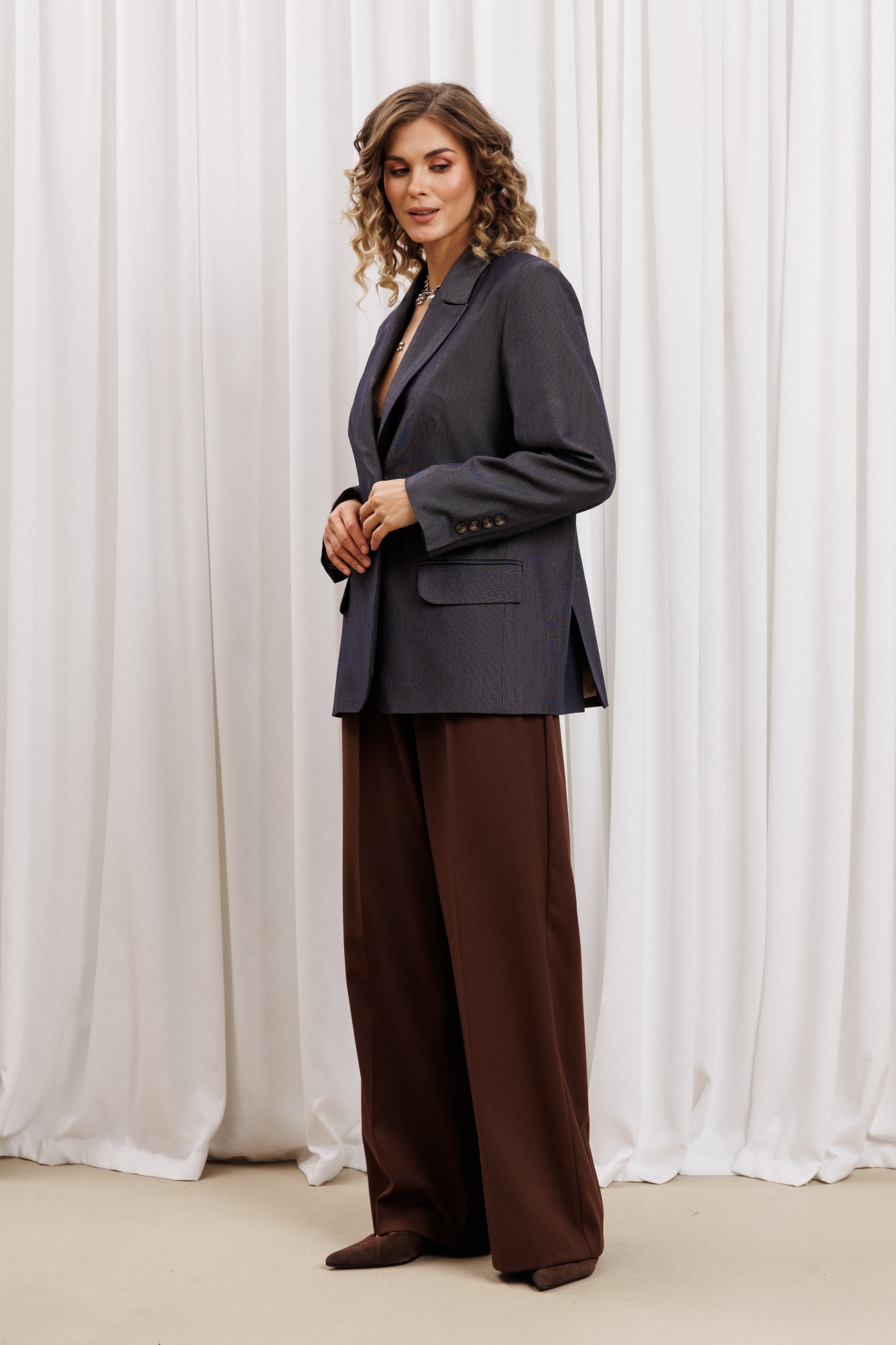 Жакет прямого свободного силуэта из костюмной ткани. Воротник пиджачного типа, застежка однобортная на 4 петли и пуговицы. Перед с таллиевой вытачкой и карманом с клапаном в рамку, с рельефом. Спинка со средним швом и рельефами, в рельефах шлица. Рукав втачной одношовный со шпицей и 4-мя пуговицами. Жакет на подкладке.