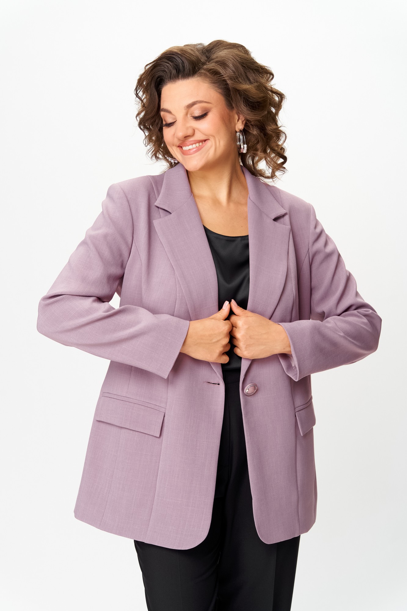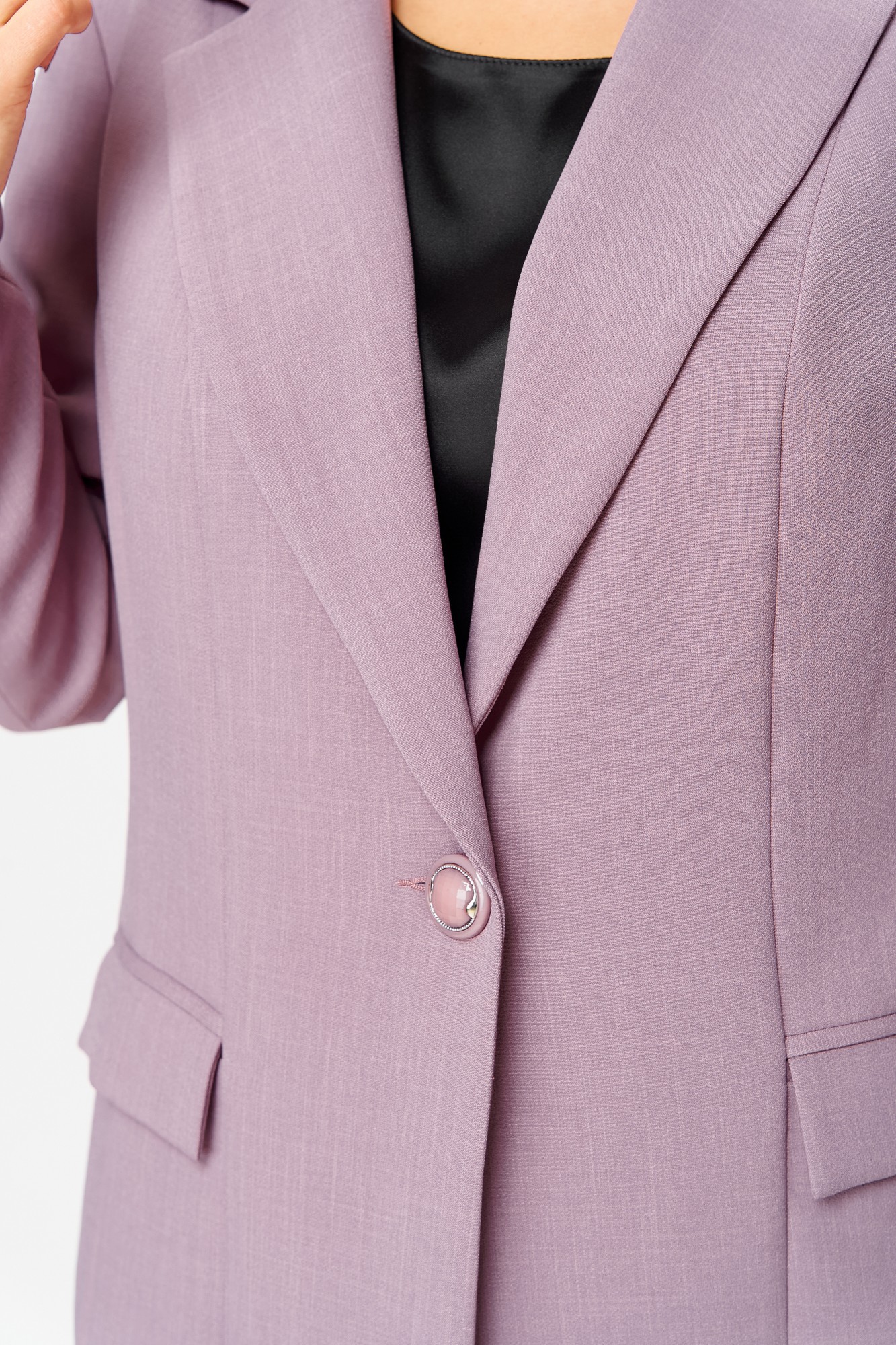 Жакет прямого силуэта, выполнен из однотонной ткани, жакет на подкладке. Полочка жакета с центральной застежкой на петлю пуговицу. Полочка с вертикальными рельефами и прорезными карманами с клапанами. Горловина V-образной формы с отложными лацканами и воротником пиджачного типа. Спинка со средним швом и вертикальными рельефами. Рукав втачной, двухшовный. Жакет на плечиках.