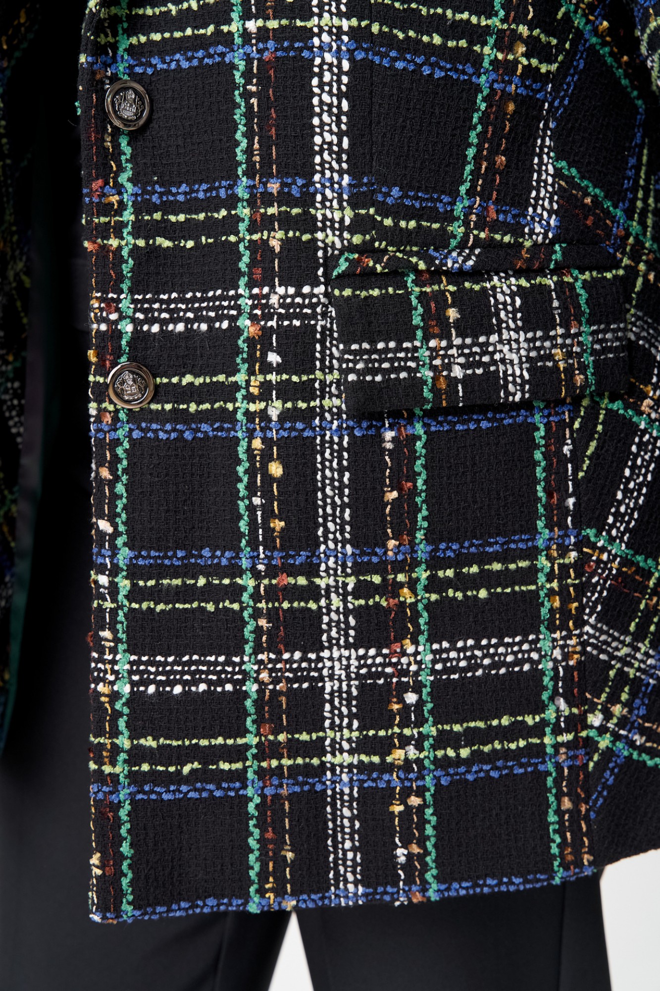 Жакет удлиненный, из твида, свободного силуэта с центральной бортовой застежкой на пуговицы до линии перегиба лацкана. По переду имеется отрезной бочок и вертикальные вытачки. С прорезными карманами с клапаном и двумя обтачками. Спинка цельная. Воротник пиджачного типа. Рукав двухшовный, втачной. Жакет на подкладке.