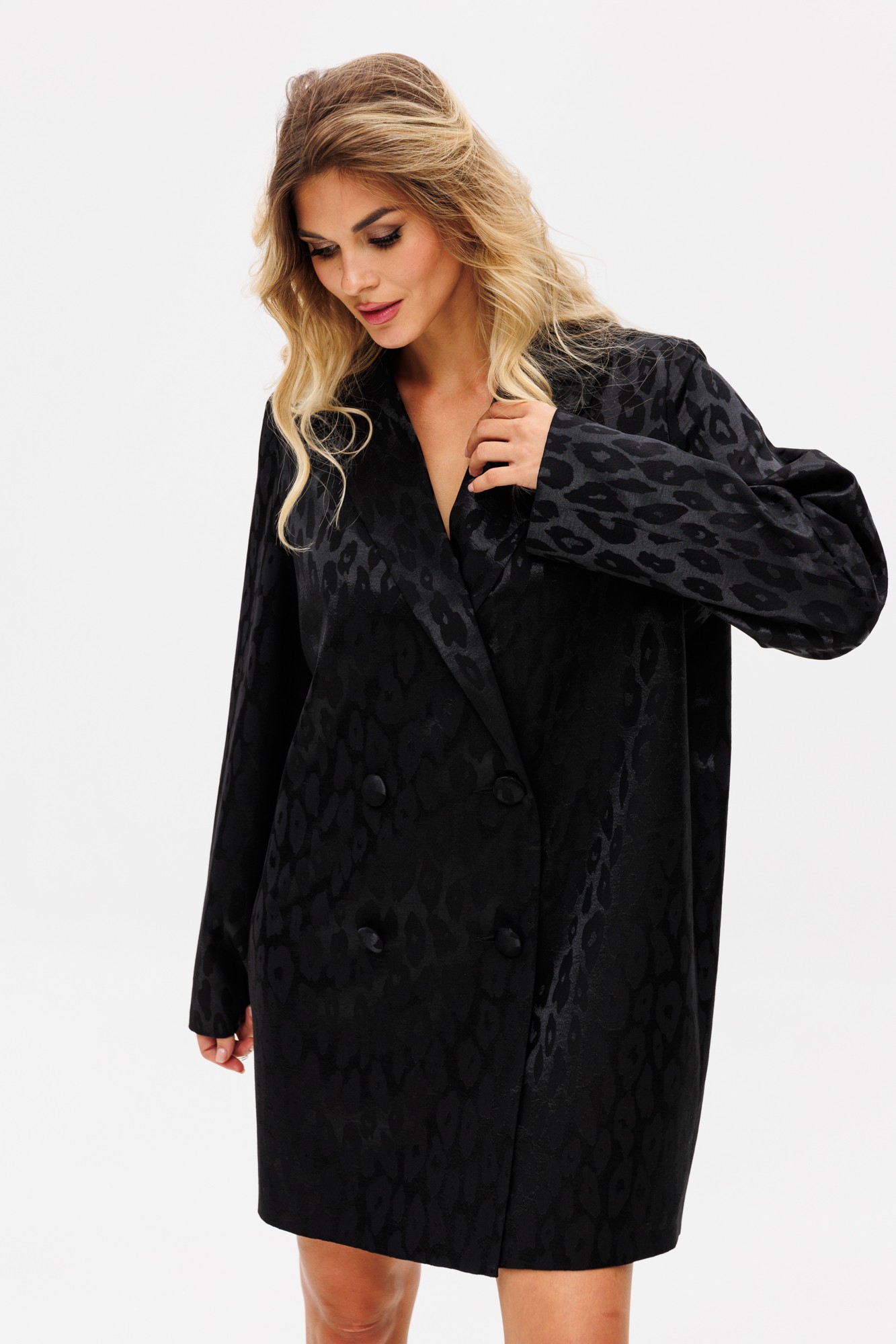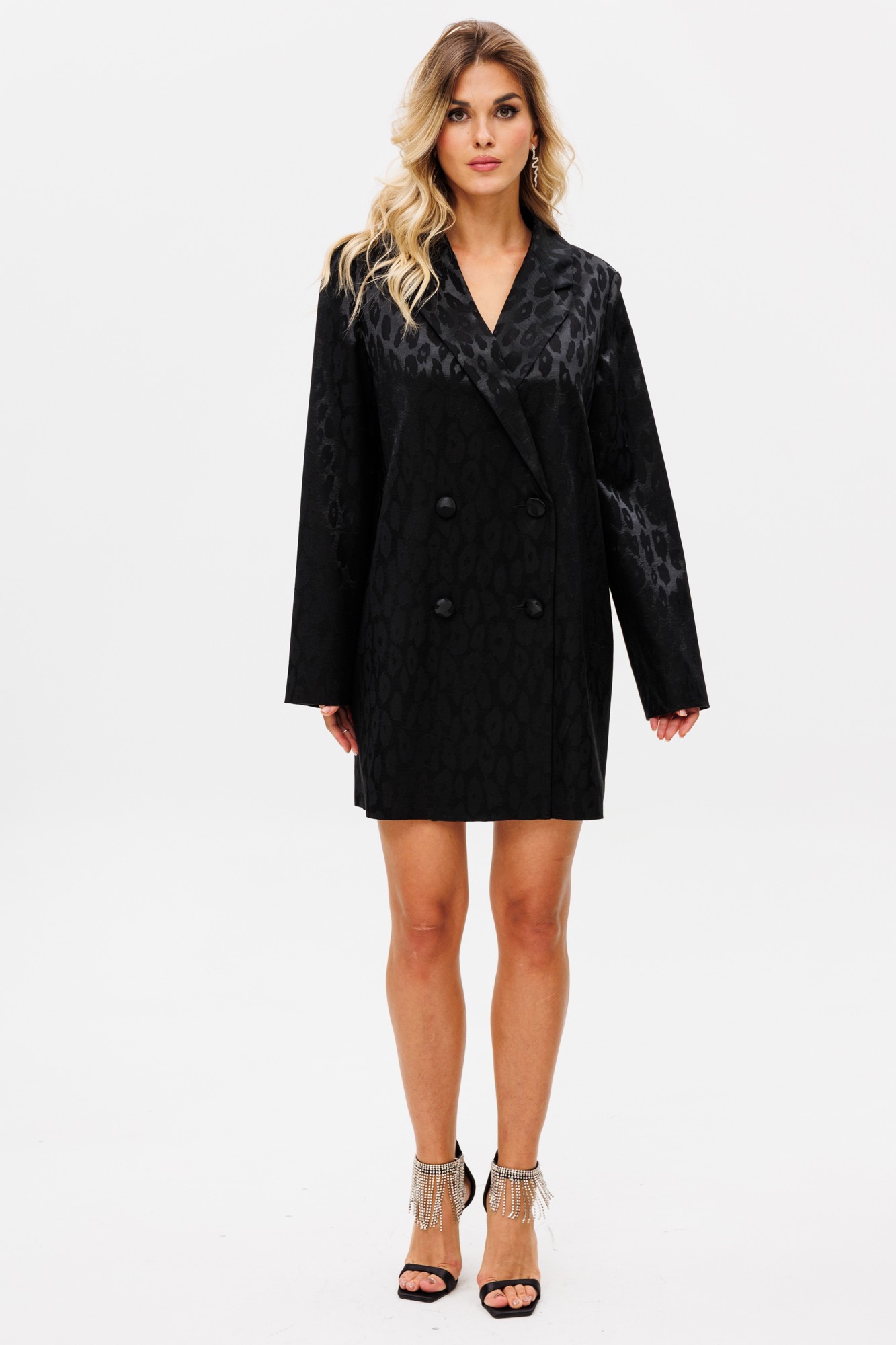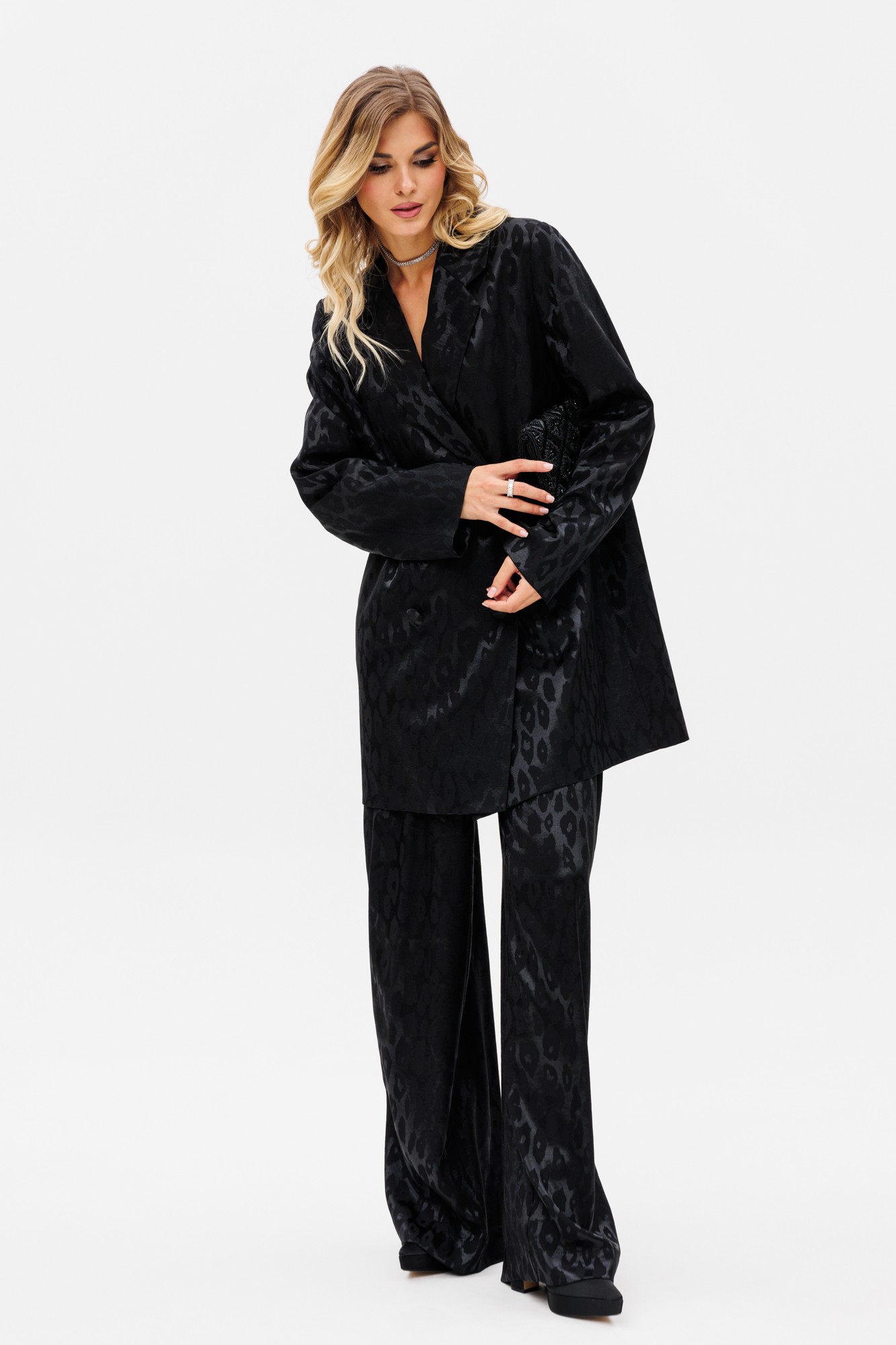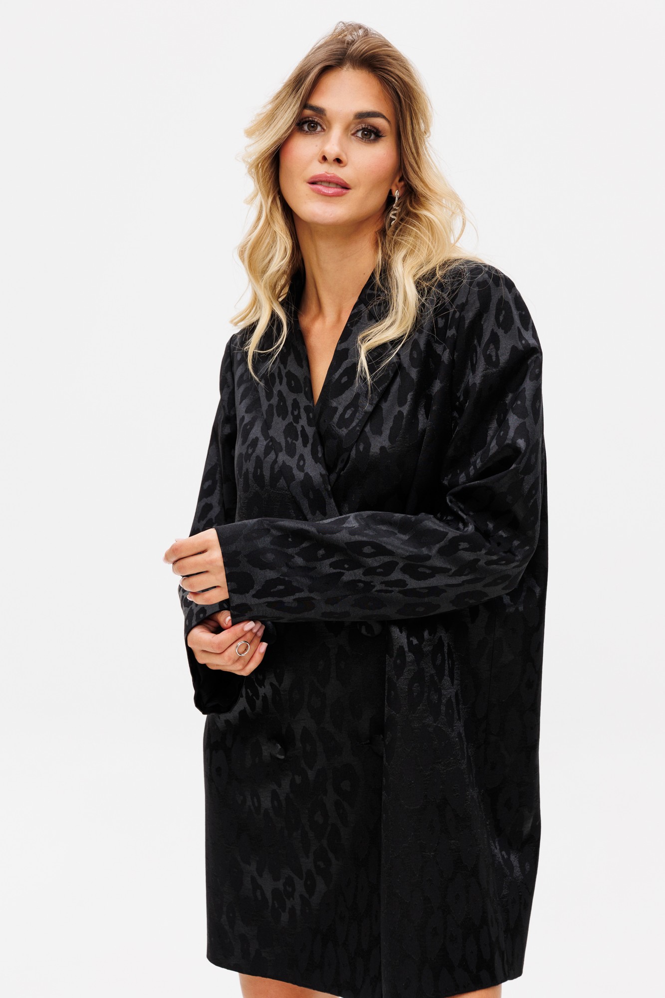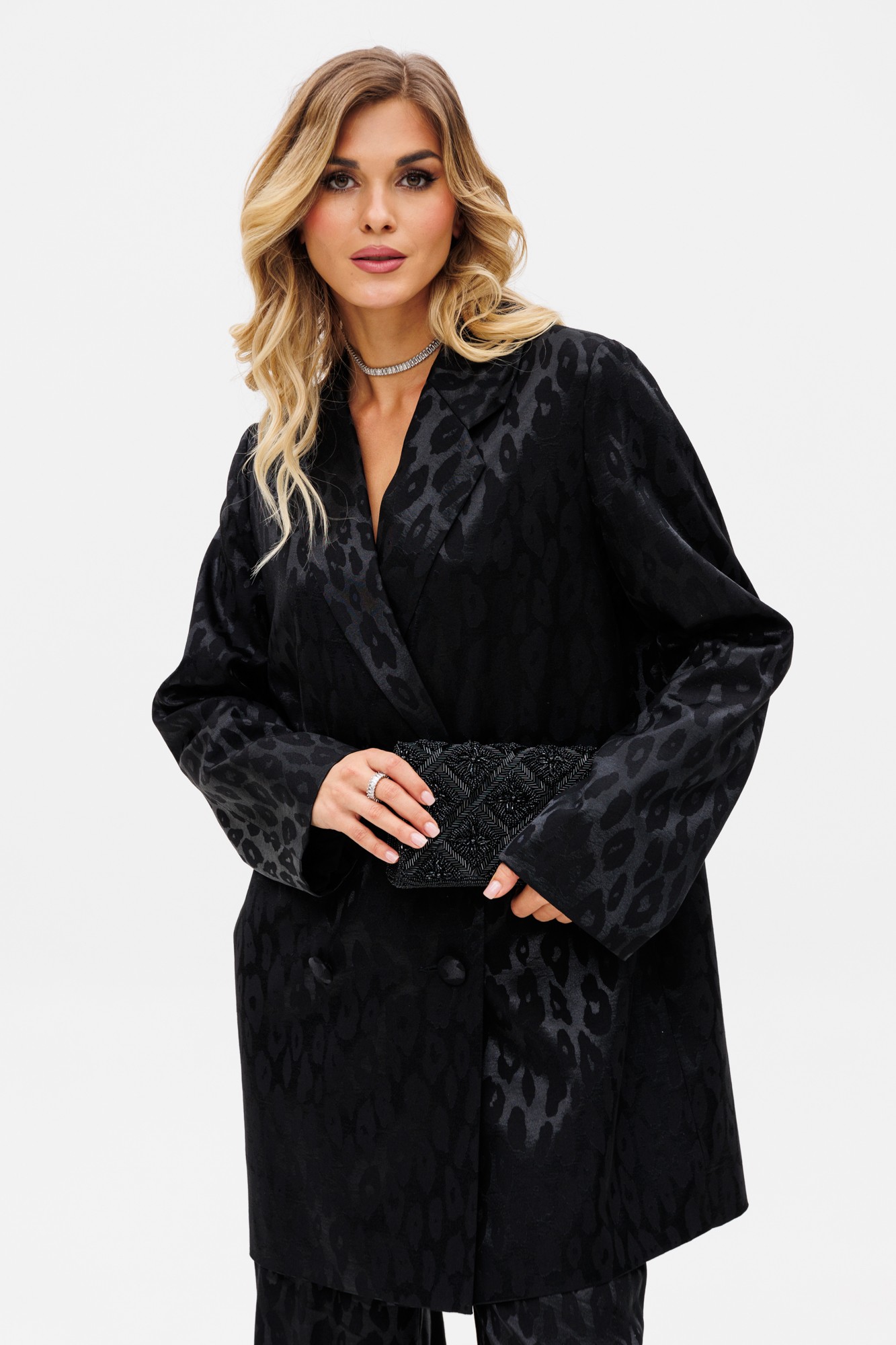 Жакет выполнен из костюмно-плательной ткани с анималистичным принтом. Жакет прямого силуэта , длиной ниже линии бедер. Спереди лацканы и двубортная застежка на пуговицы. Спинка цельная. Горловина пиджачного типа. Рукав втачной, двухшовный. Жакет на притачной по низу подкладке.