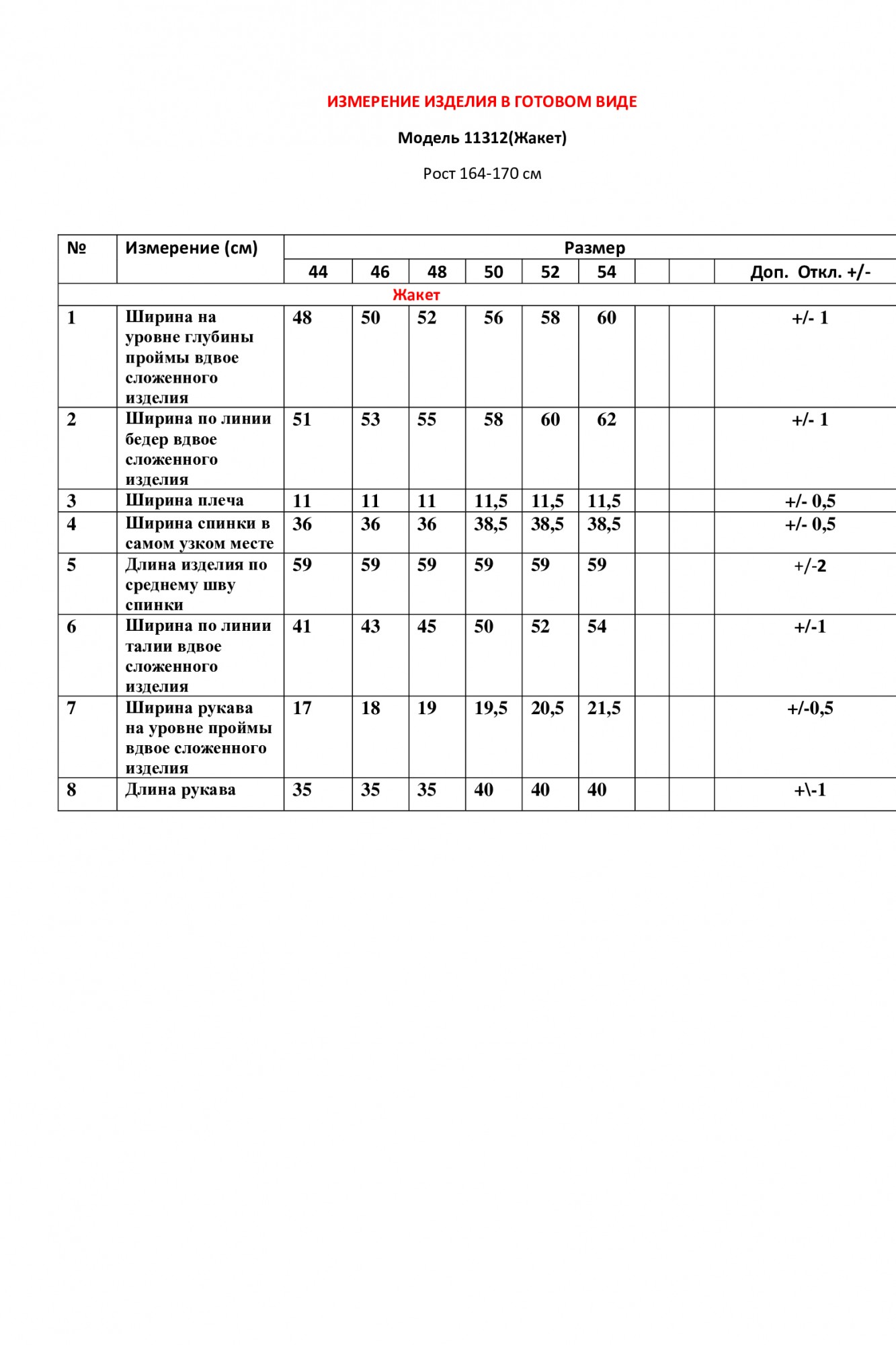 Таблица размеров
