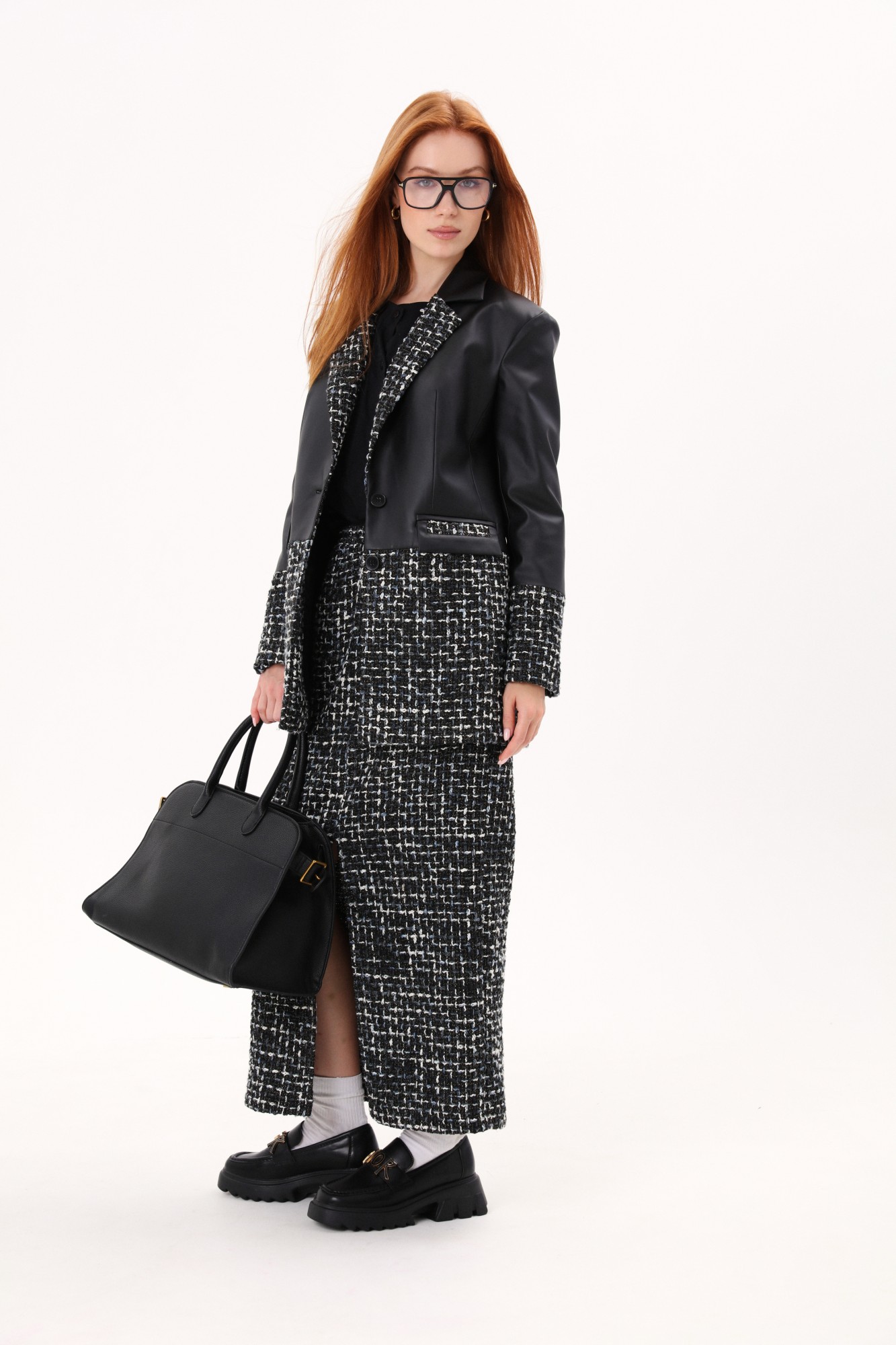 Жакет однобортный из комбинированной ткани: шанель и экокожа. Изделие полуприлегающего силуэта, длиной ниже линии бедер. Рукав втачной, двухшовный. Воротник английский. На переде прорезные карманы в рамку с клапаном. Застежка центральная на петли и пуговицы. В среднем шве спинки шлица.