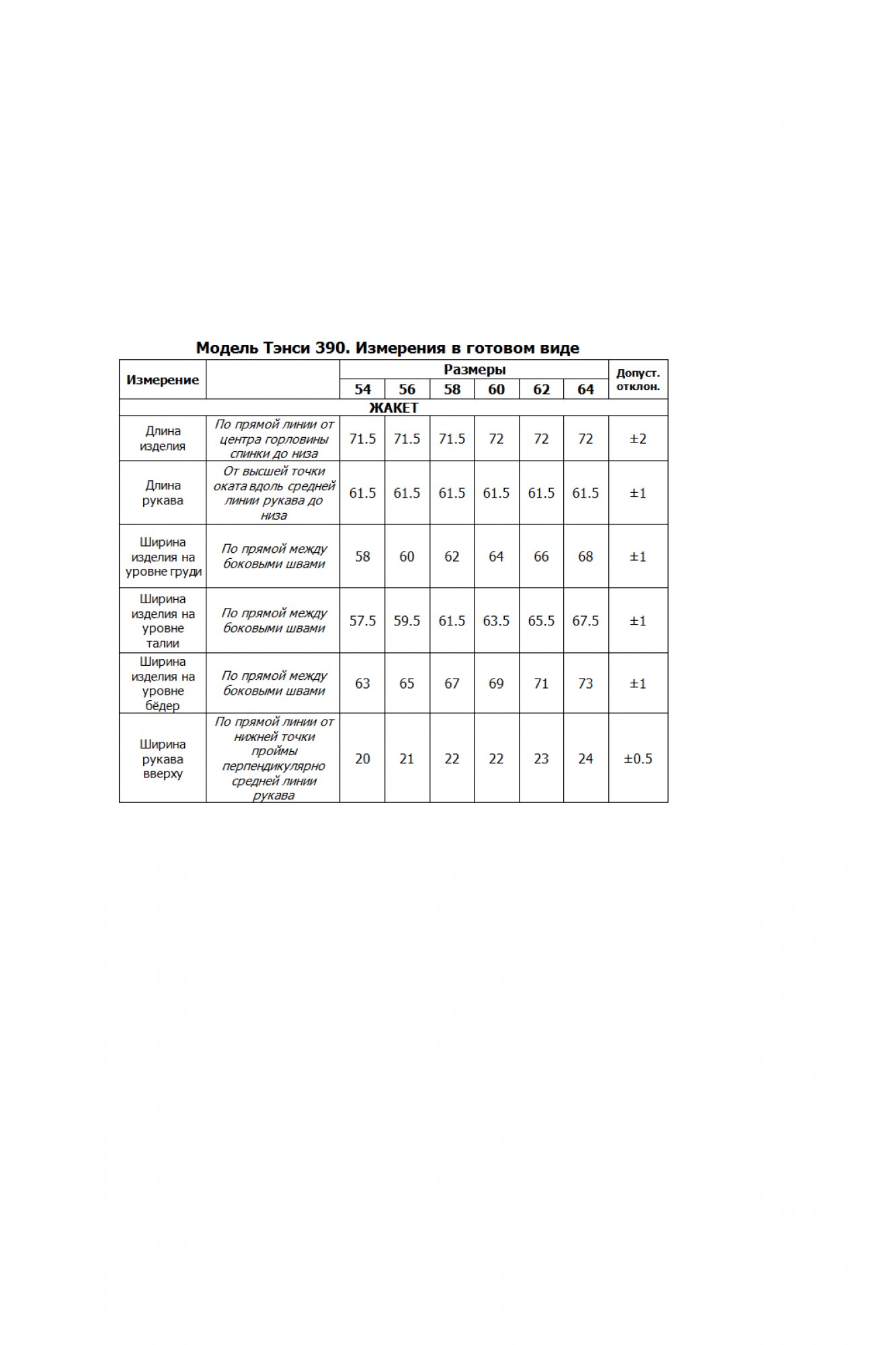 Таблица размеров