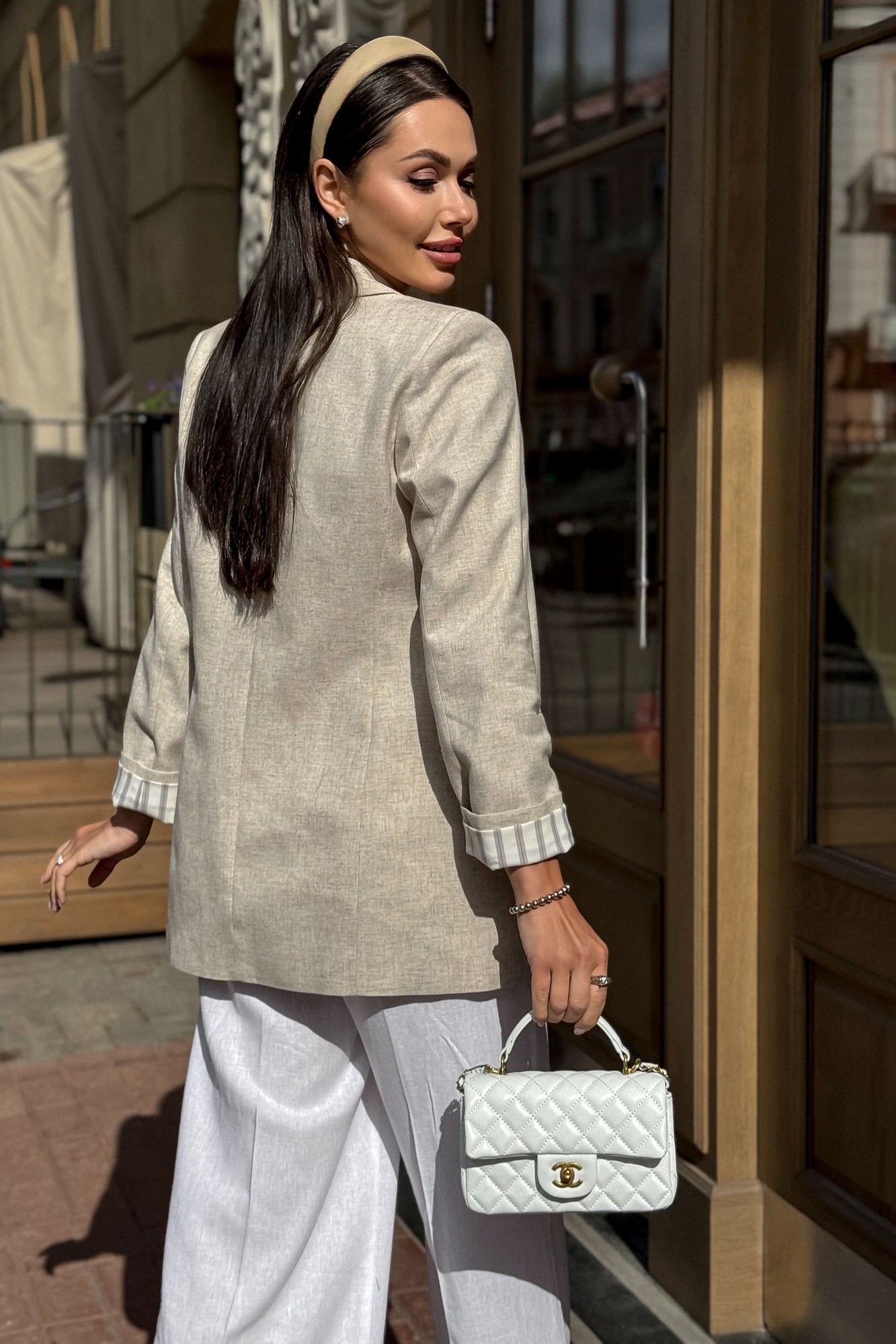 Длина жакета по среднему шву спинки – 73,0 см (±1,5см), Ширина жакета на уровне глубины проймы – 52,5 см (±1,0 см), Ширина жакета на уровне линии талии – 49,5 см (±1,0 см), Ширина жакета на уровне линии бедер – 55,0 см (±1,0 см), Длина рукава жакета с манжетой – 60,5см (±1,5 см), Ширина рукава жакета вверху – 18,5 см (±1,0 см), Ширина рукава внизу - 15,0 см (±0,5 см), Длина плеча жакета – 11,7 см (±0,5 см).