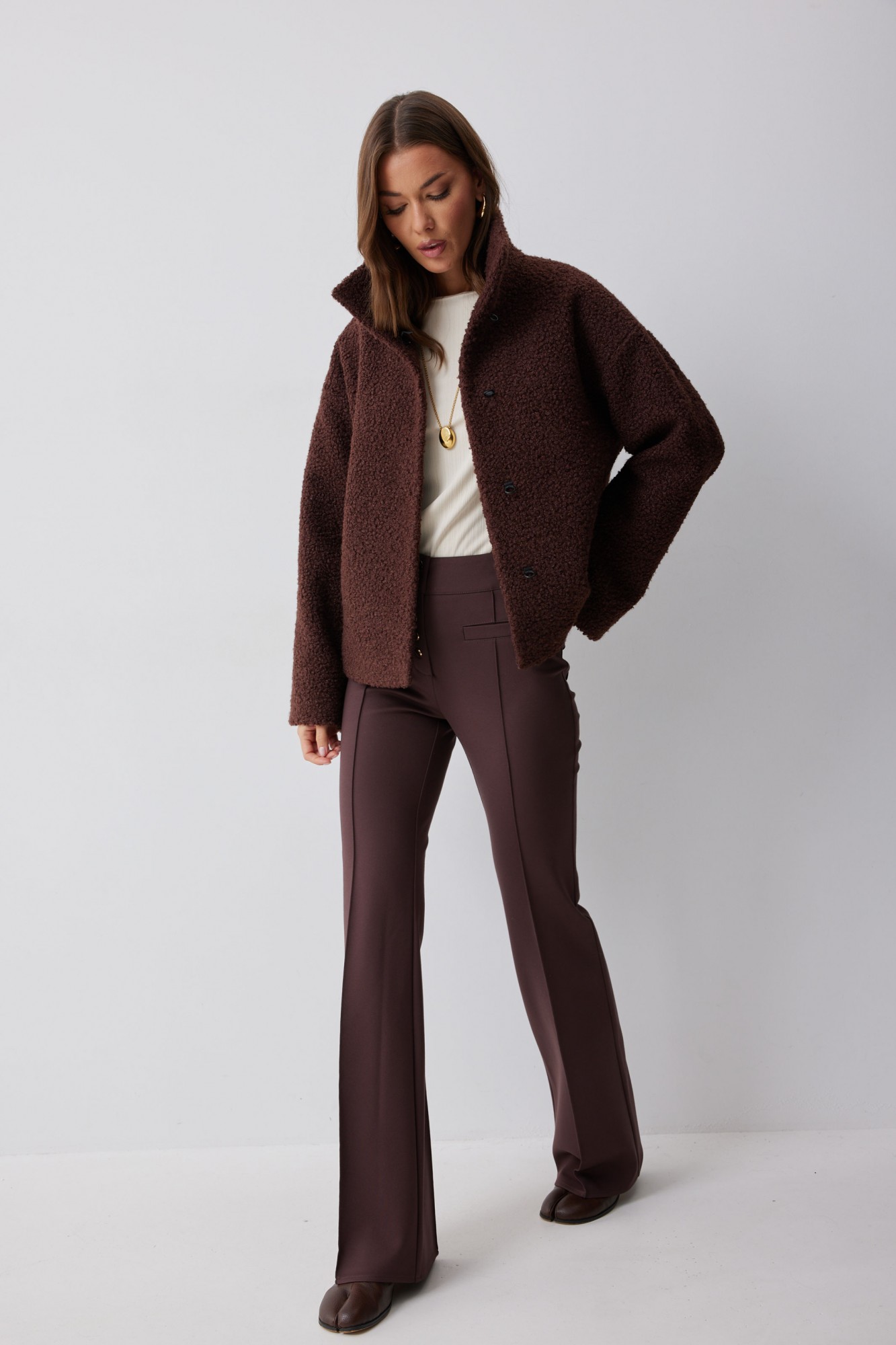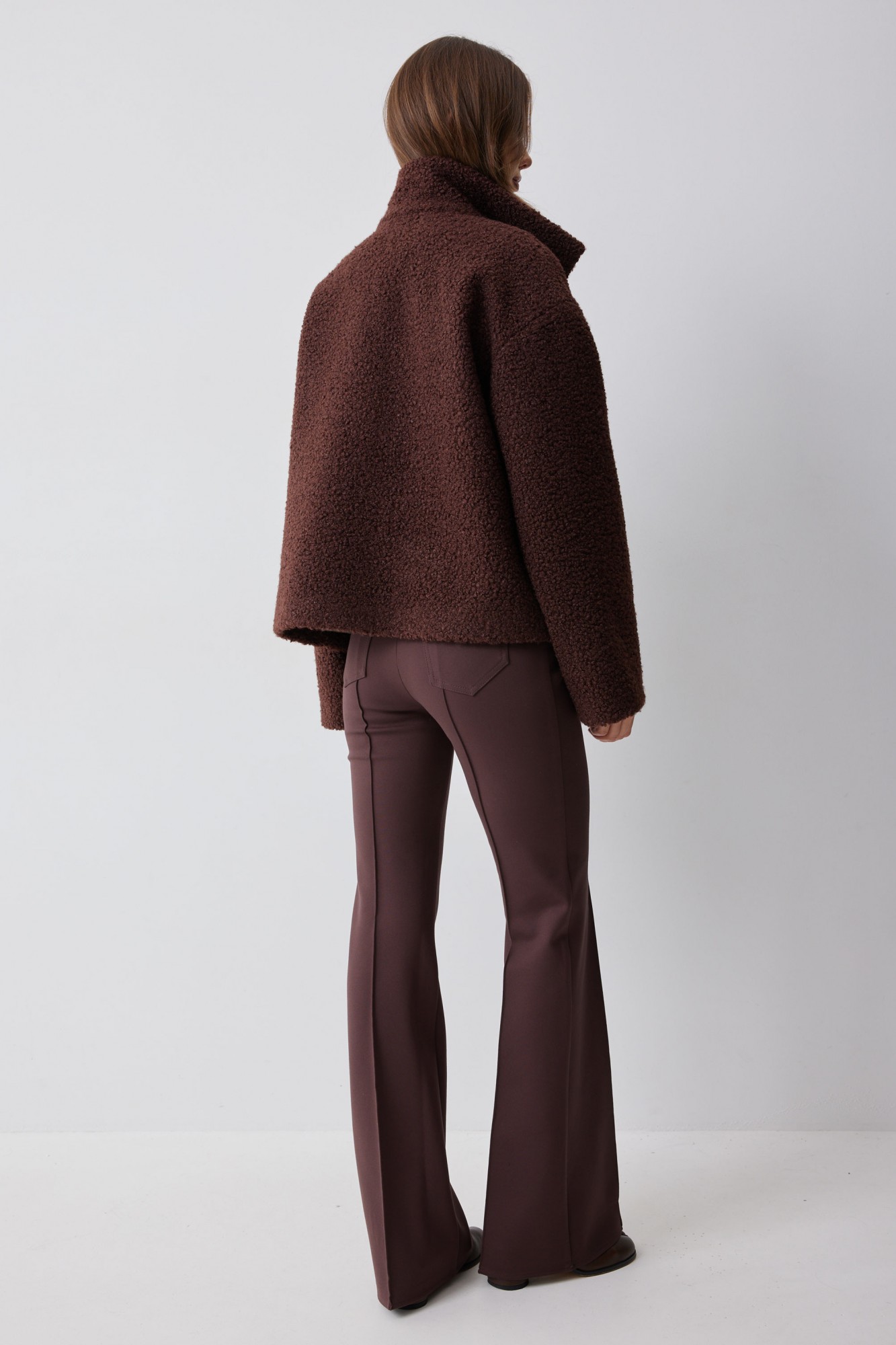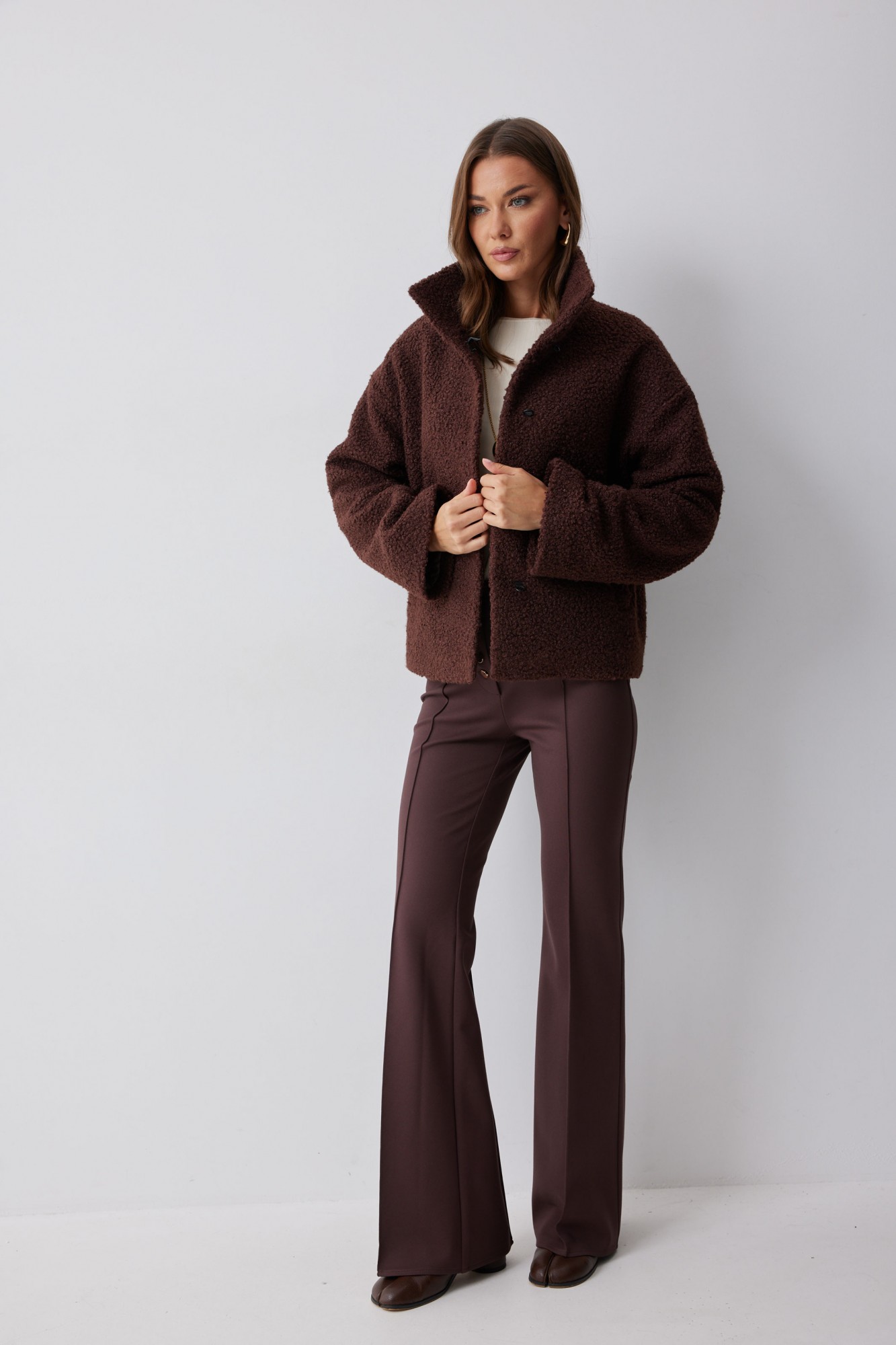 Жакет прямого силуэта из букле на трикотажной основе. Воротник-стойка. Центральная застежка на крючки. Рукав со спущенной линией плеча. По переду прорезные карманы. Жакет на подкладке. Обращаем ваше внимание, что фурнитура может отличаться от фото.