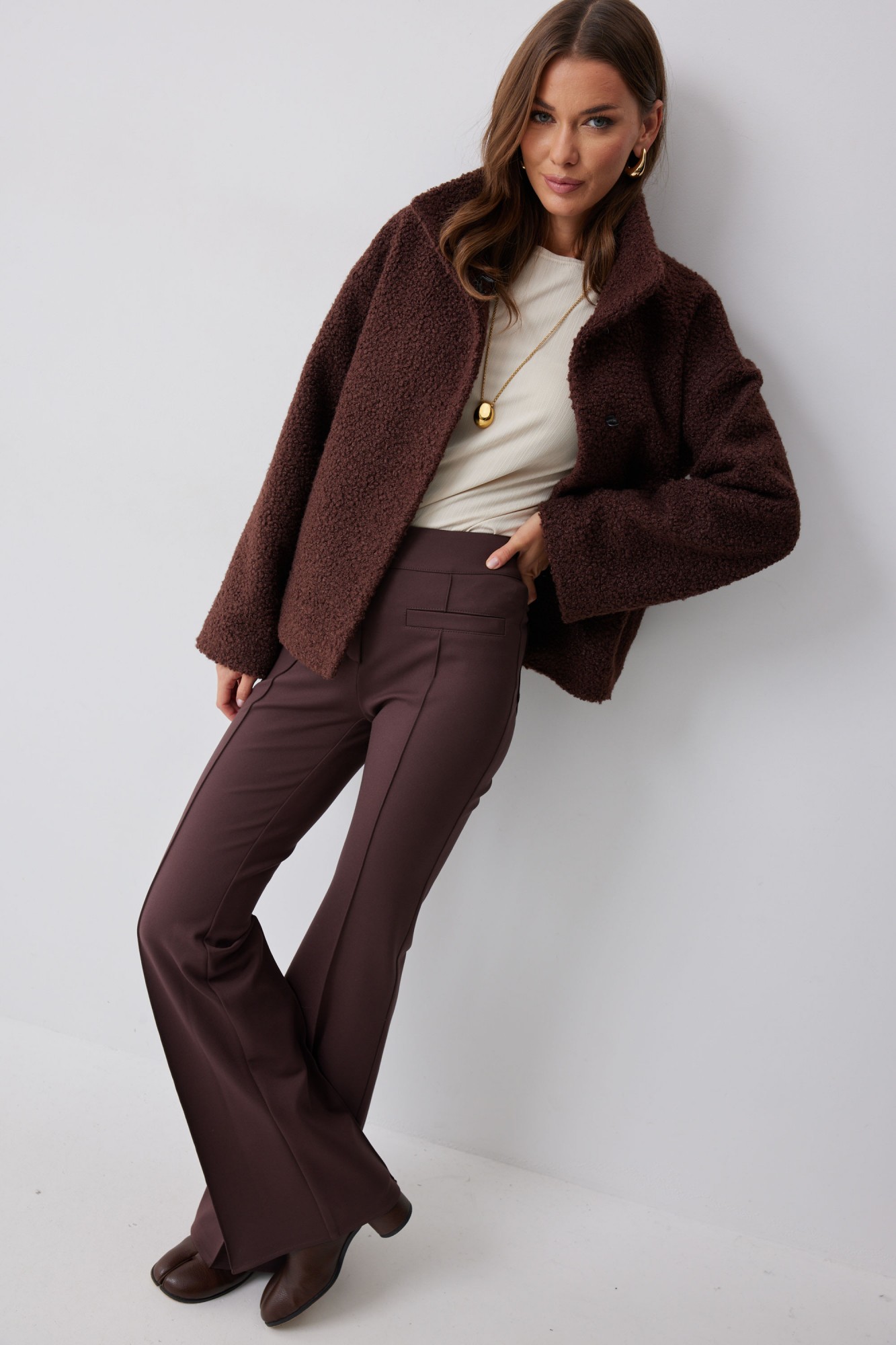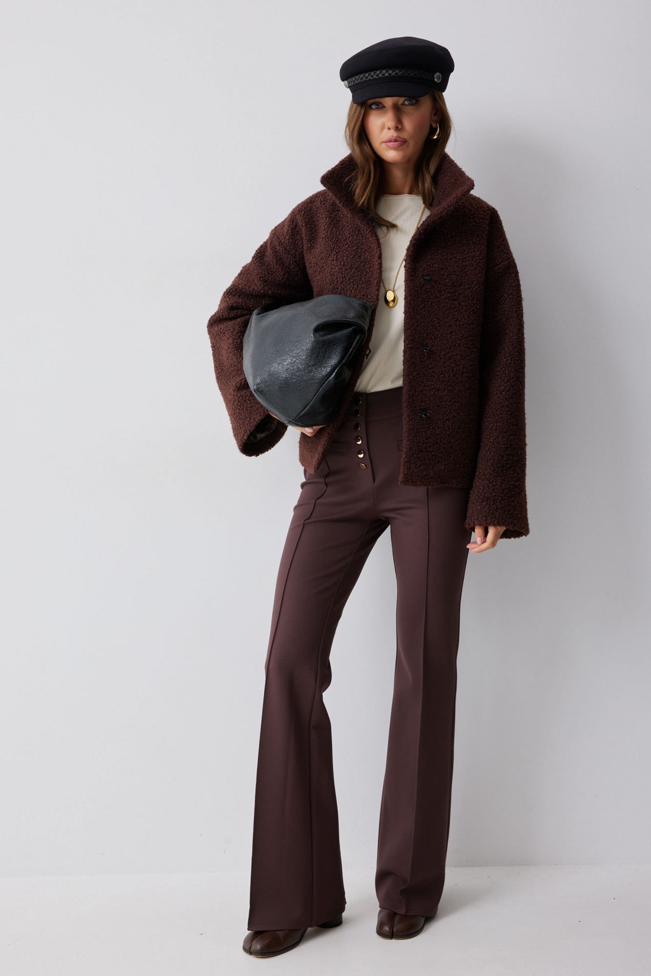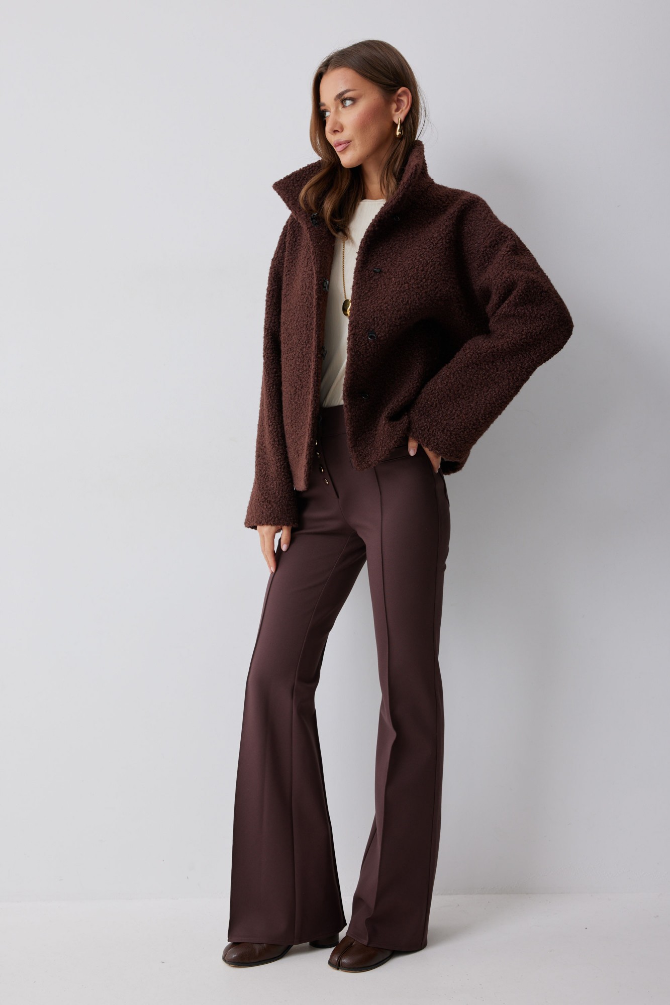 Жакет прямого силуэта из букле на трикотажной основе. Воротник-стойка. Центральная застежка на крючки. Рукав со спущенной линией плеча. По переду прорезные карманы. Жакет на подкладке. Обращаем ваше внимание, что фурнитура может отличаться от фото.
