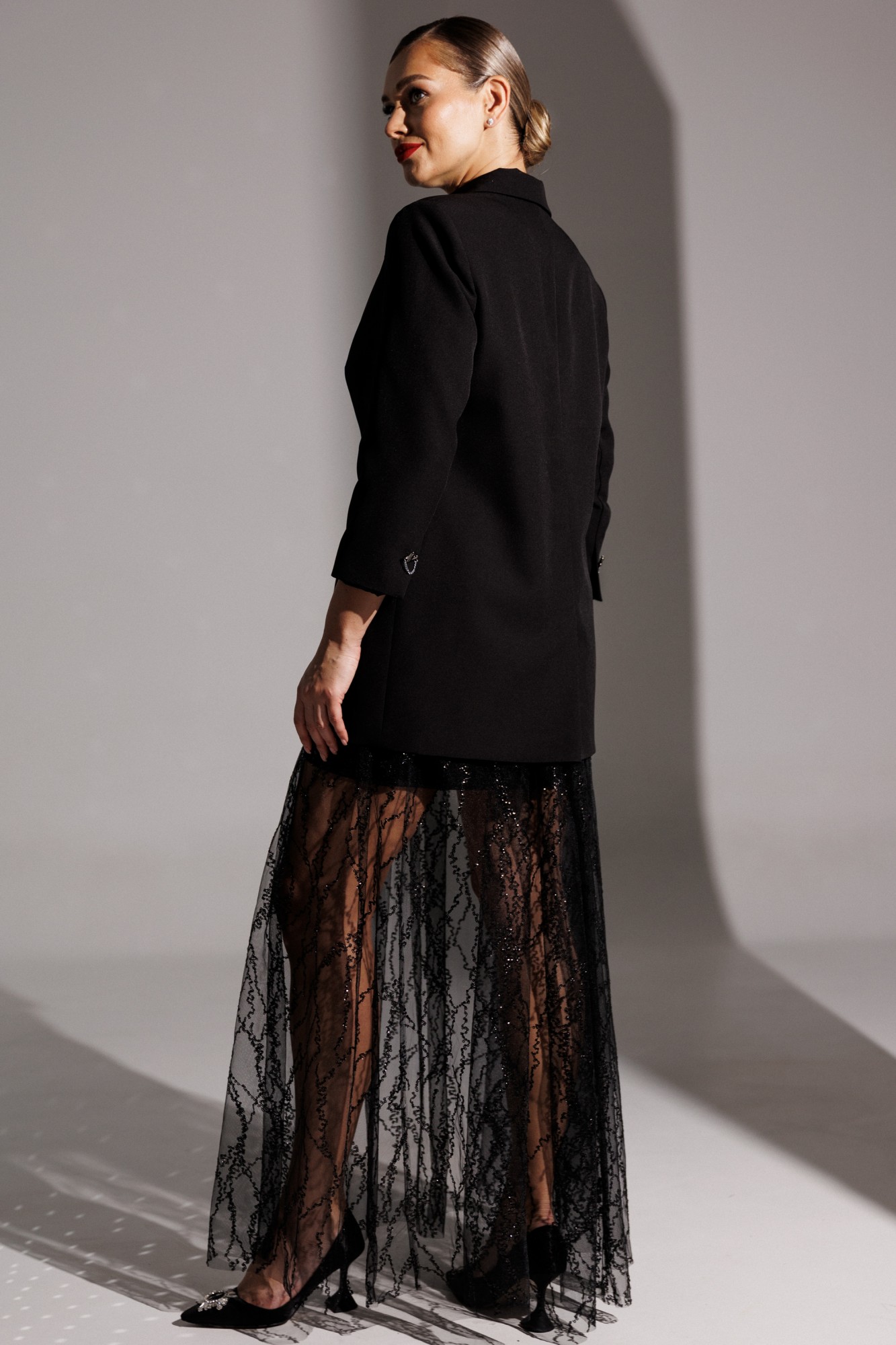 Капсула от Мода-Юрс - Ваша формула смелого праздника. Она создана для особых случаев включает в себя жакет, корсет и юбку, создавая элегантный и стильный образ. Жакет выполнен в классическом стиле с полуприлегающим силуэтом. Он удлиненный, имеет центральную застежку на одну пуговицу и элегантные детали, такие как спинка с средним швом и шпицей, а также перед с таллиевыми вытачками и наклонными карманами с клапанами. Воротник пиджачного типа добавляет строгости, а втачные двухшовные рукава длиной 3/4 со шпицей в локтевом шве и пуговицей придают жакету изысканный вид. Мы собрали все элементы новогодней коллекции в единую капсулу, где каждая вещь - не просто предмет гардероба, а часть большой стилистической головоломки. Собирайте образы как конструктор, меняйтесь в течение вечера и будьте неотразимы в каждой роли!