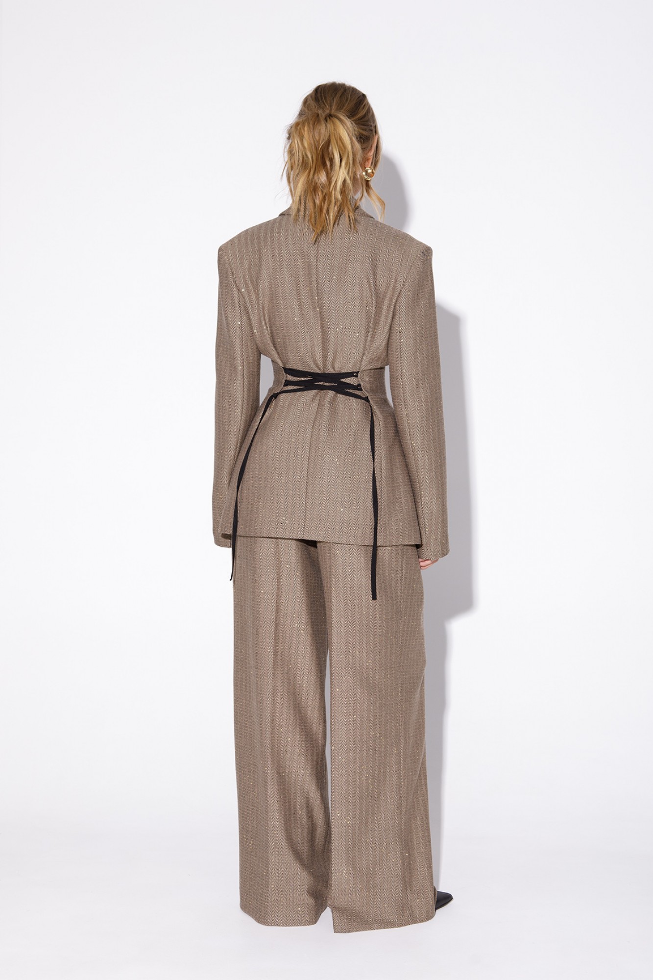 Жакет со шнуровкой из текстильной ткани в пайетки. Детали: жакет полуприлегающего силуэта, расширенные плечи, рельефы, пиджачный воротник, застежка на две петли и пуговицы, функциональные карманы, жакет на подкладке. Жакет также можно зашнуровать по бокам.
