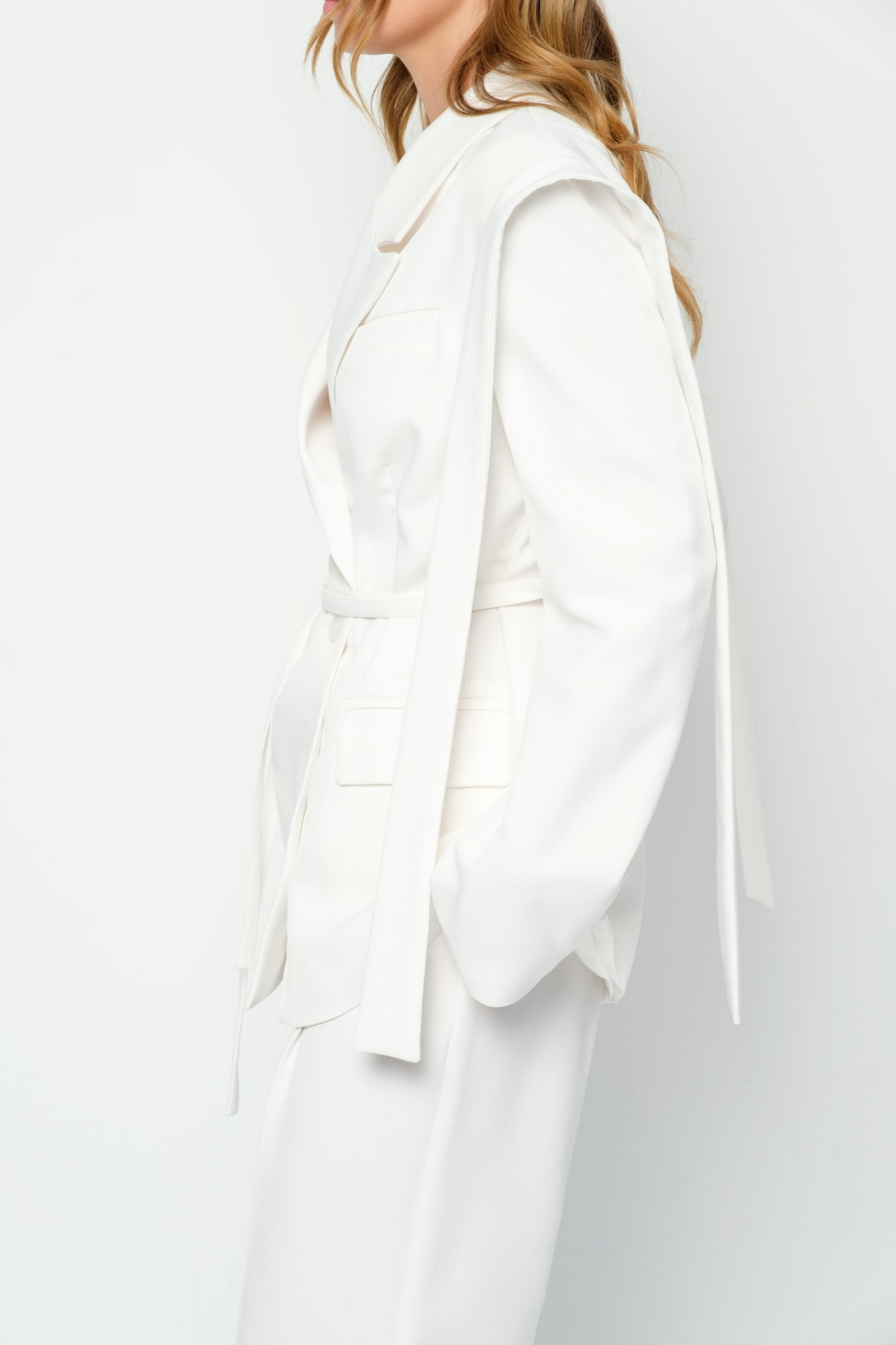 Текстильный свободный жакет с декором. Детали: жакет свободного покроя и полуприлегающего силуэта, двубортная застежка на петли и пуговицы, отрезные бочки, пиджачный воротник, функциональные карманы, съемный пояс. Жакет на подкладке.