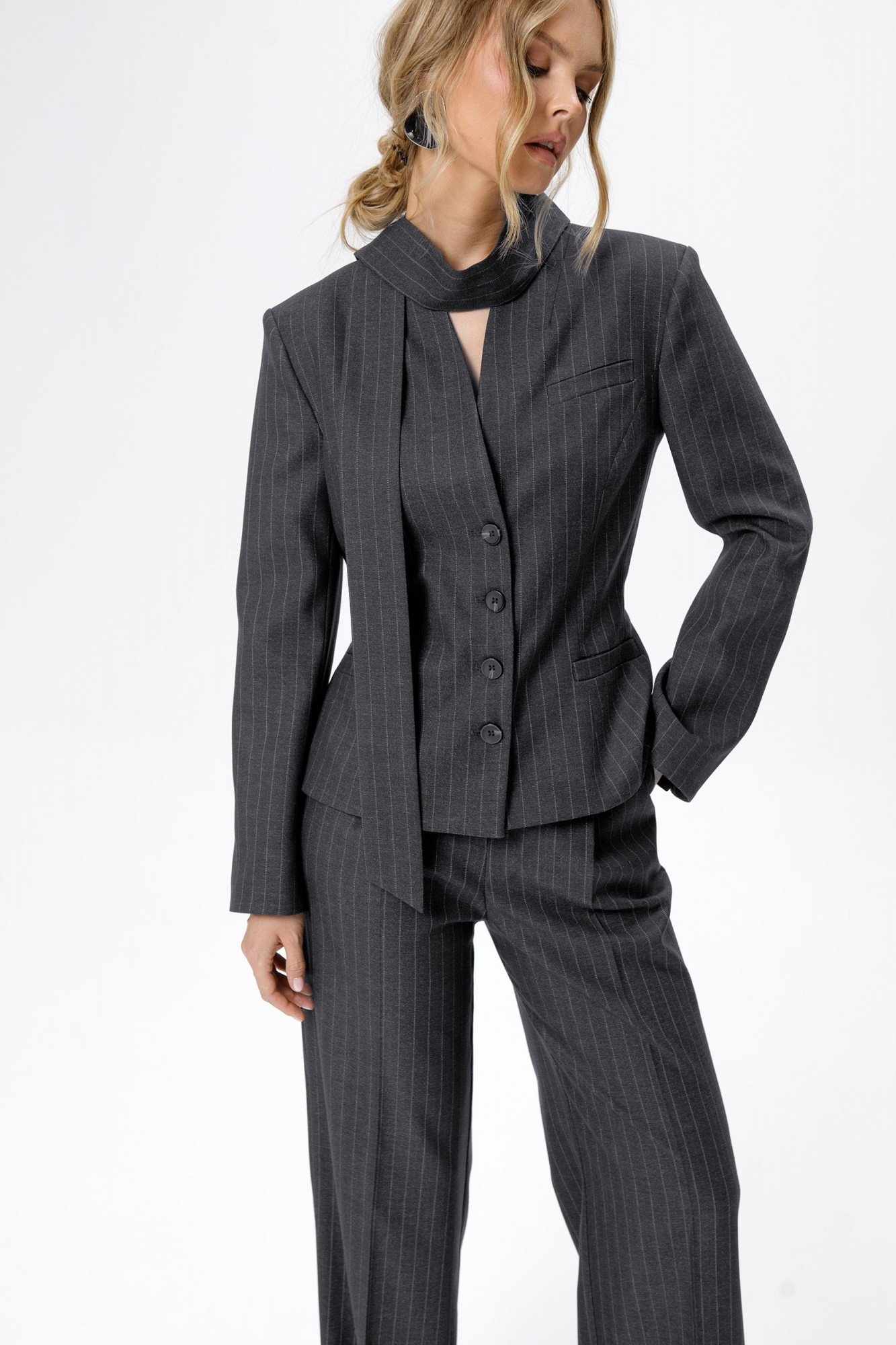 Приталенный жакет со съемным шарфиком. Детали: жакет полуприлегающего силуэта, цельнокроеный воротник-стойка, рельефные швы переда и спинки, функциональные карманы, застежка на петли и пуговицы, на подкладке. В комплекте съемный шарфик.