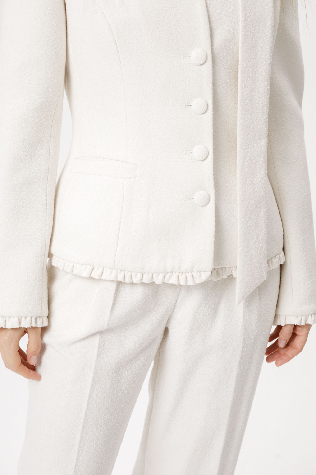 Приталенный жакет со съемным шарфиком из фактурной ткани «букле». Детали: жакет полуприлегающего силуэта, цельнокроеный воротник-стойка, рельефные швы переда и спинки, функциональные карманы, застежка на петли и пуговицы, на подкладке. В комплекте съемный шарфик.