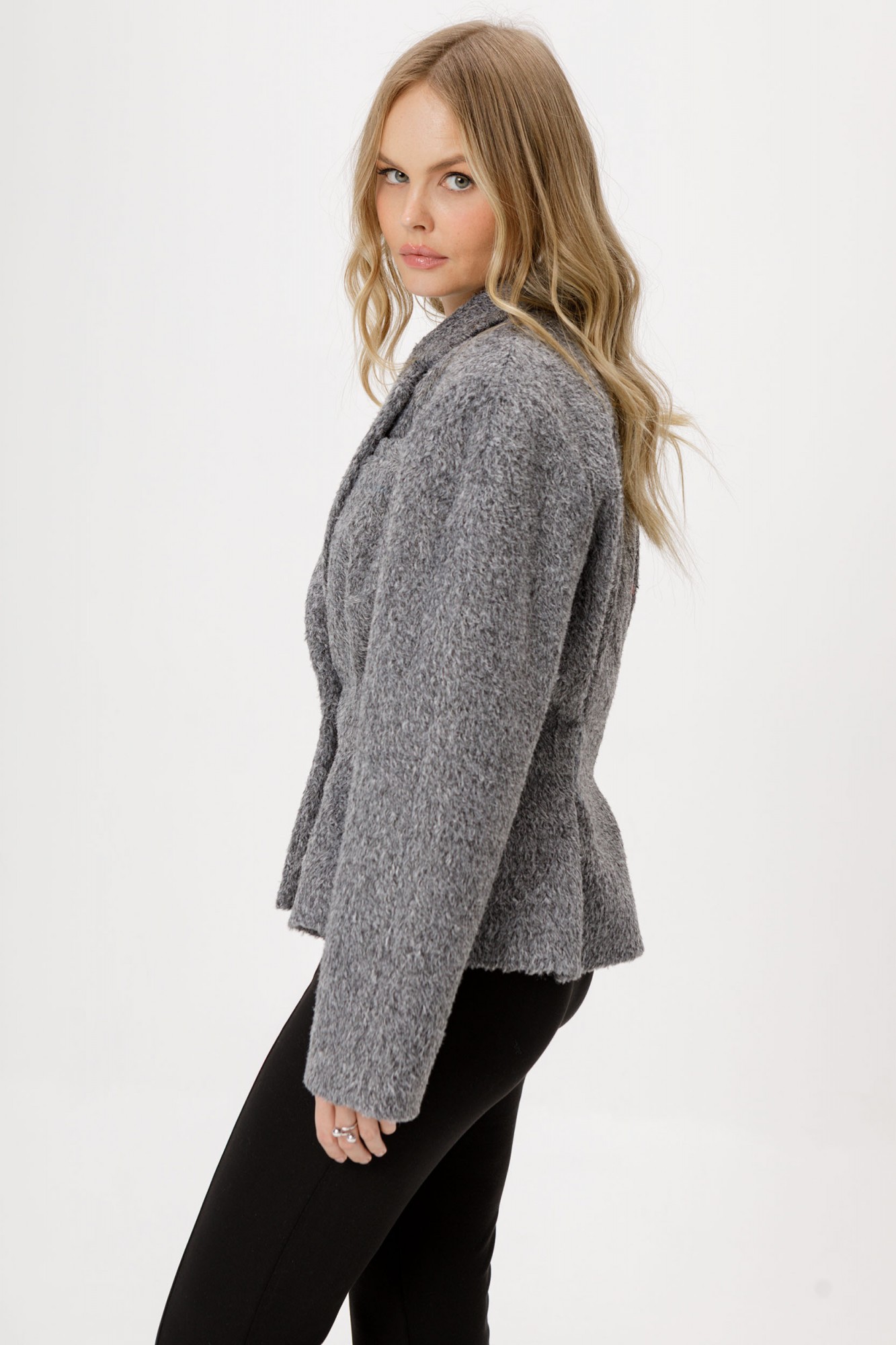 Приталенный жакет о-образного силуэта из утепленной фактурной ткани. Детали: полуприлегающий силуэт, пиджачный воротник, застежка на петлю и пуговицу, жакет на подкладке