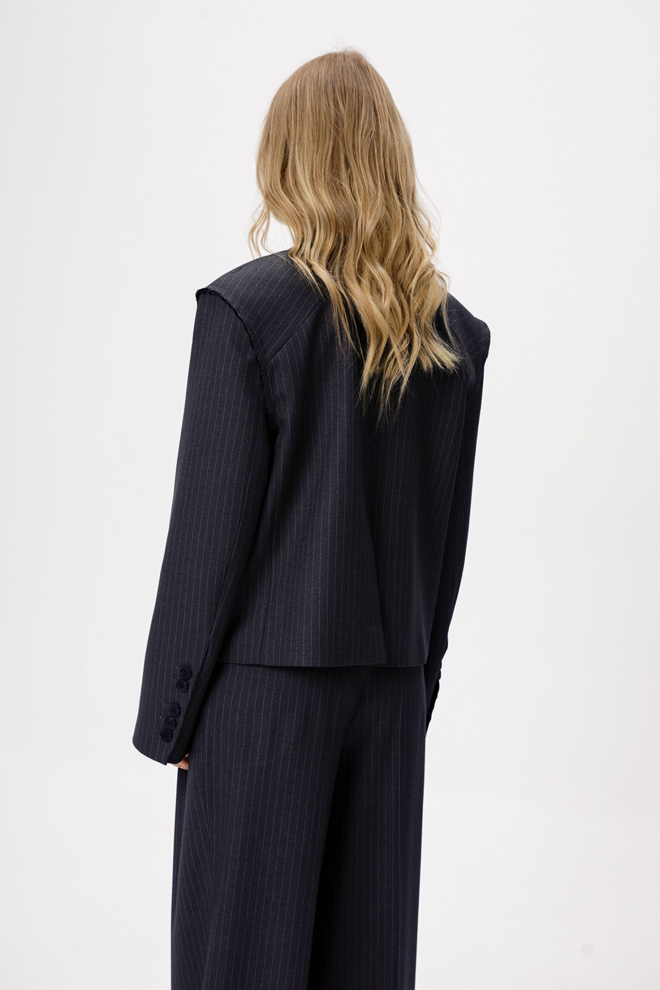 Укороченный оверсайз жакет в полоску с необработанными проймами. Детали: жакет прямого силуэта, пиджачный воротник, двубортная застежка на две петли и пуговицы, функциональные карманы, спинка с фигурной кокеткой, рукава втачные, жакет на подкладке.