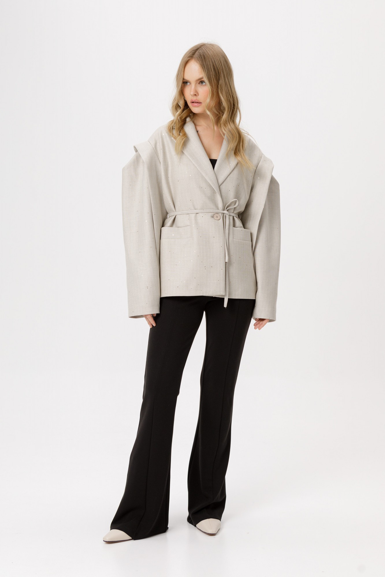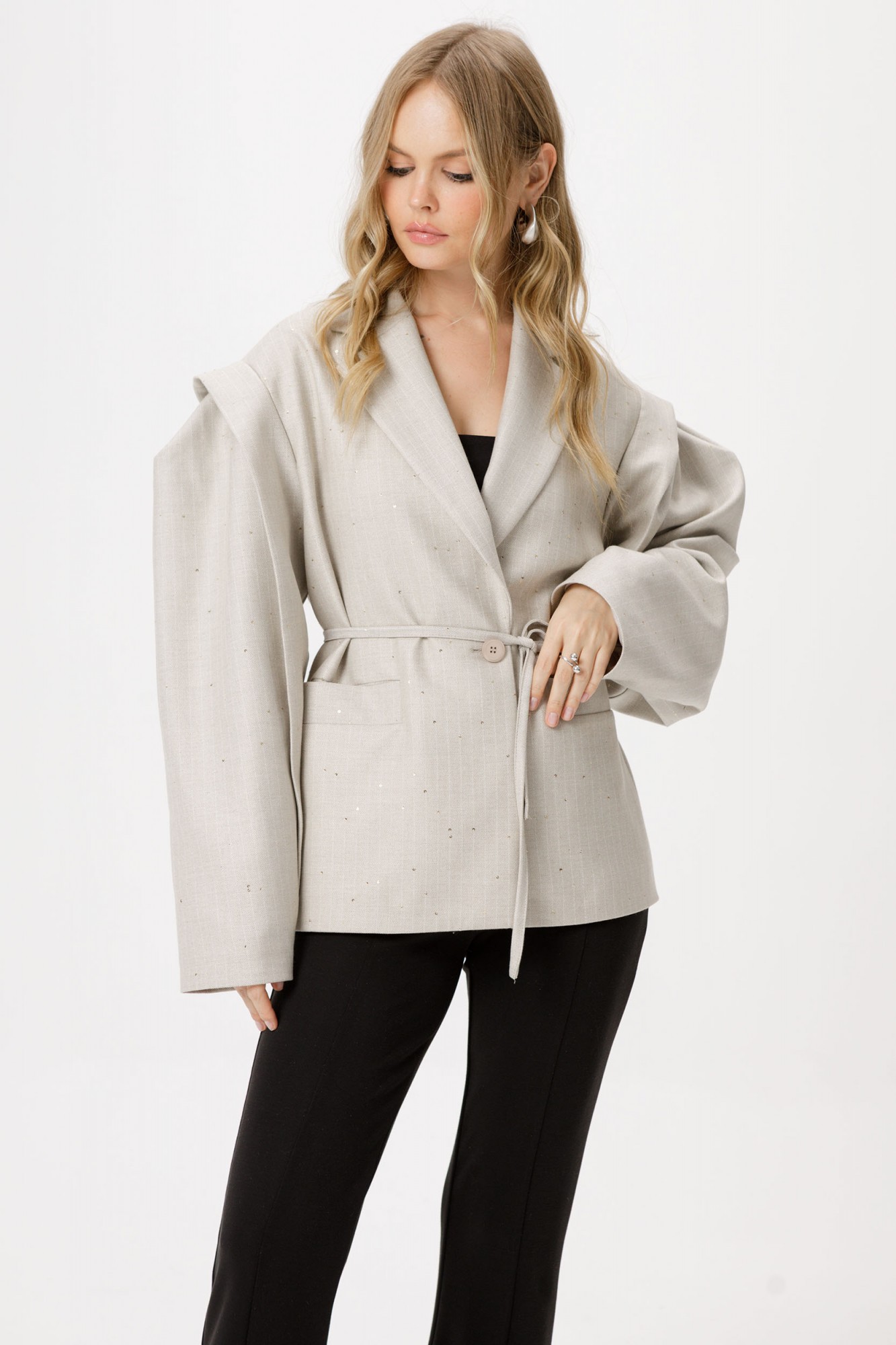 Оверсайз жакет со съёмным поясом. Детали: прямой силуэт, удлинённая линия плеча, втачной одношовный рукав с ассиметричными складками, функциональные карманы, центральная застёжка на 1 пуговицу, жакет на подкладке.
