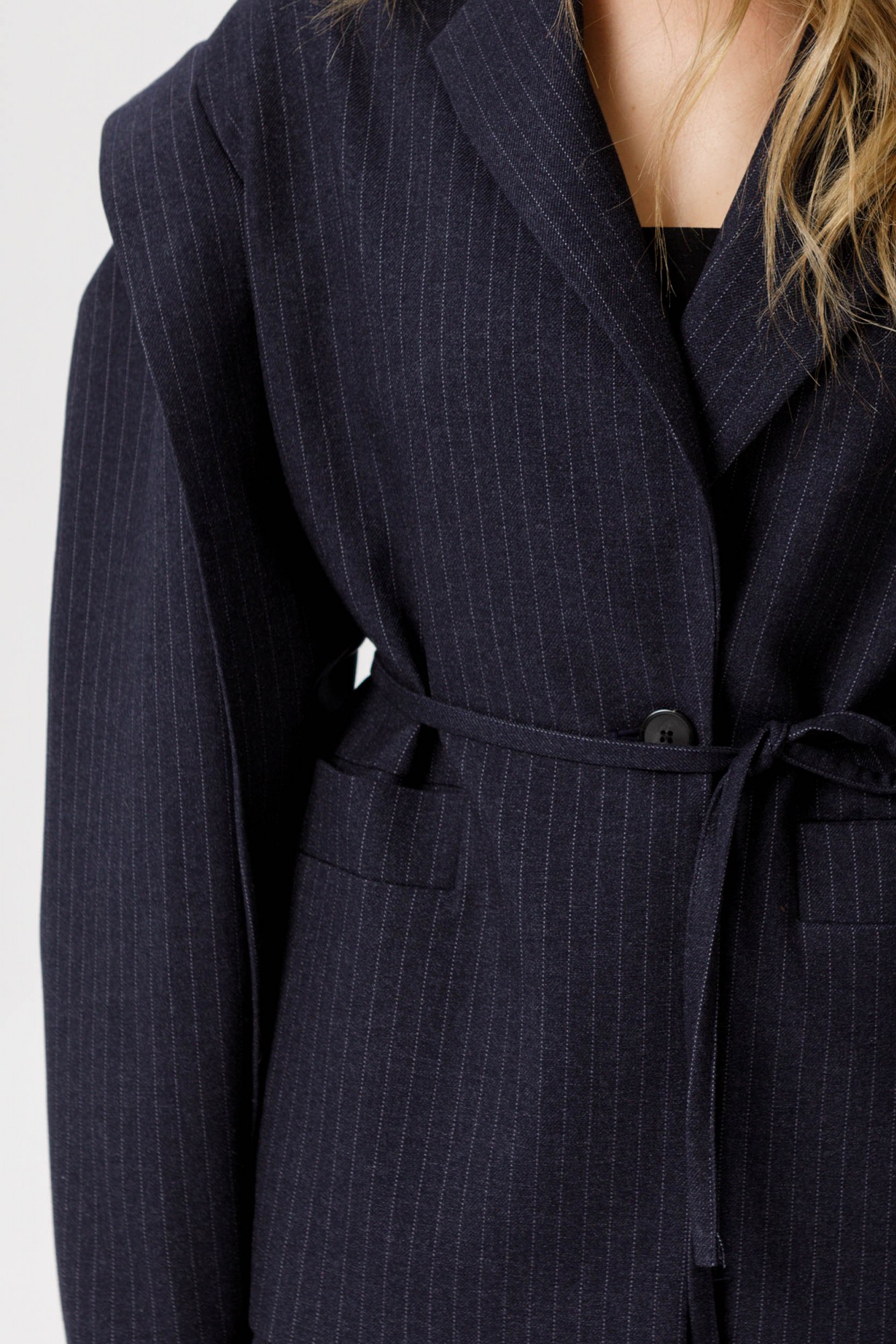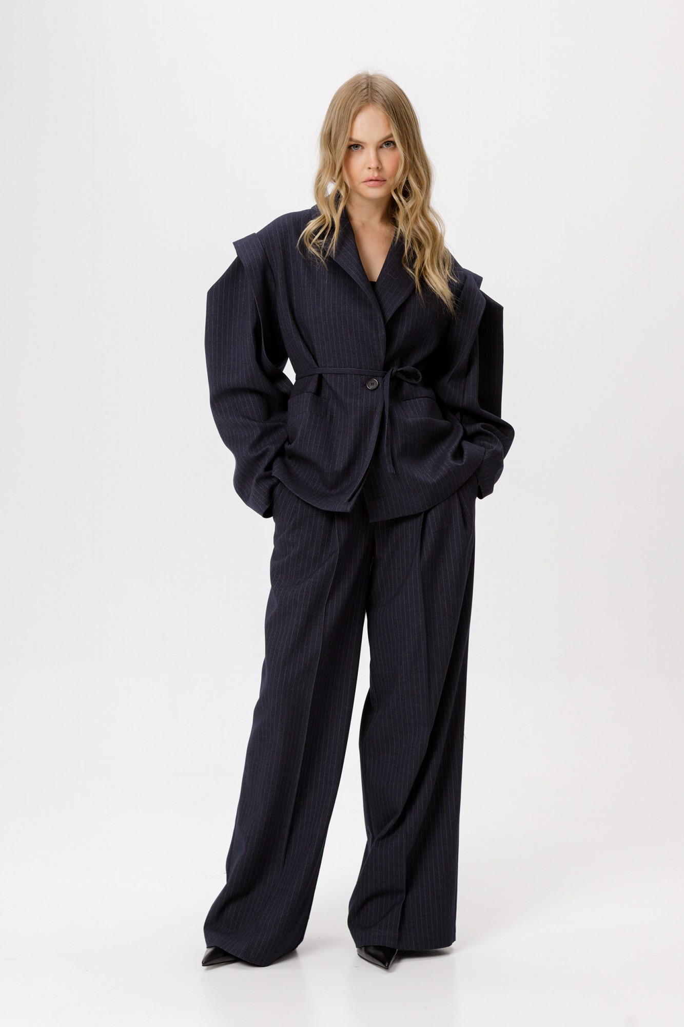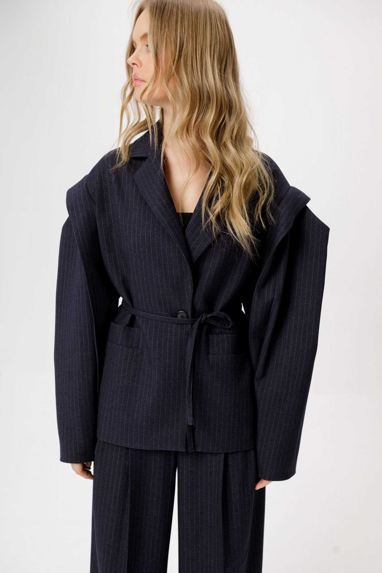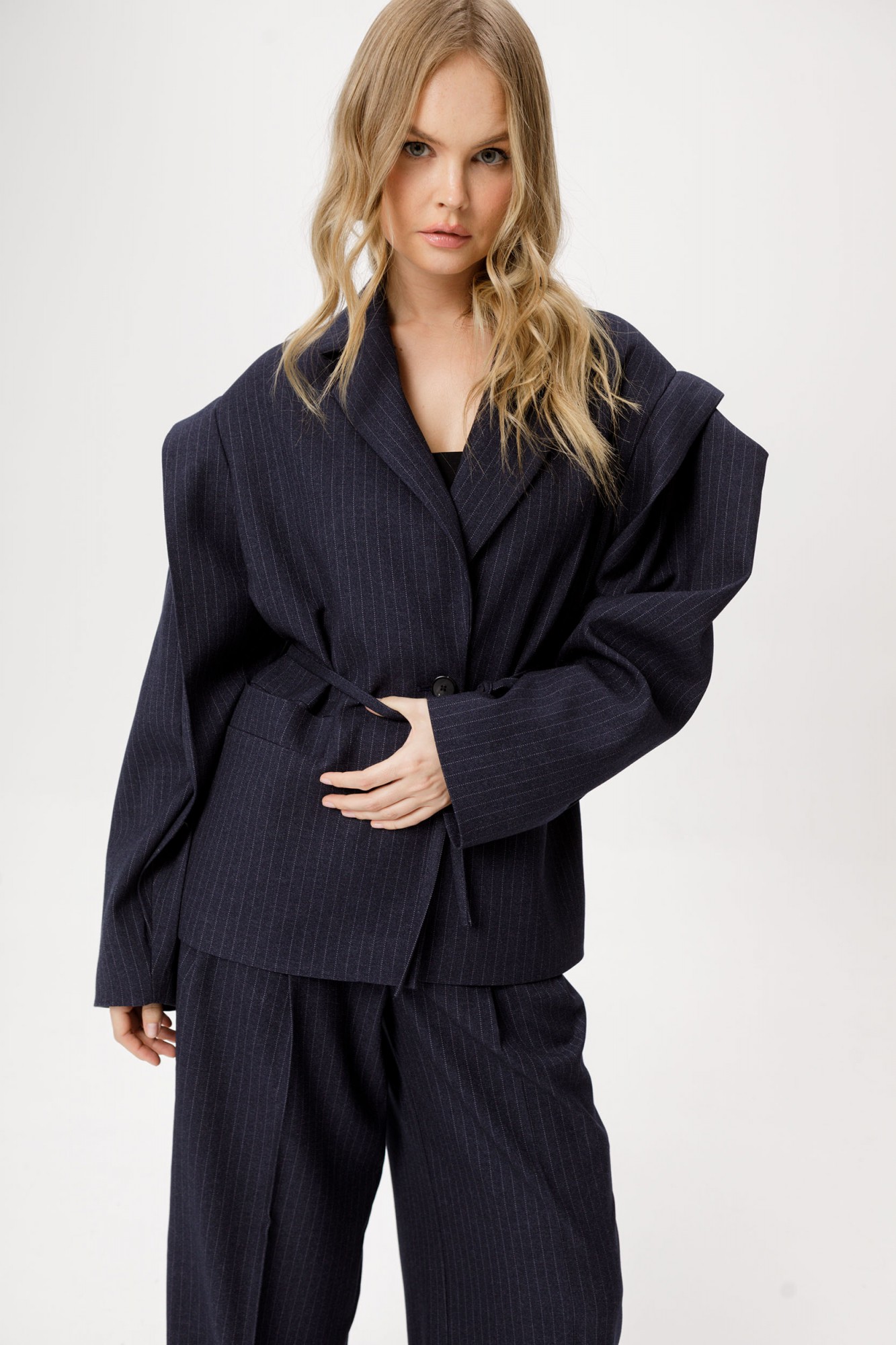 Оверсайз жакет со съёмным поясом. Детали: прямой силуэт, удлинённая линия плеча, втачной одношовный рукав с ассиметричными складками, функциональные карманы, центральная застёжка на 1 пуговицу, жакет на подкладке.