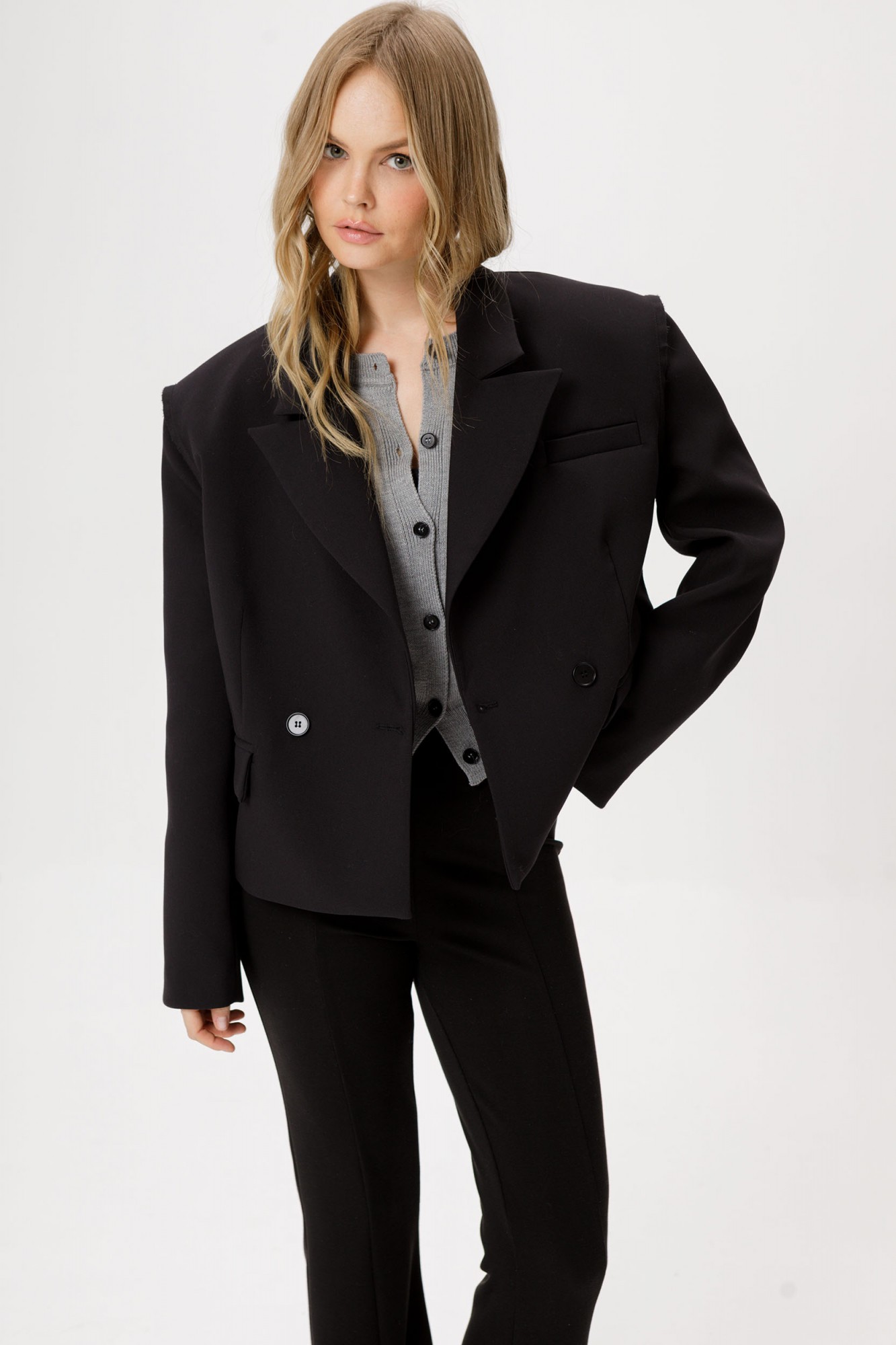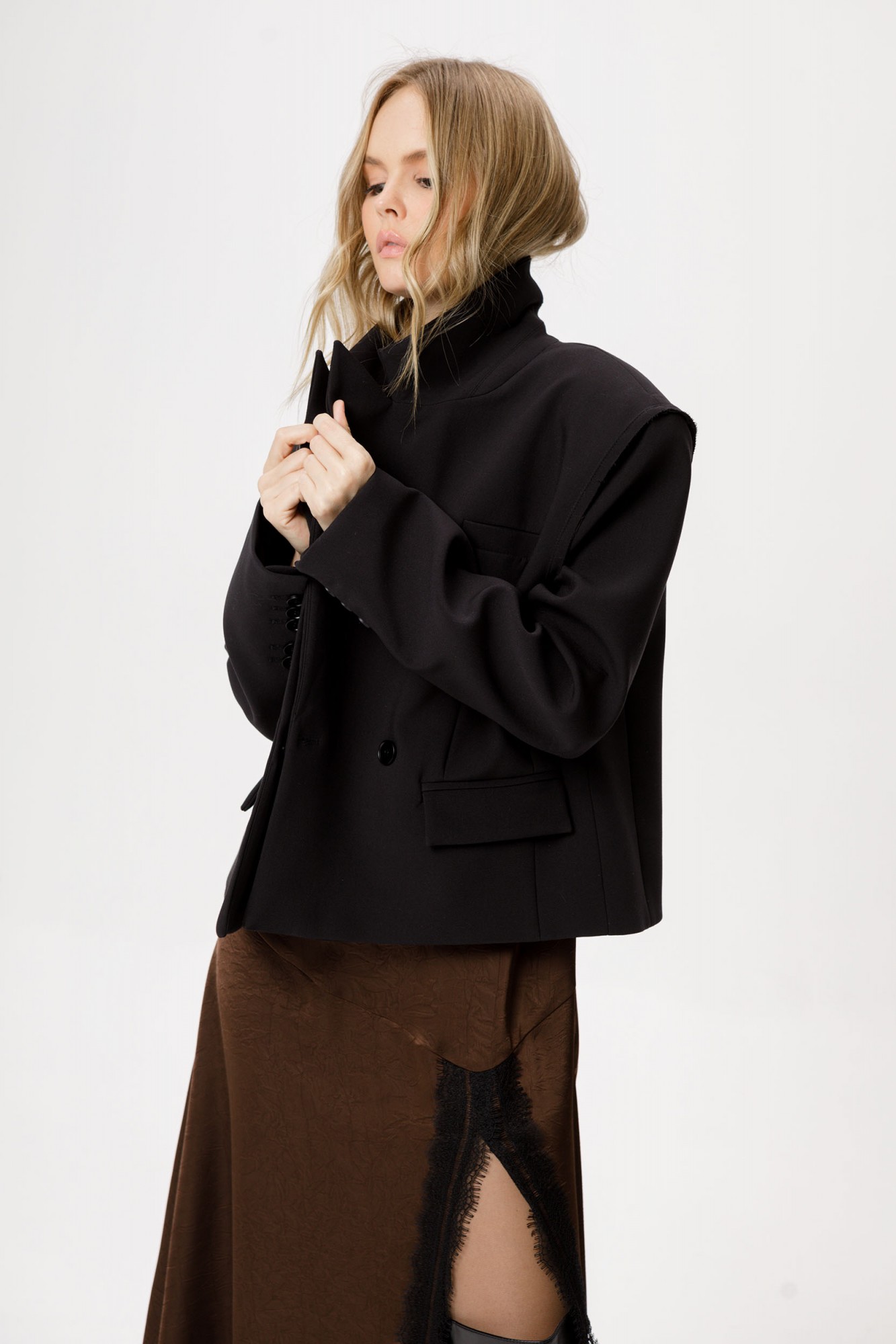 Укороченный оверсайз жакет с необработанными проймами. Детали: жакет прямого силуэта, пиджачный воротник, двубортная застежка на две петли и пуговицы, функциональные карманы, спинка с фигурной кокеткой, рукава втачные, жакет на подкладке.