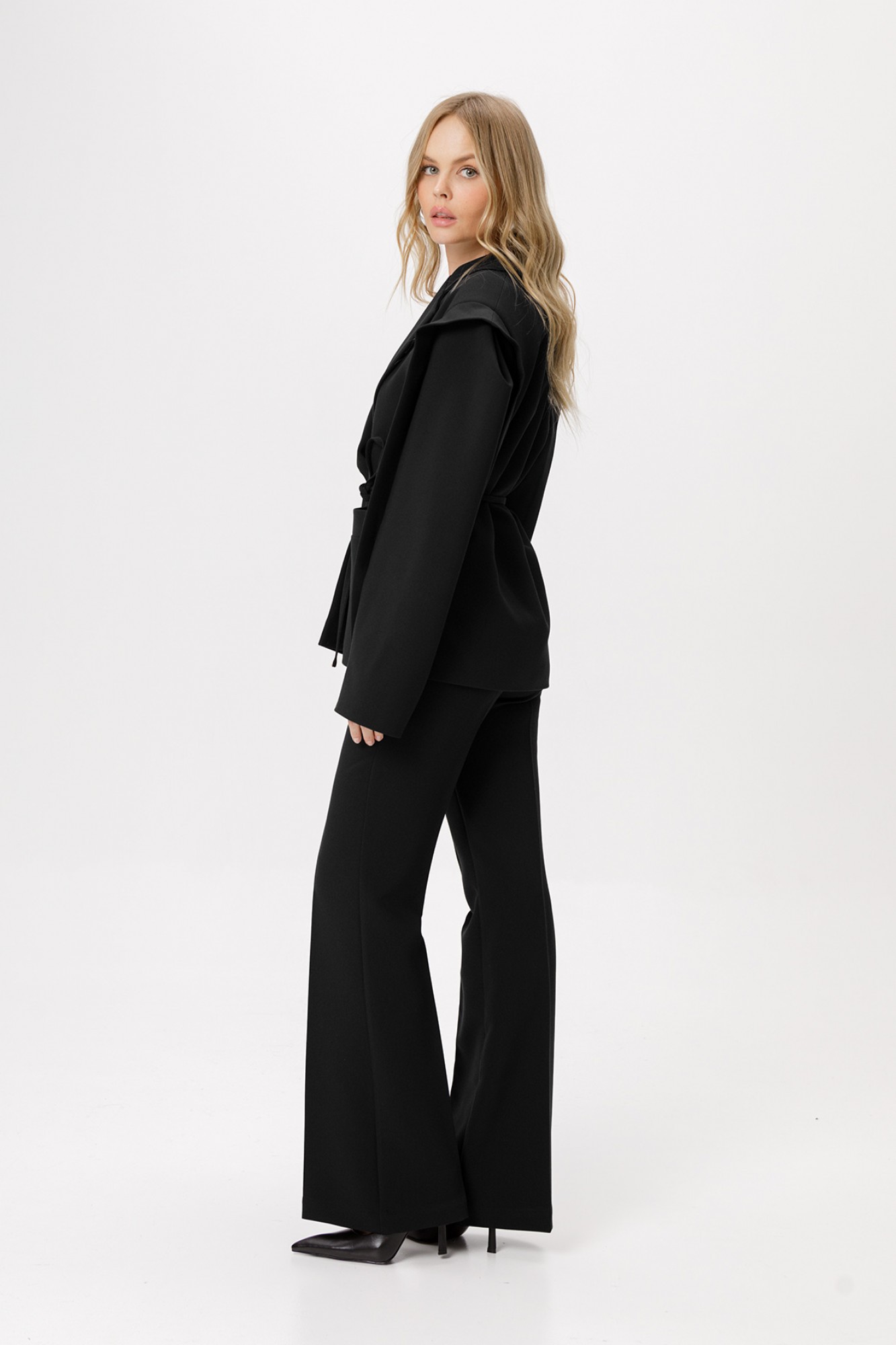 Оверсайз жакет со съёмным поясом. Детали: прямой силуэт, удлинённая линия плеча, втачной одношовный рукав с ассиметричными складками, функциональные карманы, центральная застёжка на петлю и пуговицу, жакет на подкладке.