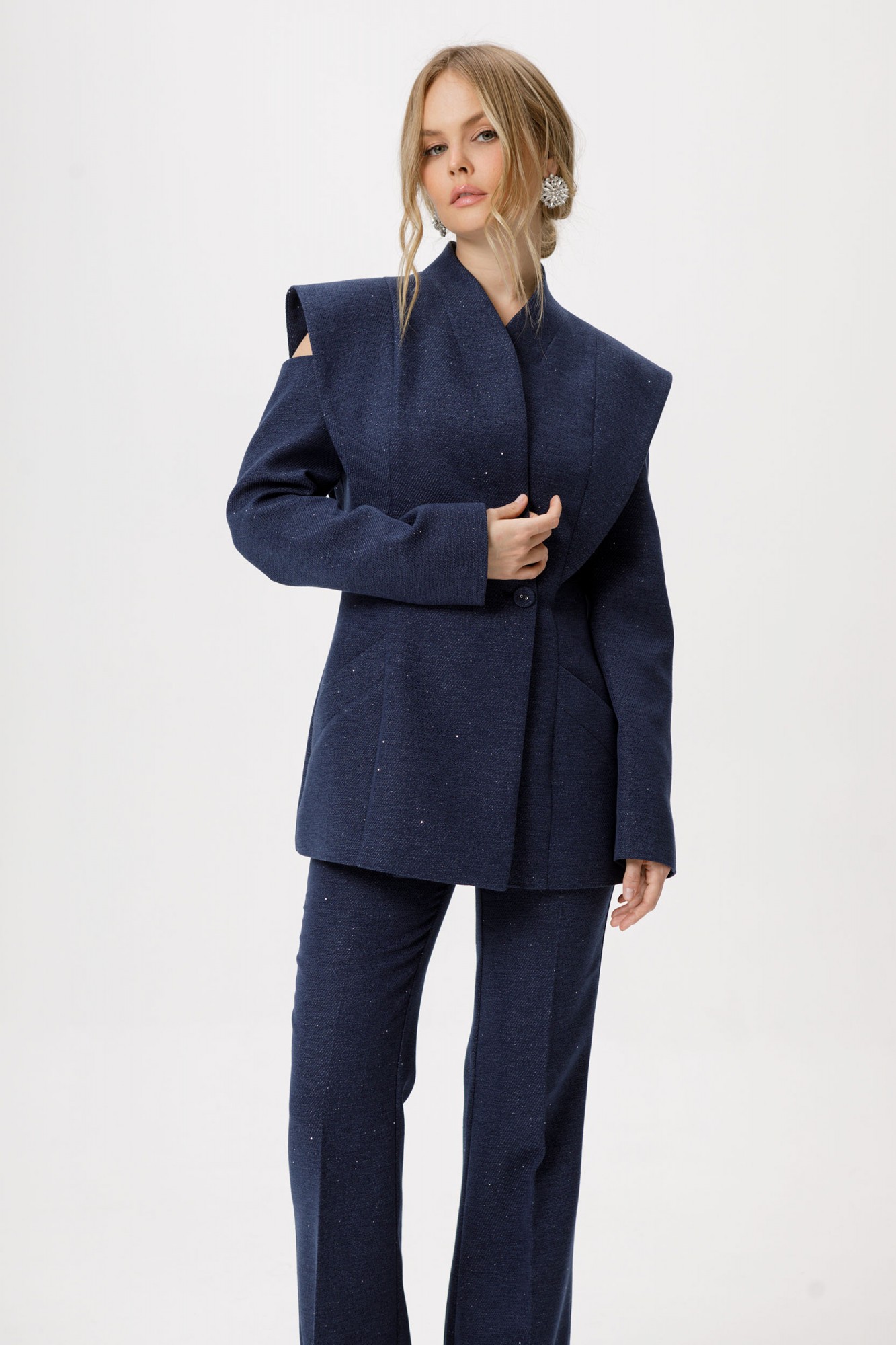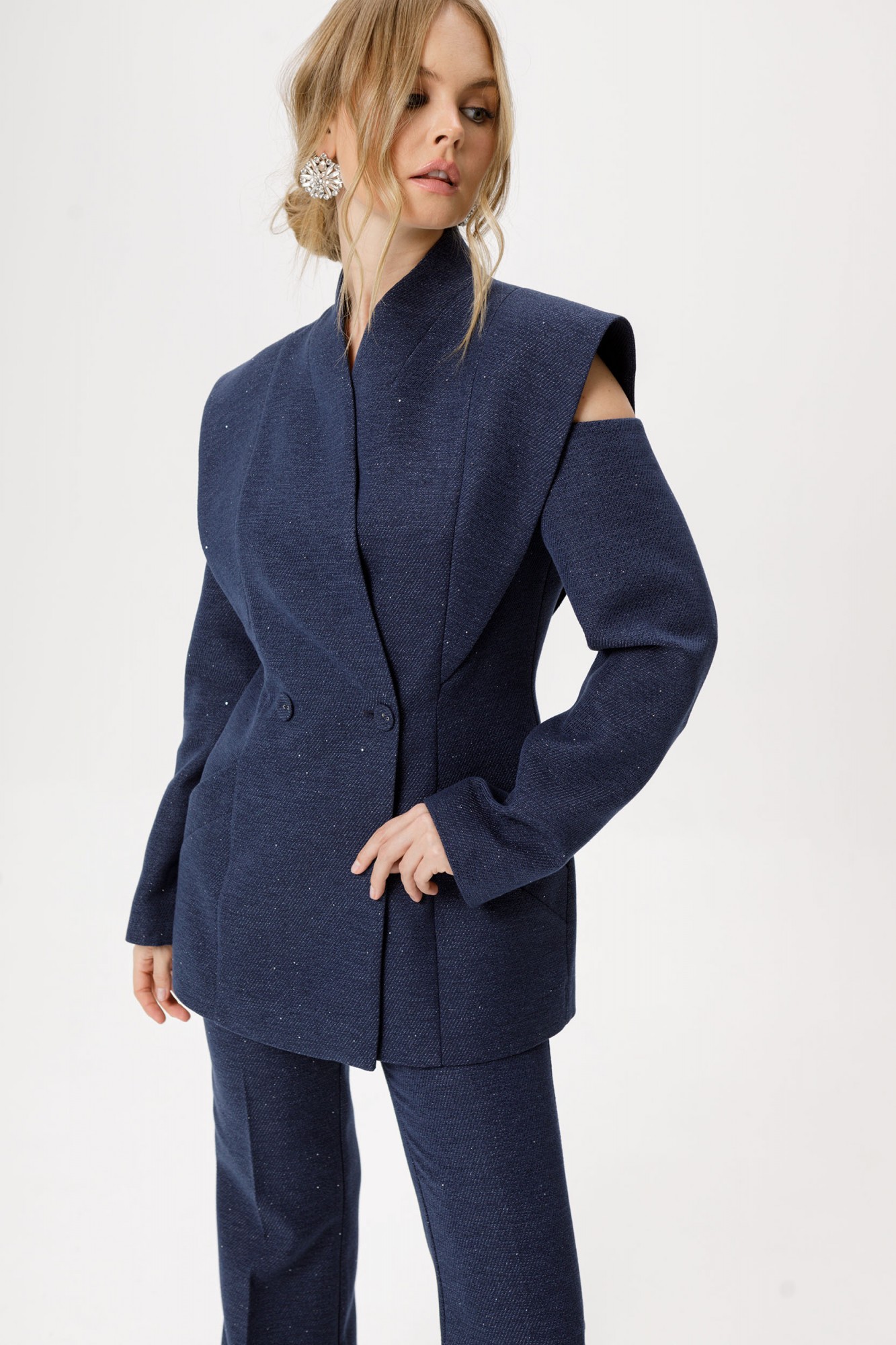 Приталенный двубортный жакет. Детали: полуприлегающий силуэт, цельнокроеный воротник-стойка, двубортная застёжка на петли и пуговицы, рельефные швы переда и спинки с декоративным элементом, рукава длинные с вырезами по верху, функциональные карманы, жакет на подкладке.