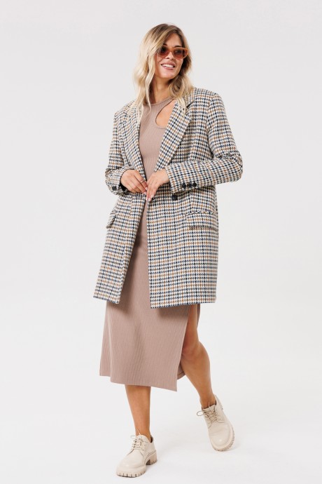 Жакет женский на подкладке из текстильной ткани, двубортный, оверсайз. По переду расположены таллиевые вытачки с прорезными карманами с клапаном. Спинка со средним швом и шлицей. Рукав двухшовный со шлицей на петлях-пуговицах. Застежка жакета двубортная на петлях-пуговицах. Вырез горловины оформлен воротником с лацканами.