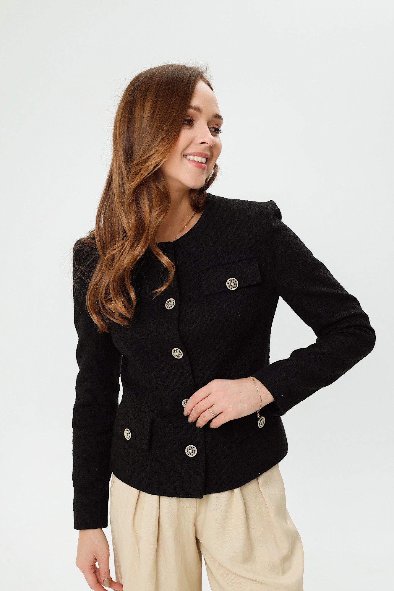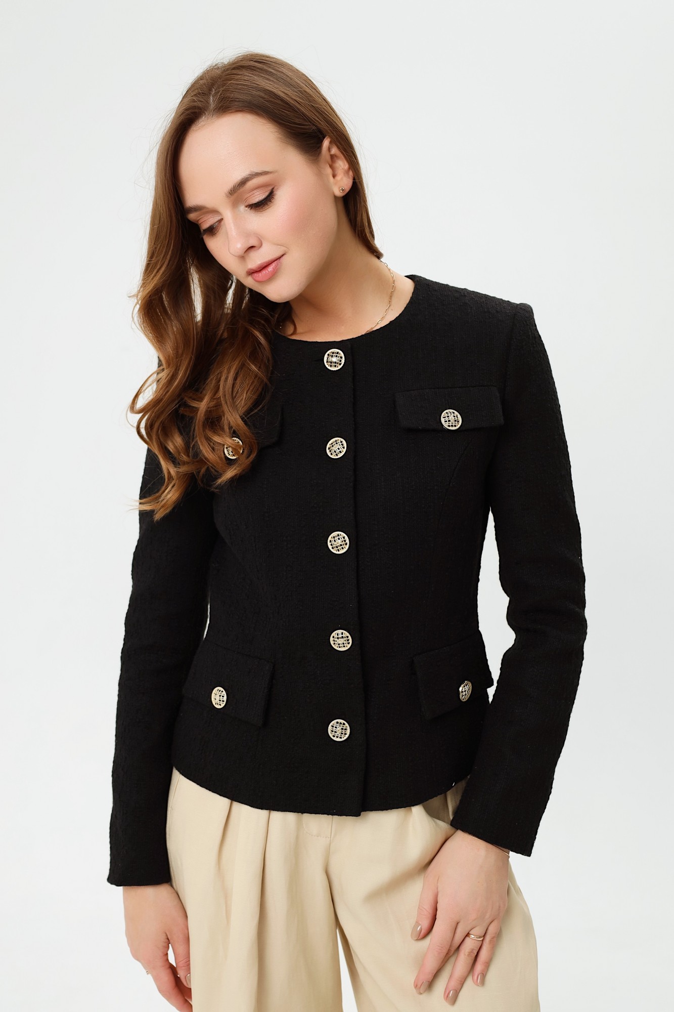 Жакет полуприлегающего силуэта, застегивается на пуговицы спереди, с действующими карманами, на подкладке.