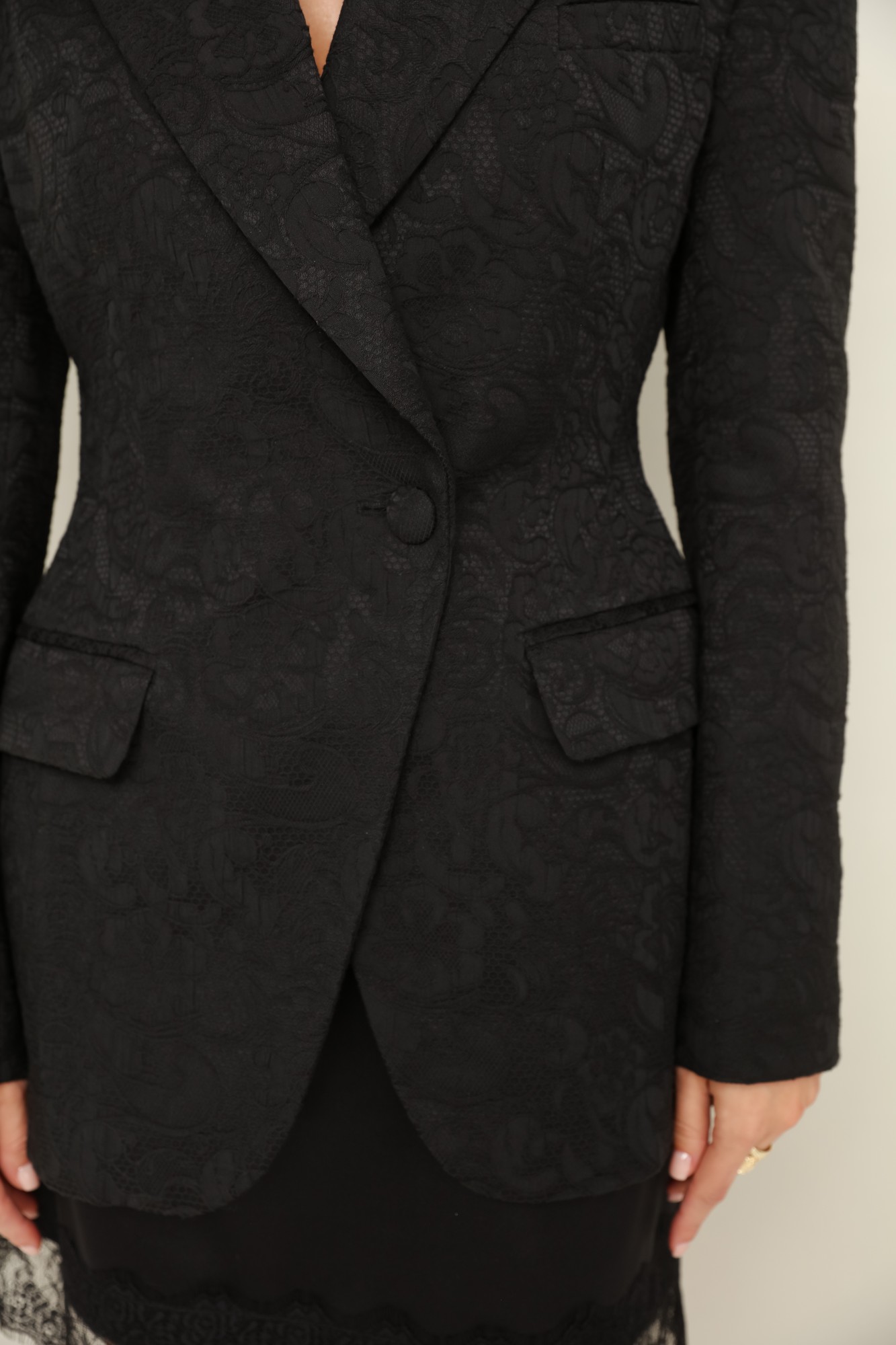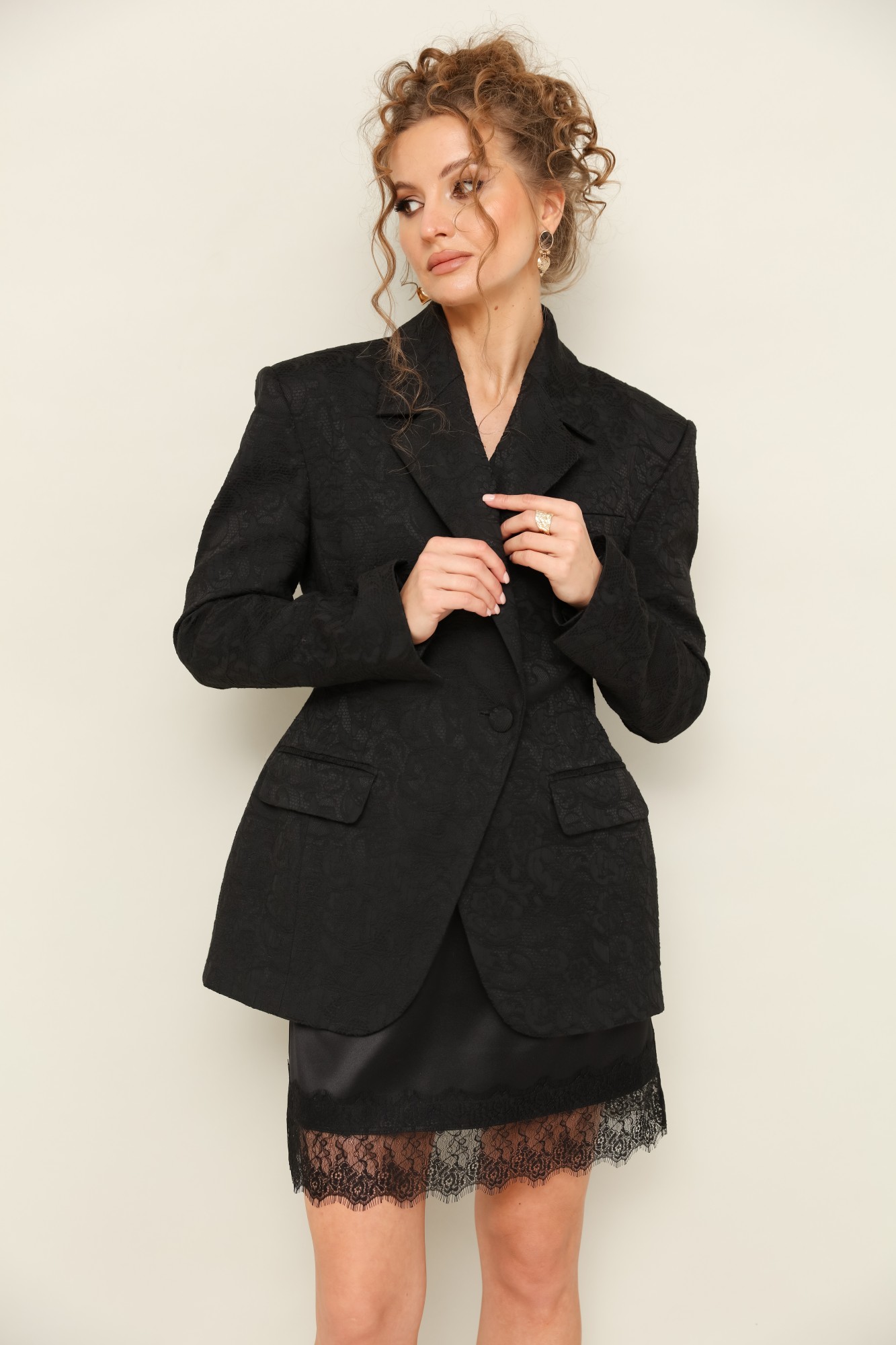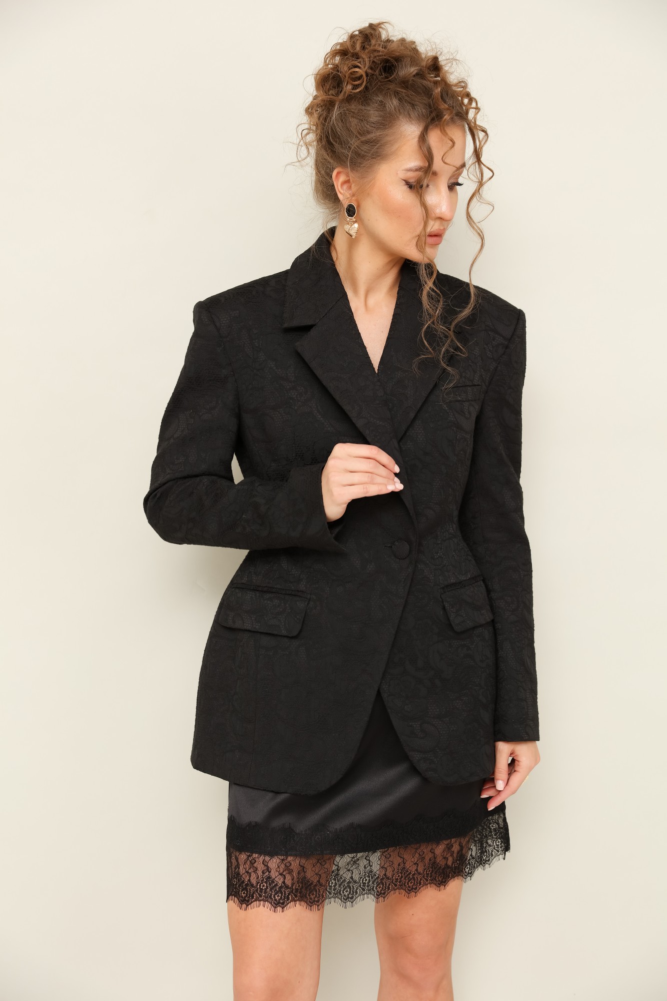 Силуэтный жакет с подчеркнутой линией талии. Смещенная застежка на петлю и пуговицу. Воротник пиджачного типа с отложными лацканами, край борта скругленный по низу жакета. Спереди обработаны прорезные карманы в рамку с клапанами и нагрудный прорезной карман с листочкой. Рукава втачные, двухшовные с отлетнымм шлицами. Спинка с рельефами и средним швом, переходящим в шлицу. Изделие на подкладке.