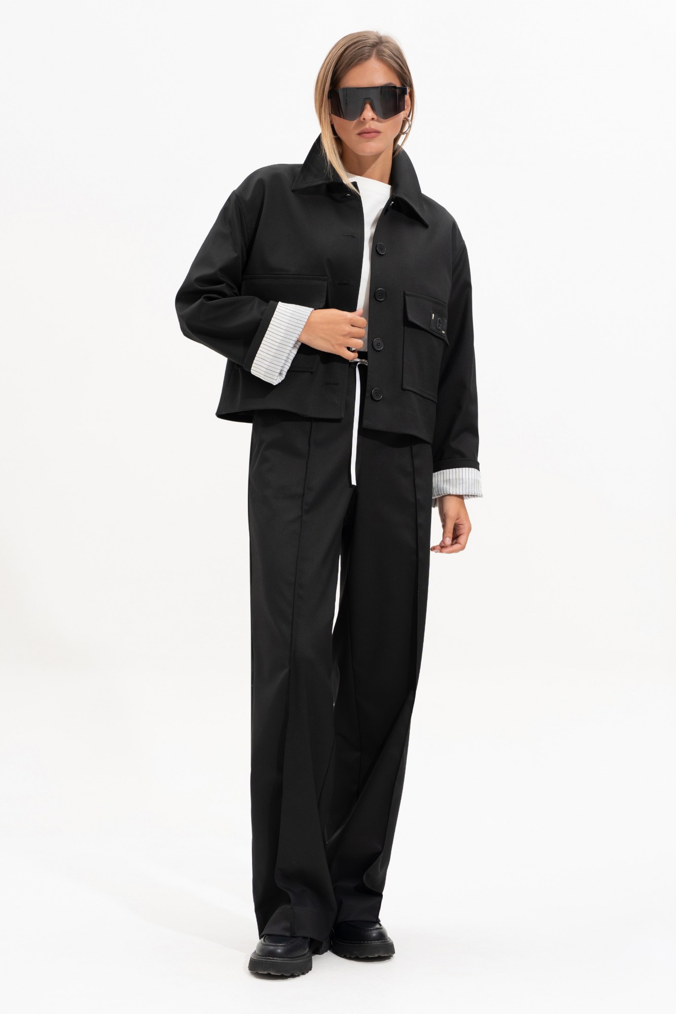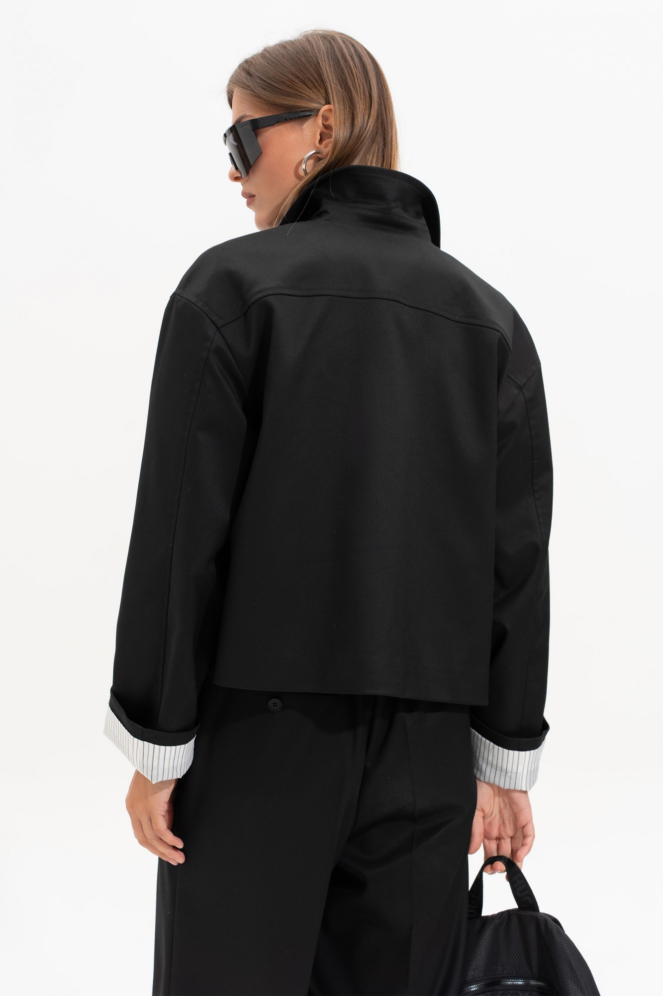 Стильный жакет прямого кроя, на поливискозной подкладке, подкладка рукава контрастного цвета - молочная в полоску. Линия плеча слегка спущена, рукав прямой, двухшовный. Воротник стояче-отложной с отрезной стойкой, по переду функциональные накладные карманы с клапанами (на левом клапане настрочена декоративная бирка). Спинка с отрезной кокеткой. Жакет - главный модный бестселлер: станет прекрасным дополнением как для офисного образа, так и для casual-стиля.